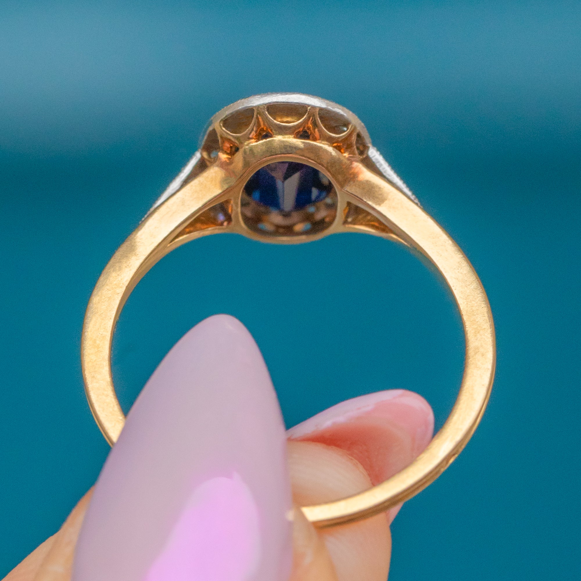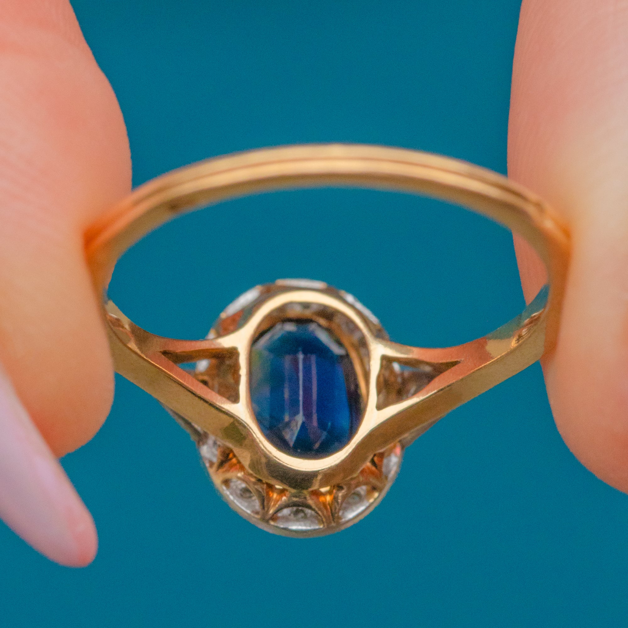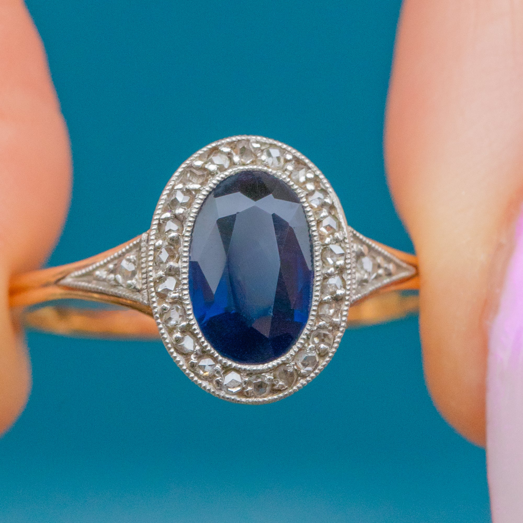French Art Deco 18ct Sapphire Cluster Diamond Ring, 1.50ct Sapphire