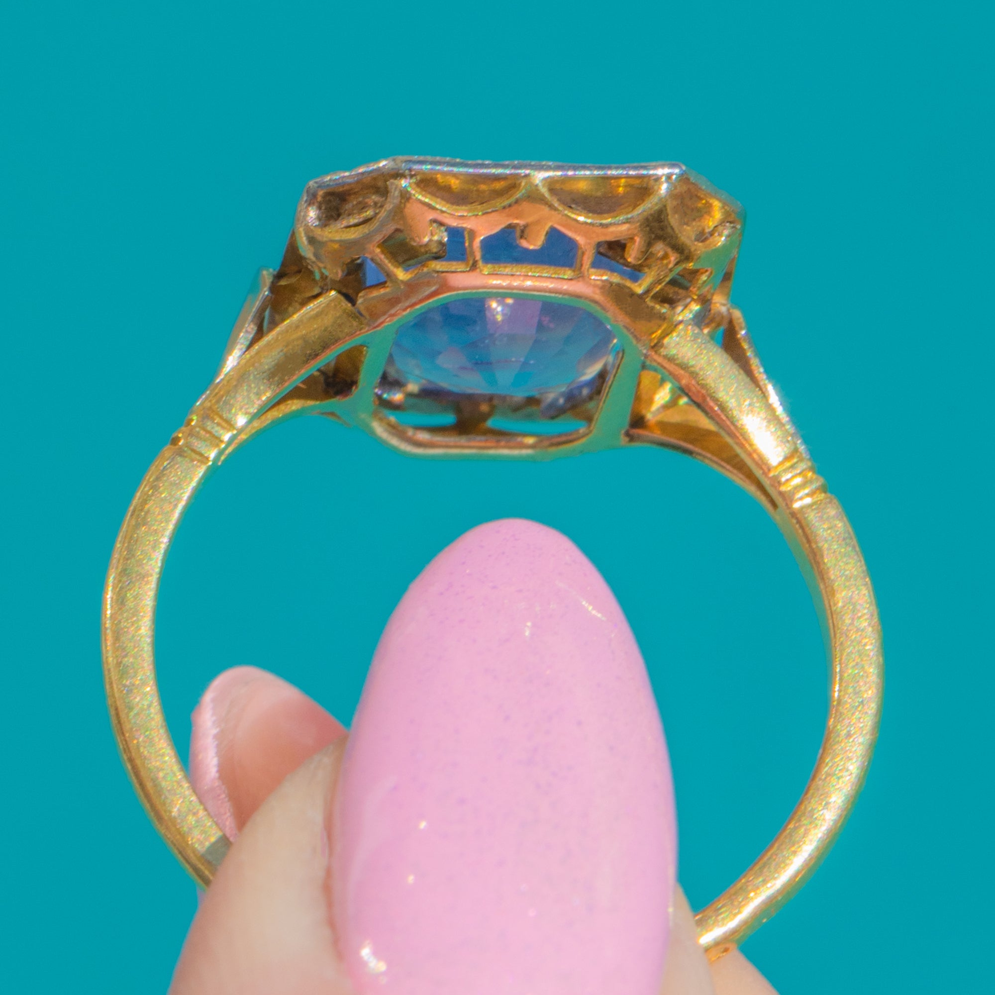 A glorious French Art Deco ring, alive with crisp geometry and a luminous cornflower hue. At its heart glows an approximately 2.70ct Natural no heat Sapphire, antique faceted and set within a Platinum-topped rectangular cluster traced with fine milgrain. Small Diamond accents add a delicate sparkle to the frame, while an elegant openwork gallery lifts the stone to the light, all poised upon a warm 18ct Gold shank.