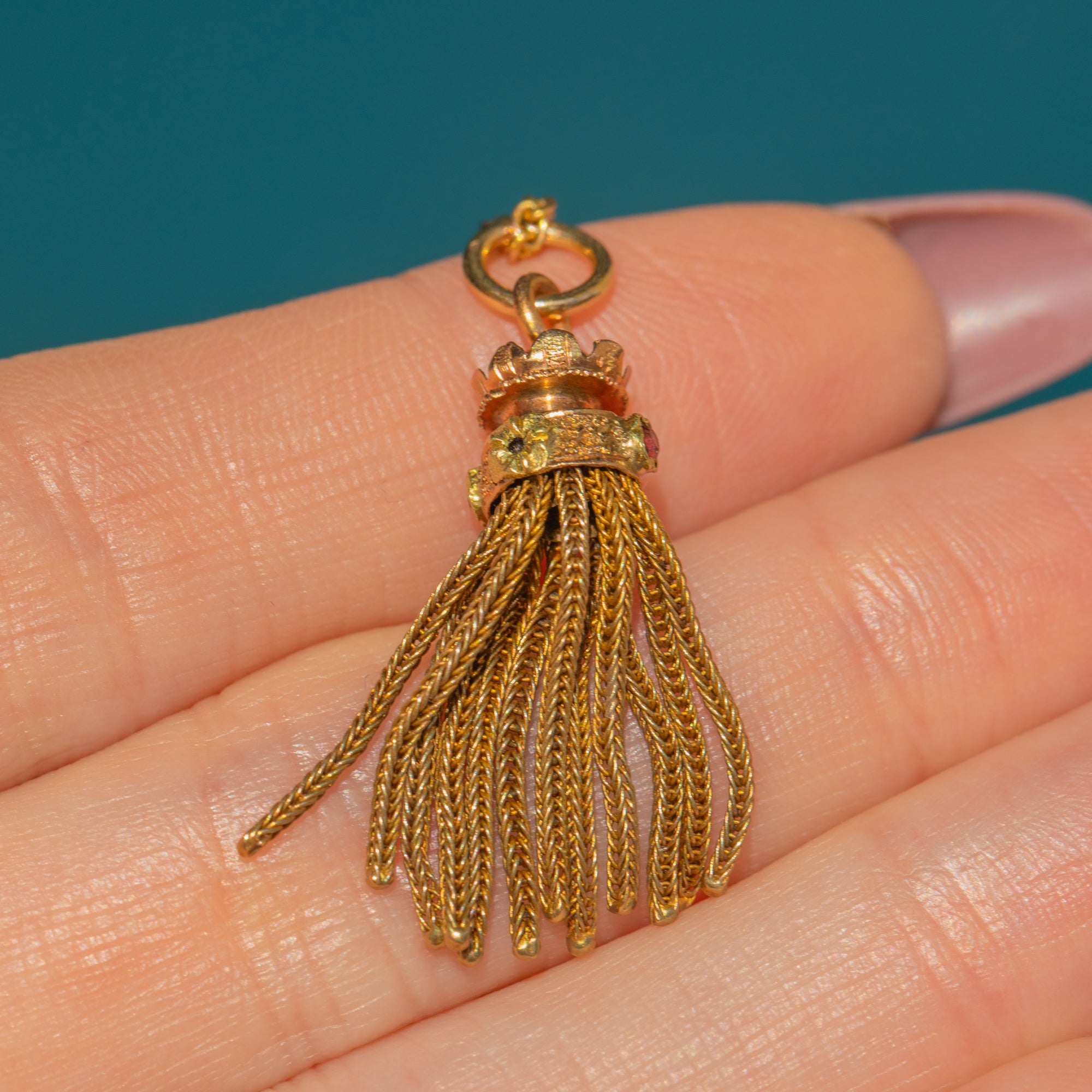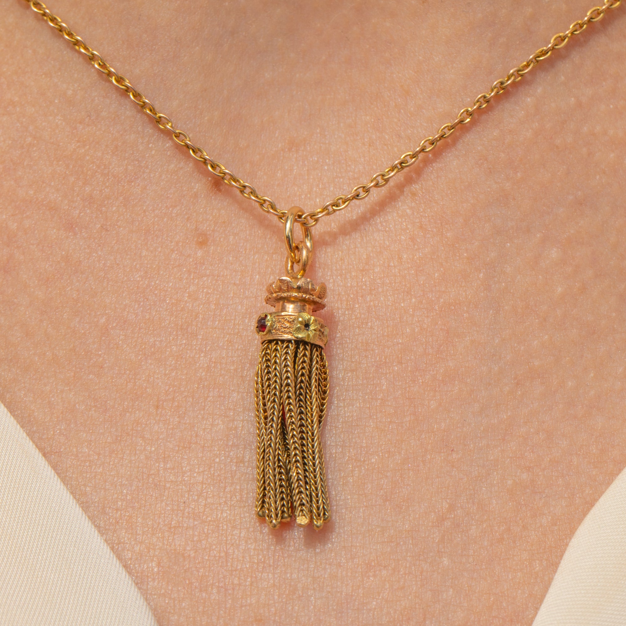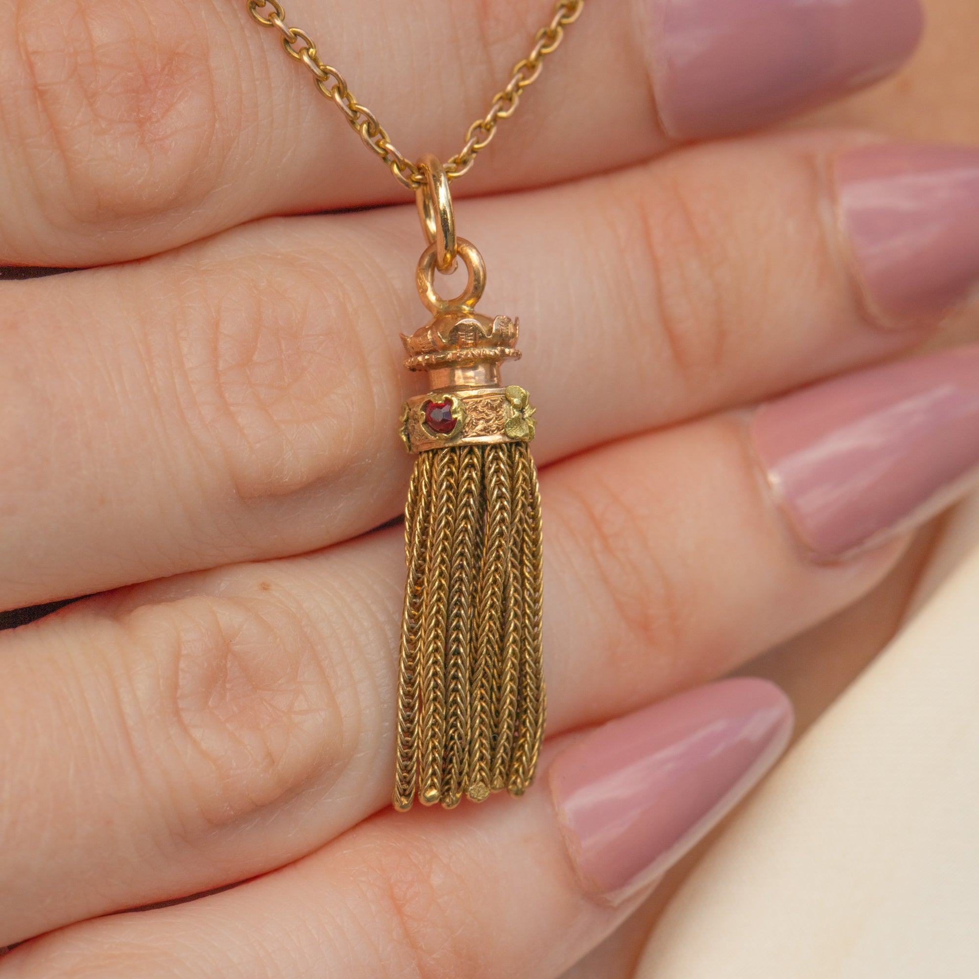 EXCELLENT. This Napoleon III French 18ct Gold tassel pendant is in excellent condition. The Gold is buttery and each foxtail chain tassel is neatly woven and firmly affixed. The Garnets are securely set and free from any signs of wear, with crimson flashes as their rose-cut facets catch the light. Complete with a soldered jump ring, all this pendant needs is a chain to adorn!