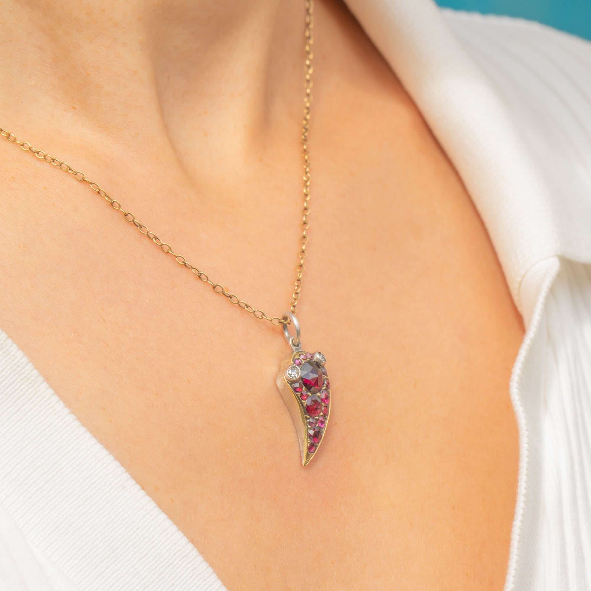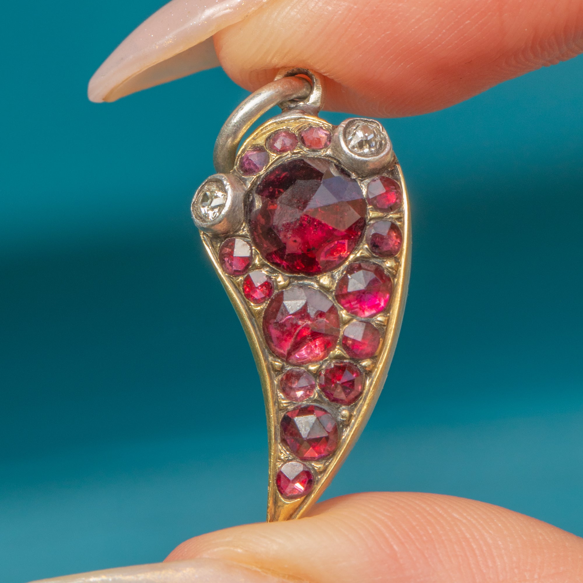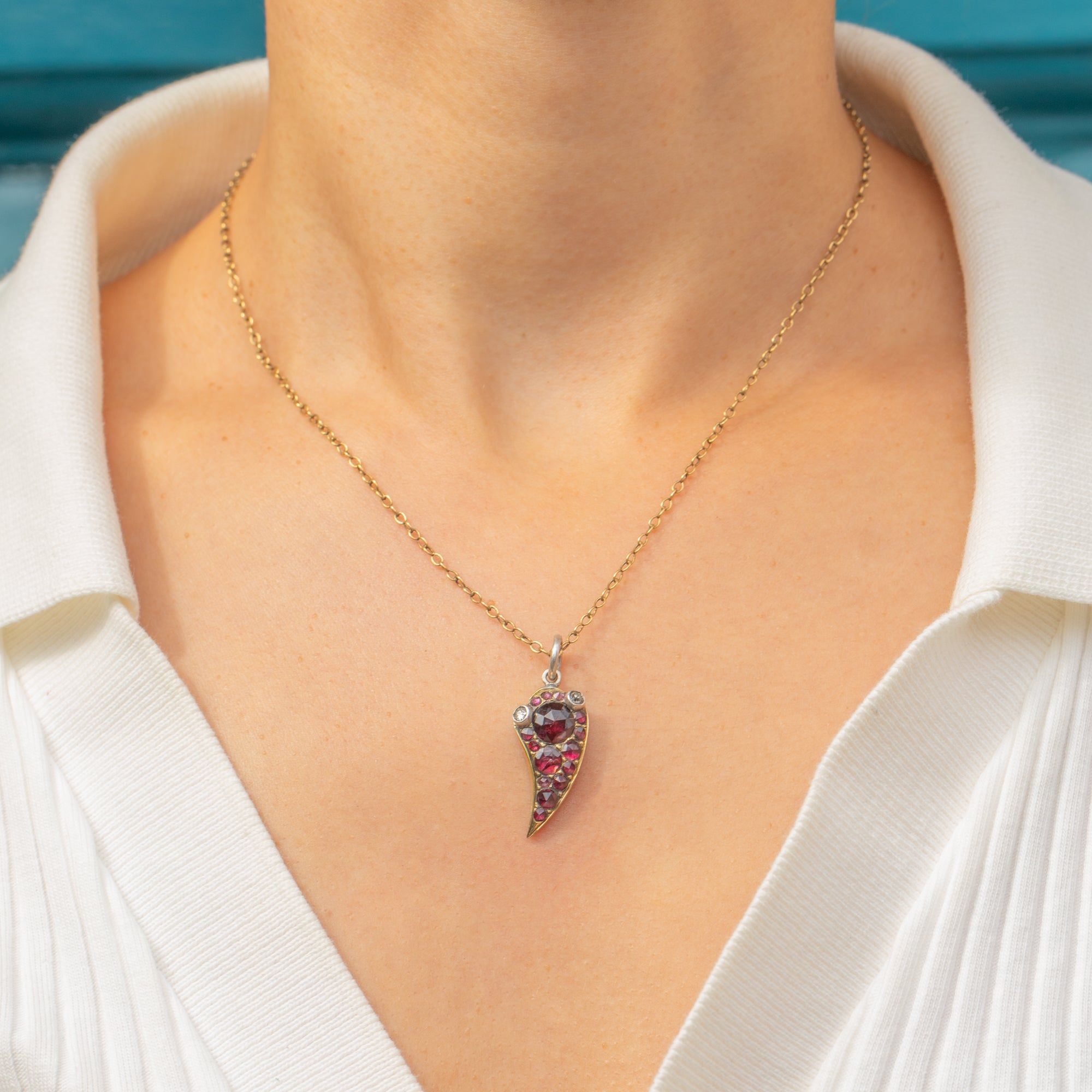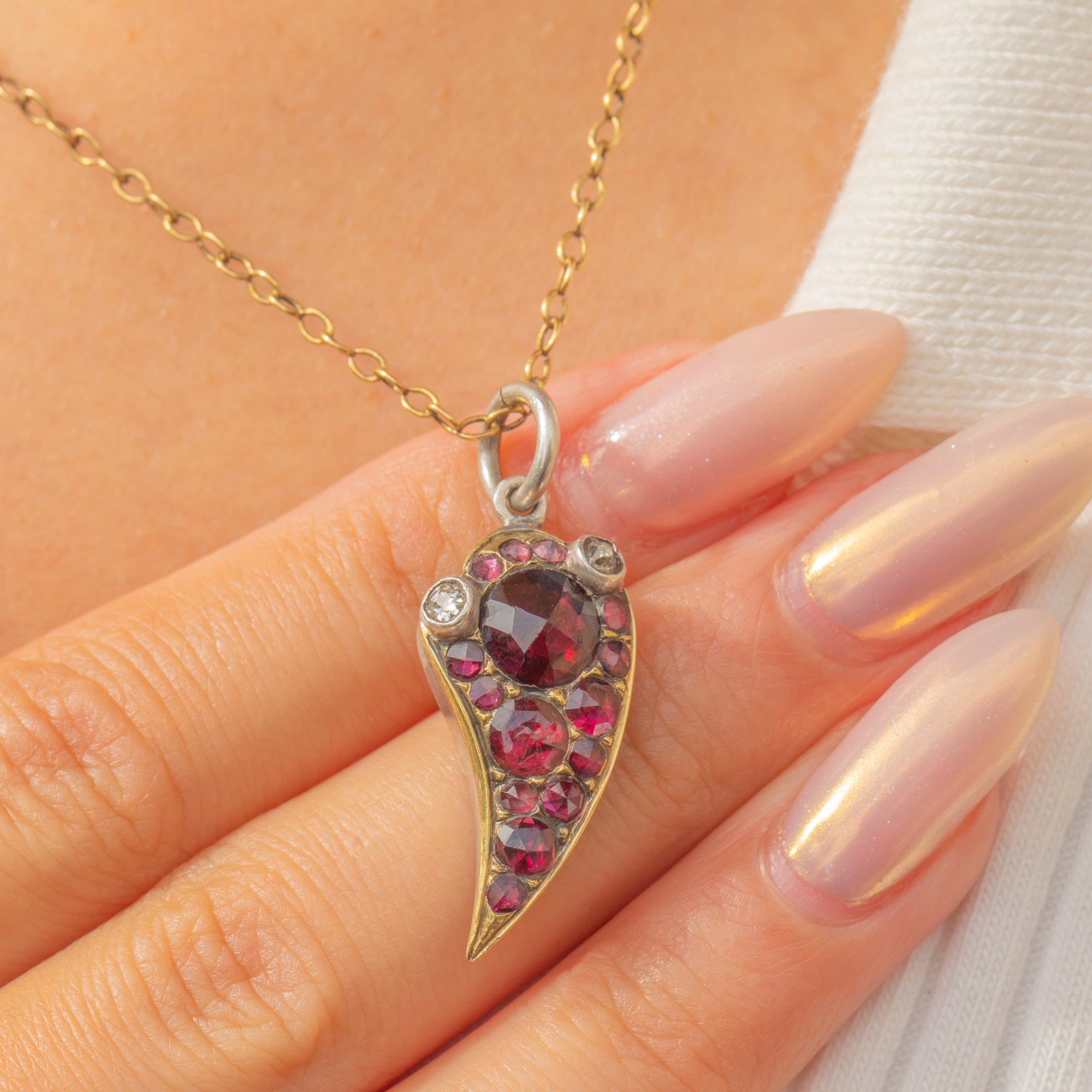 A bold and unusual Antique Victorian charm, designed in the form of a snake head and set with glowing red Rose-Cut Garnets. The gemstones graduate in size, arranged in a cobblestone effect with the largest Garnet at the centre, their deep plum tones glowing beautifully in the light. Adding to its character, the snake’s eyes are formed from antique Old Mine-Cut Diamonds in sturdy Silver bezels, giving this piece a mesmerising and lifelike appearance.