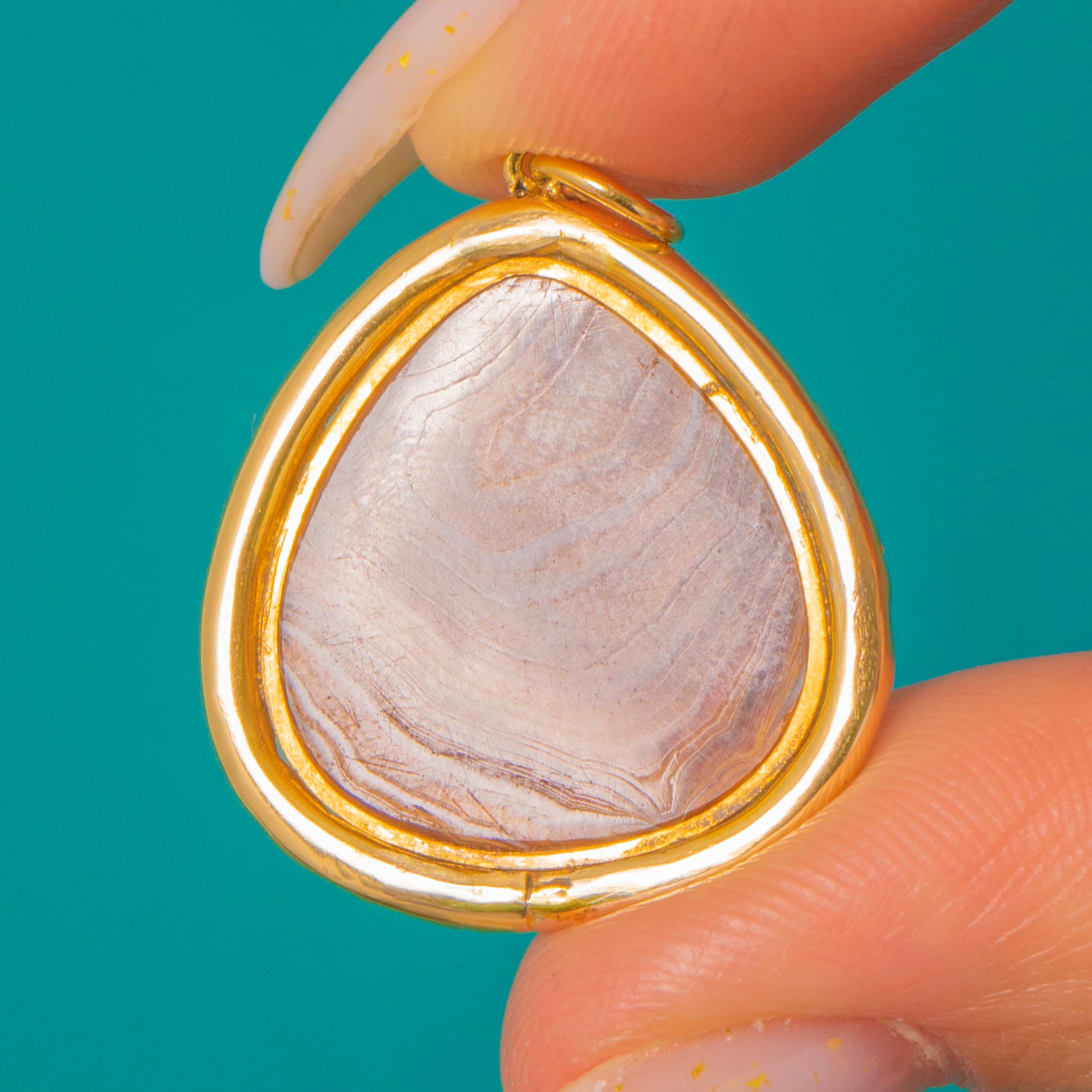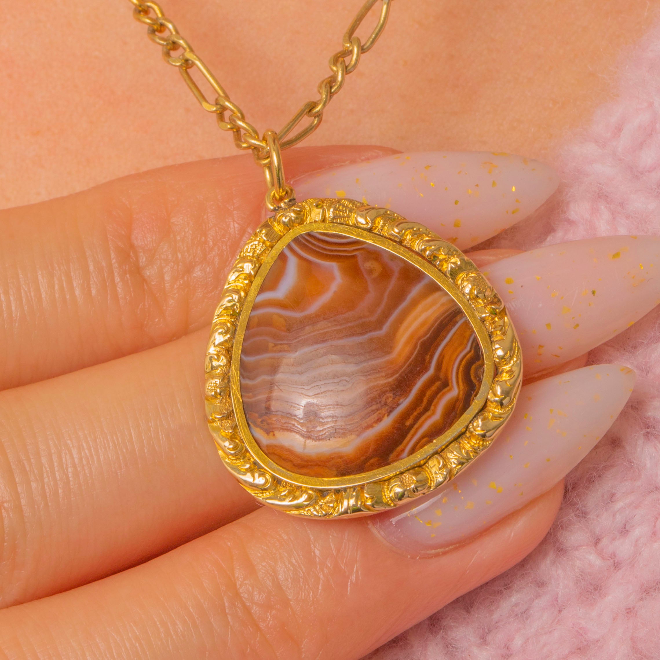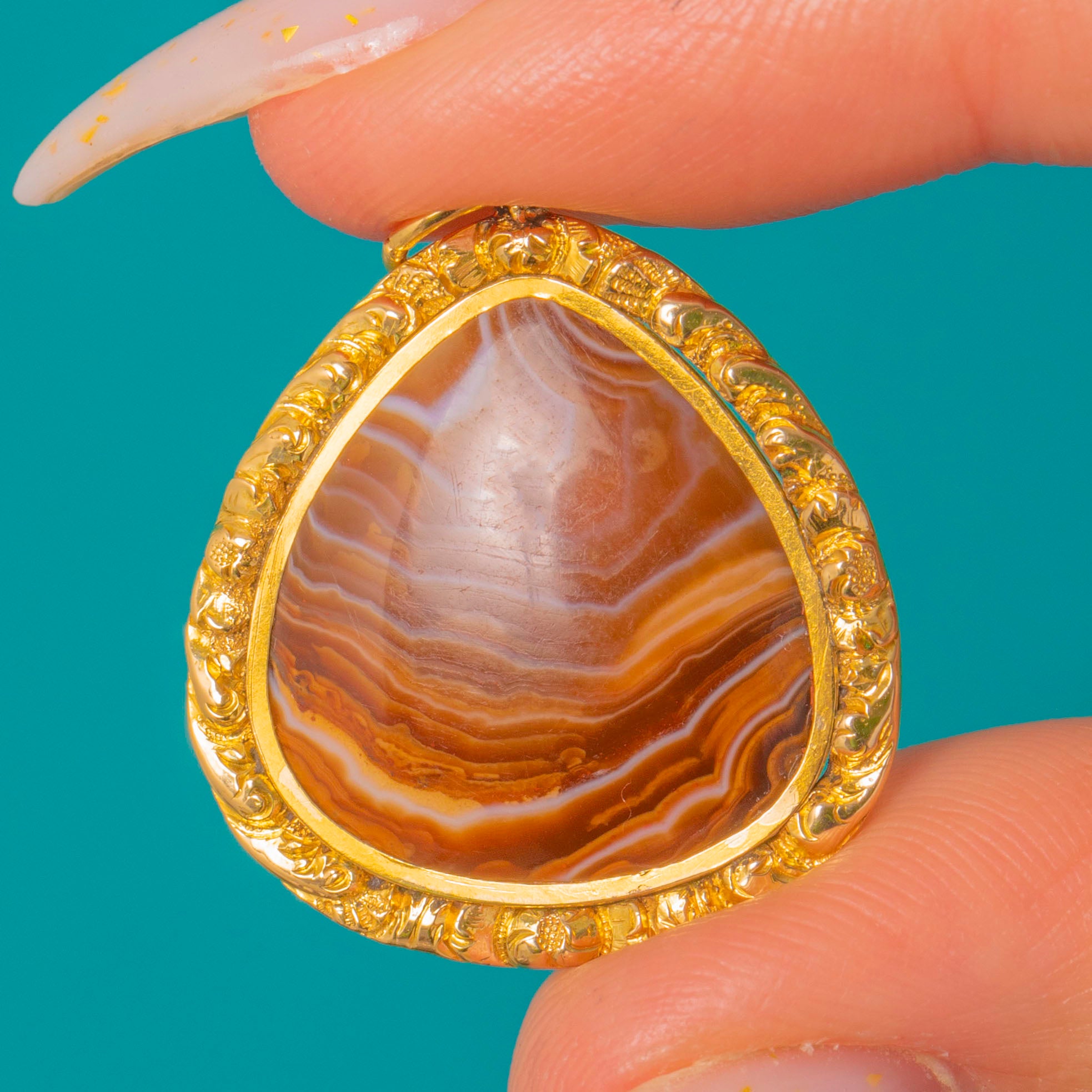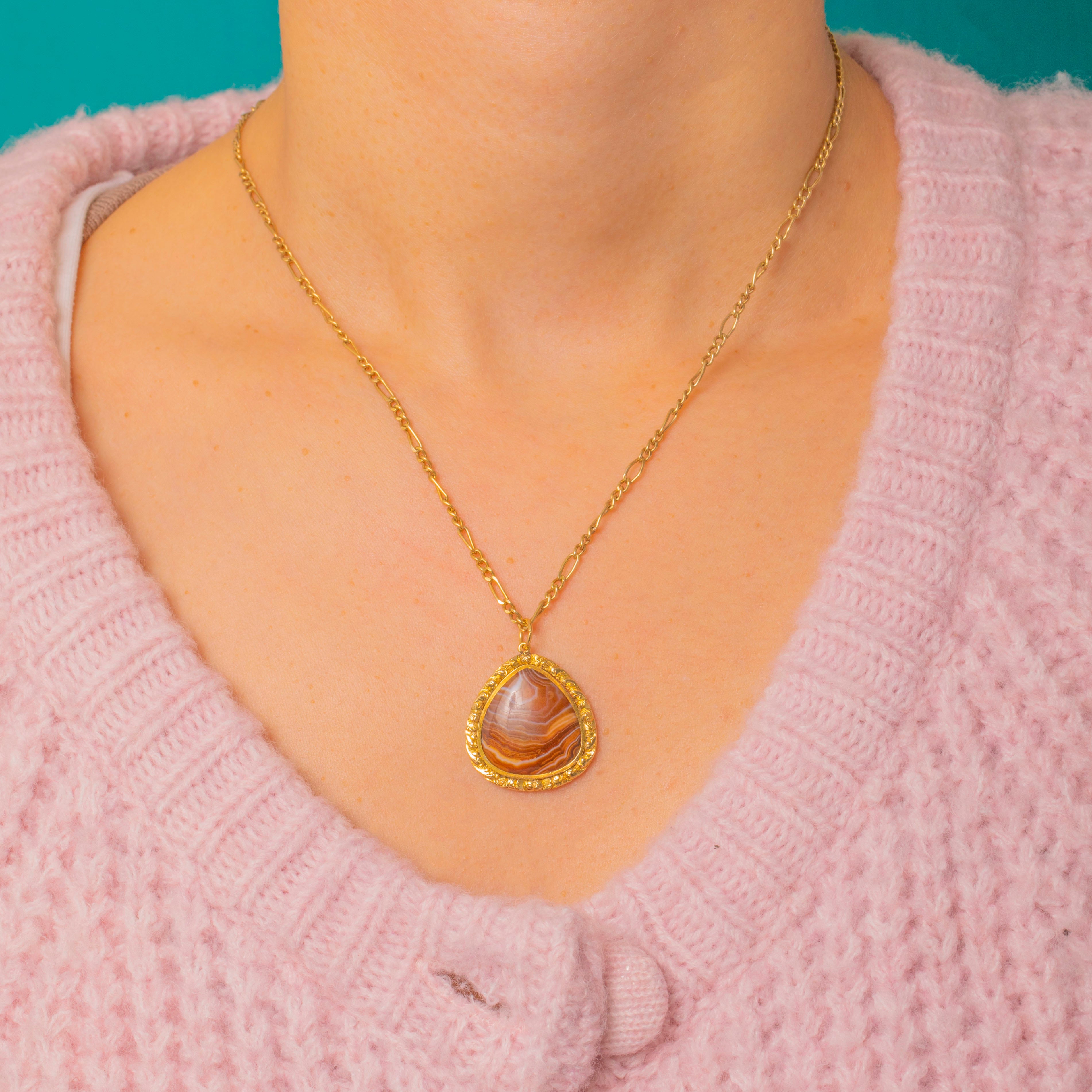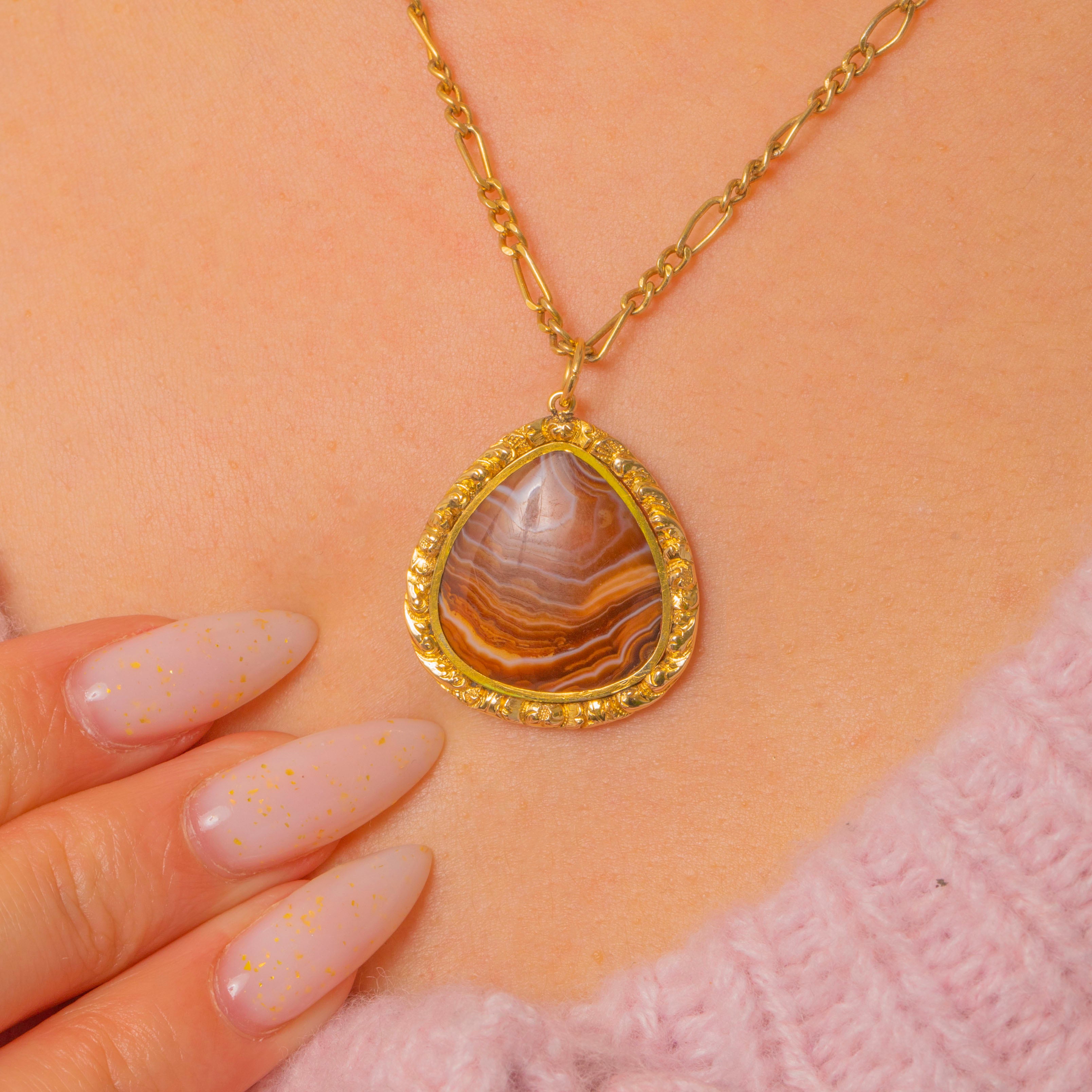 A Georgian 15ct Gold cased Agate pendant, centred with a domed teardrop cabochon of banded Agate in warm brown, amber and cream with pale grey‑lilac veining. The stone is held in a raised closed bezel and framed by an applied foliate and granulated surround, giving the piece a romantic, antique character. This is a statement pendant with ornate, period detailing and a luminous presence.