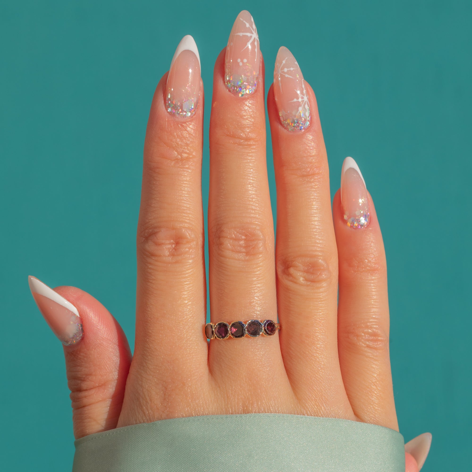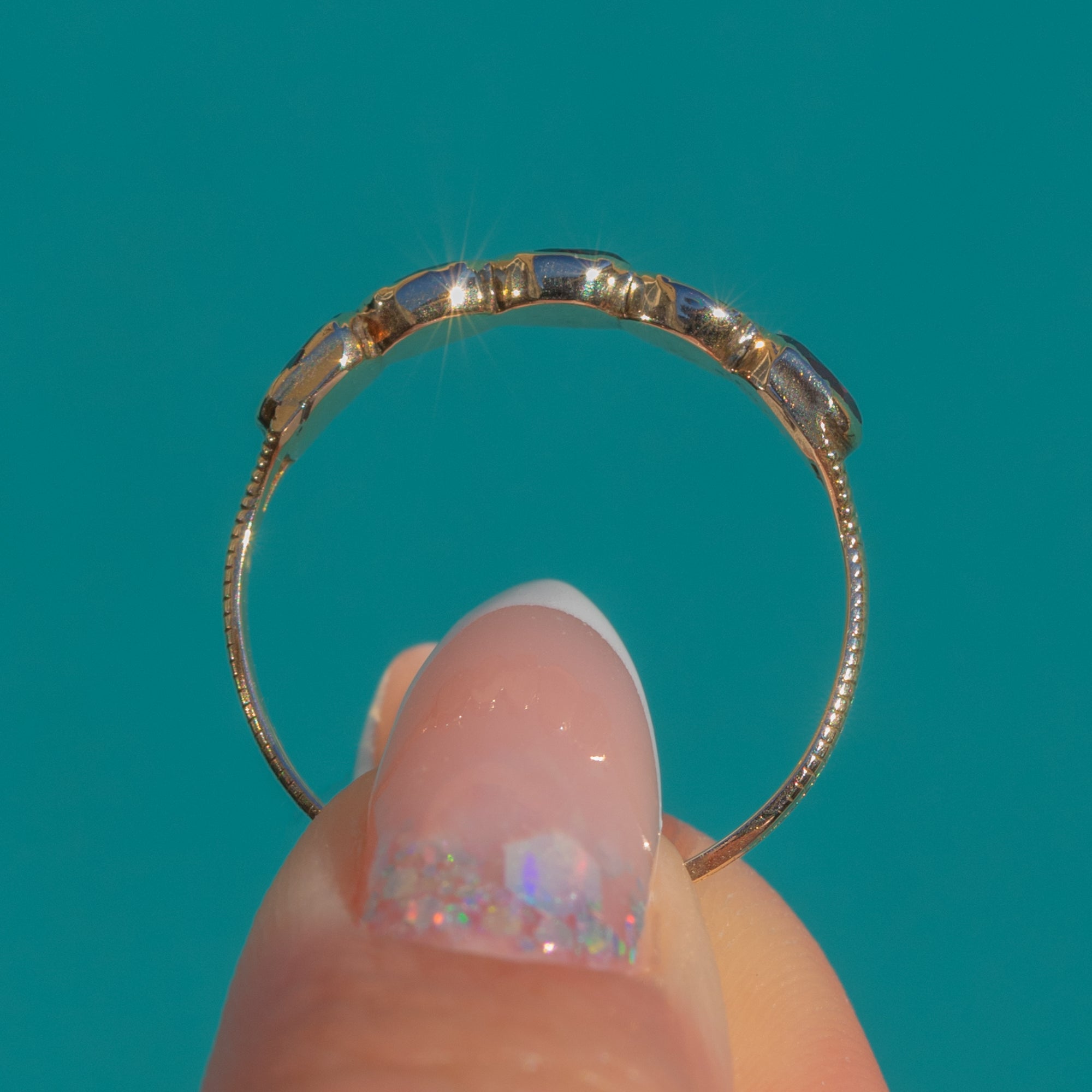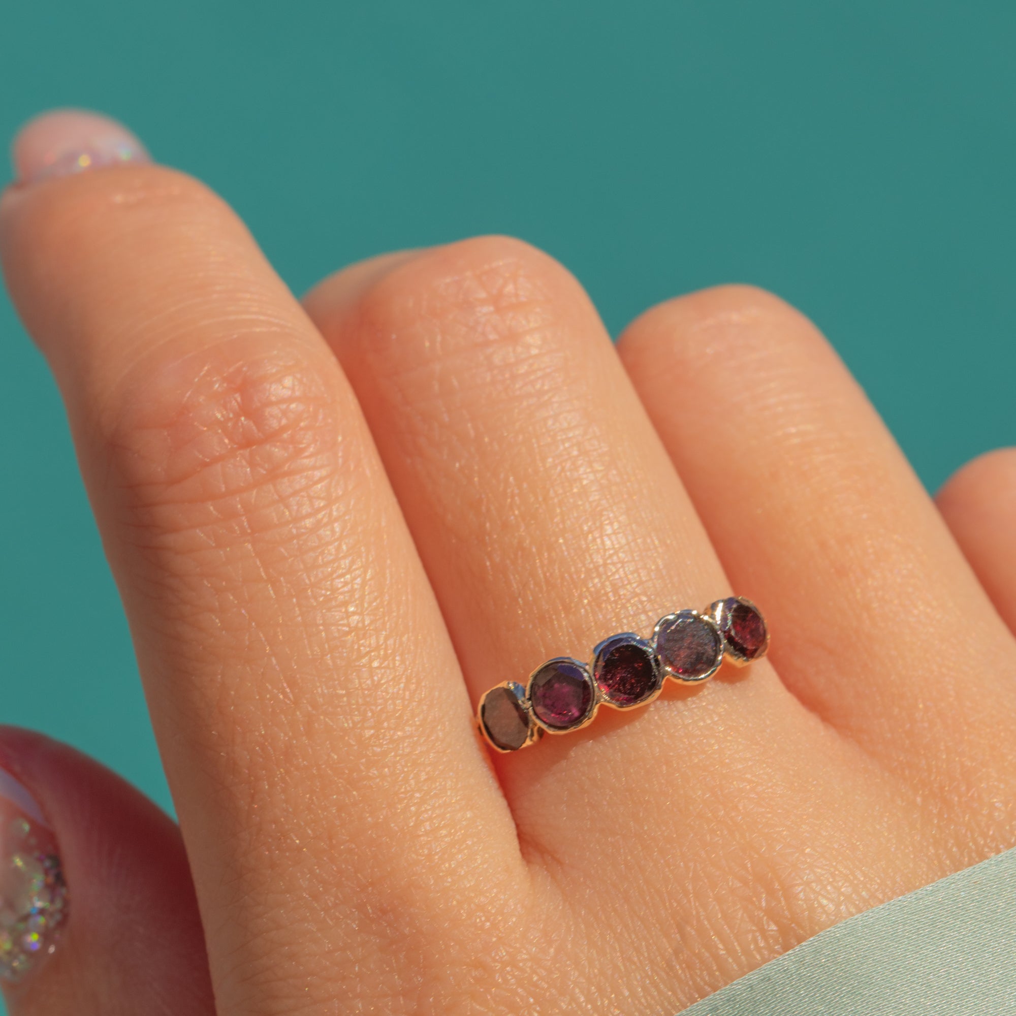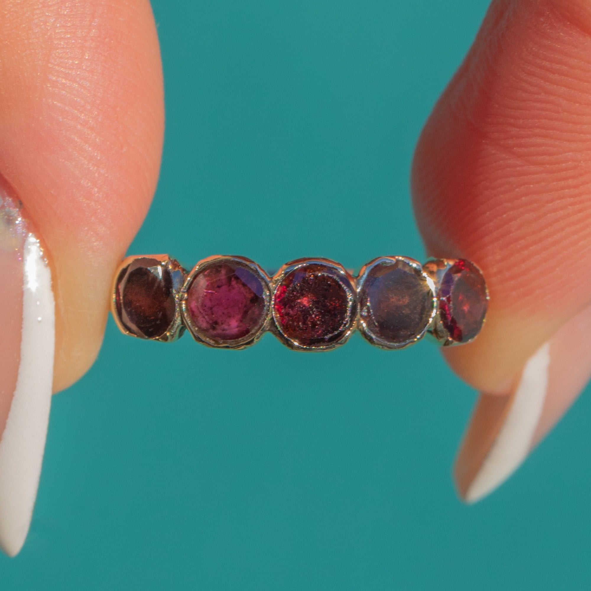 A beautiful Georgian five-stone ring set with glowing flat-cut Garnets, each displaying that rich, berry-red tone so beloved of the era. The gemstones are closed-back and foiled, enhancing their colour and giving the ring that unmistakable antique luminosity.