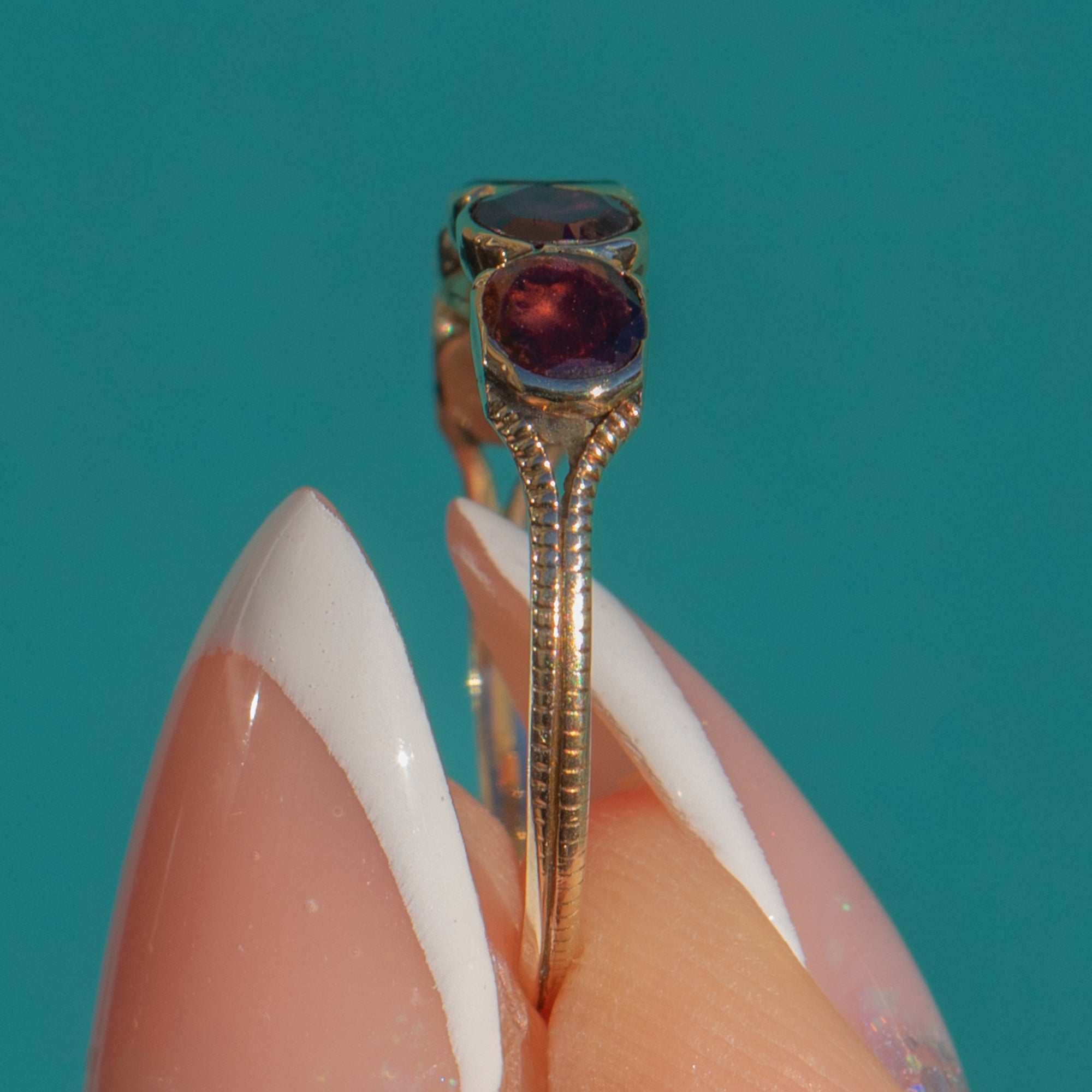The Gold settings feature softly scalloped collets typical of Georgian craftsmanship, while the slim shank is decorated with delicate beaded detailing along the edges. Elegant, wearable, and full of warm charm, it’s a quintessential antique Garnet ring with centuries of romance behind it.