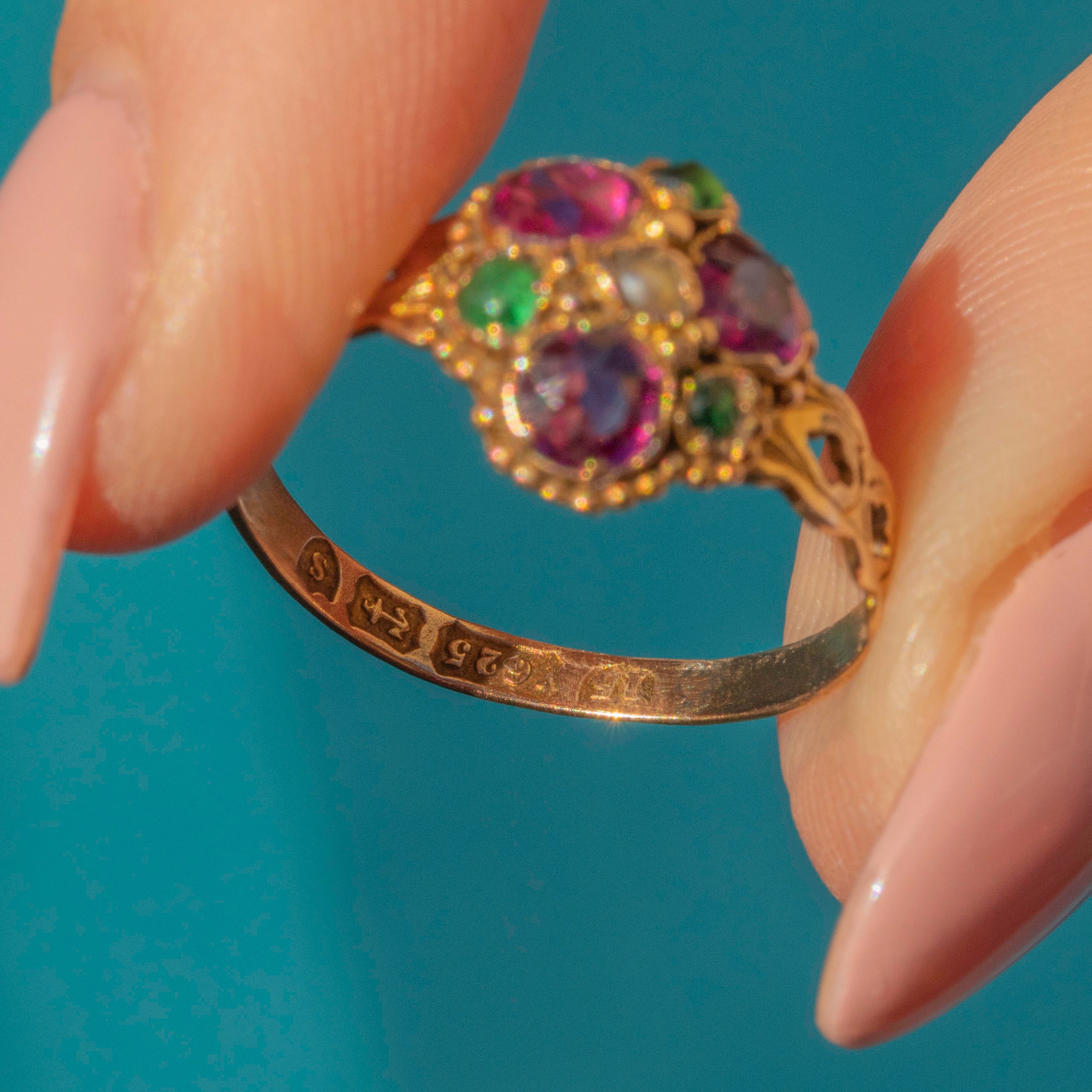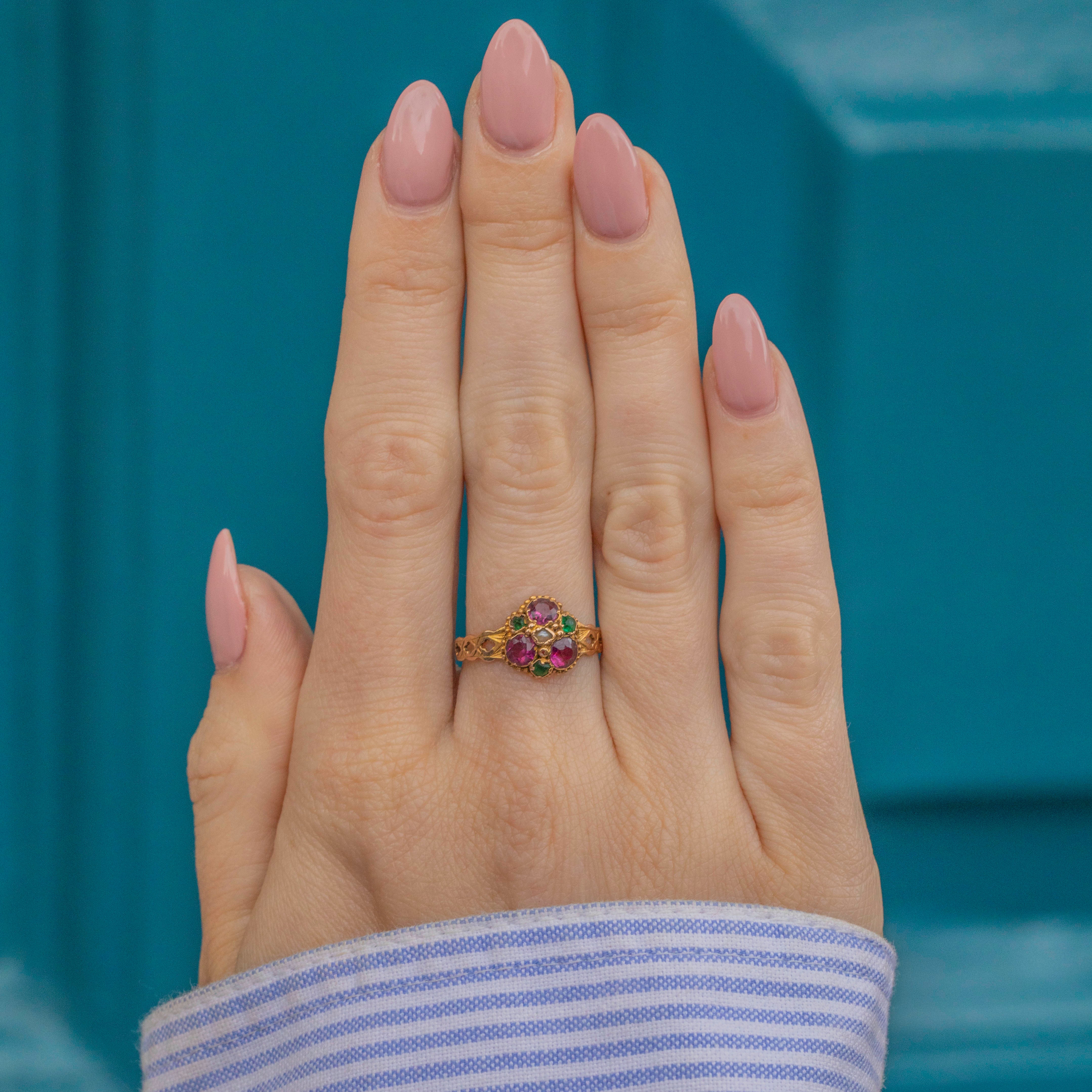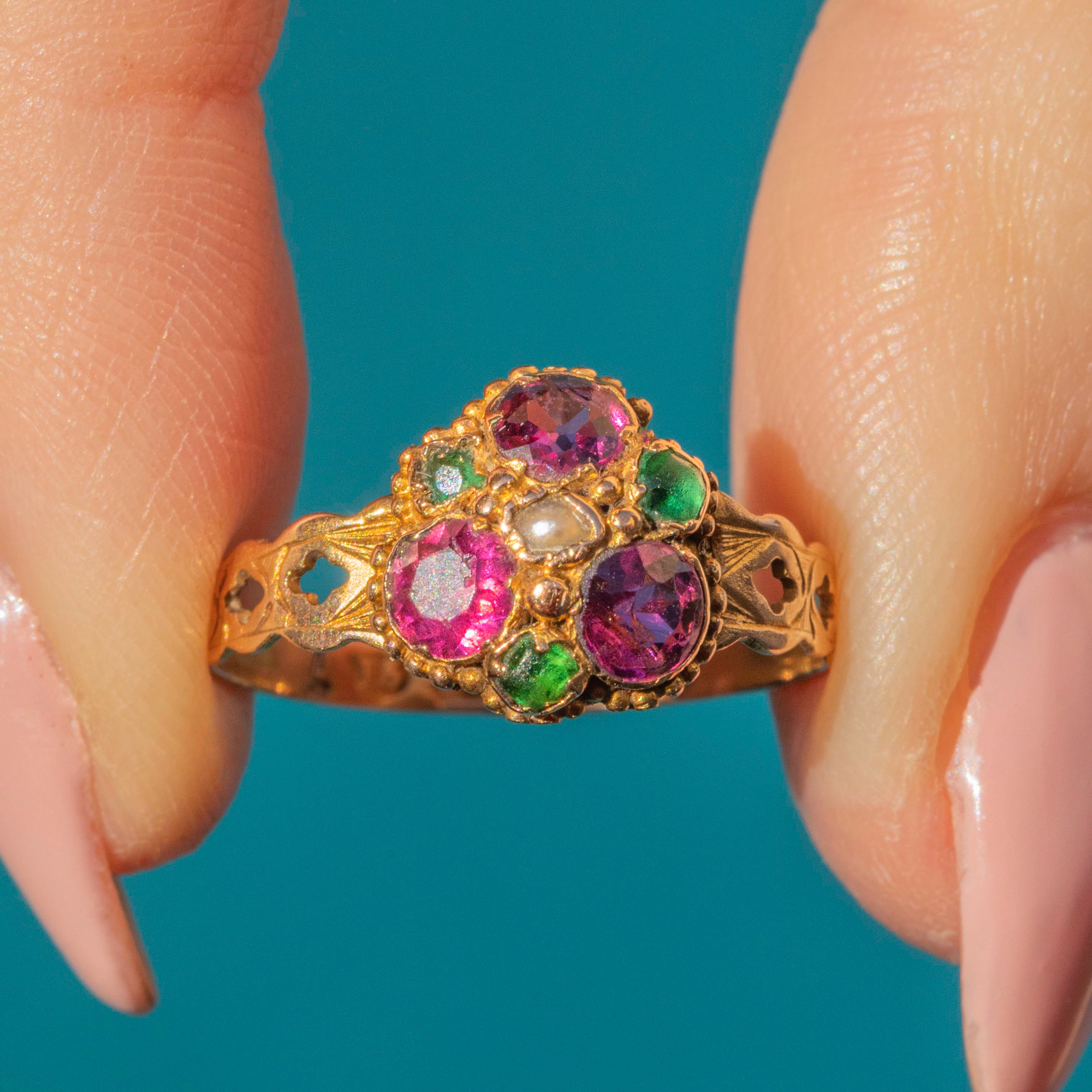Complemented by the surrounding deep green Paste stones and iridescent central Pearl, she forms a blossoming floral delight for the senses! Her 15ct Gold band is engraved intricately (by hand of course!), and is a true testament to Georgian craftsmanship.