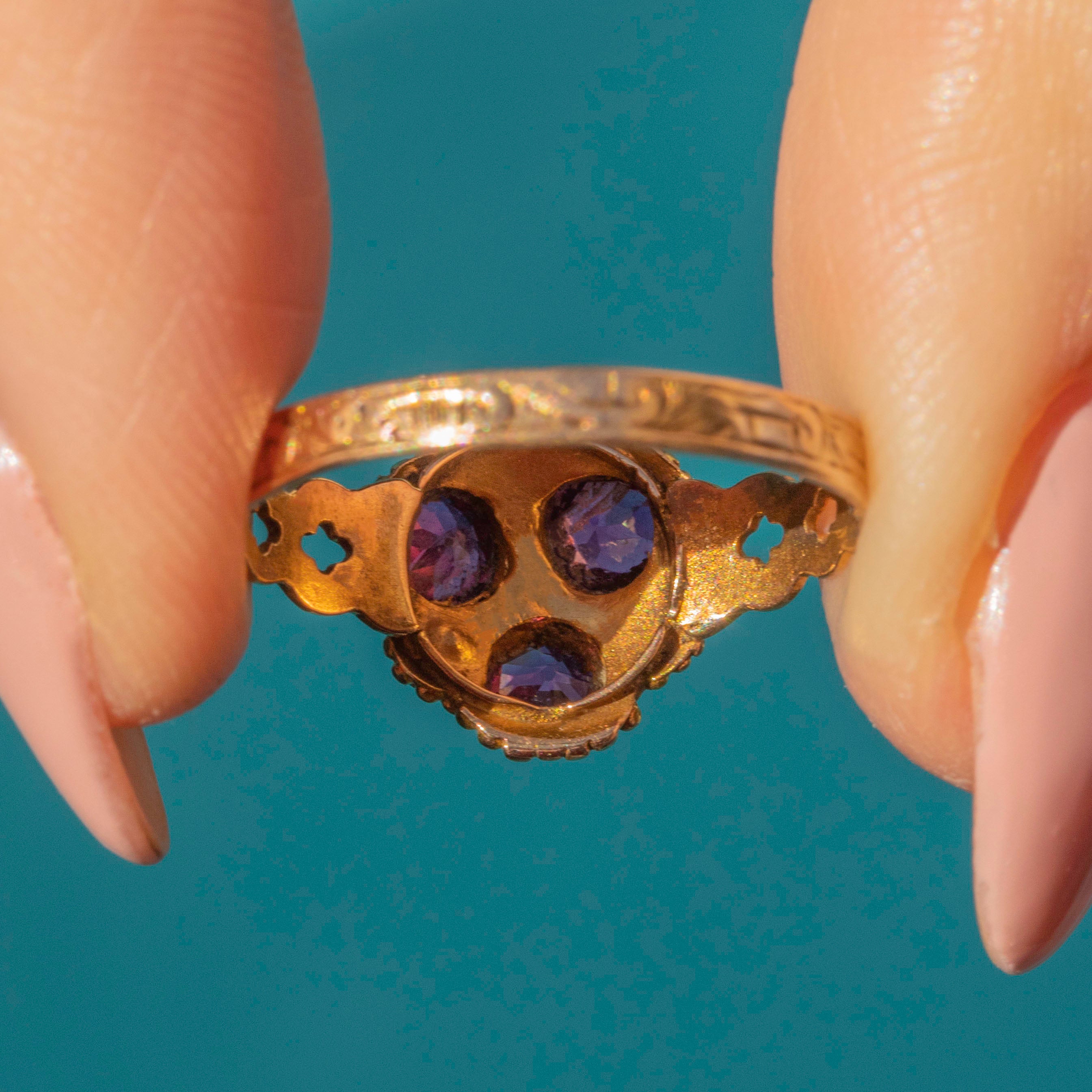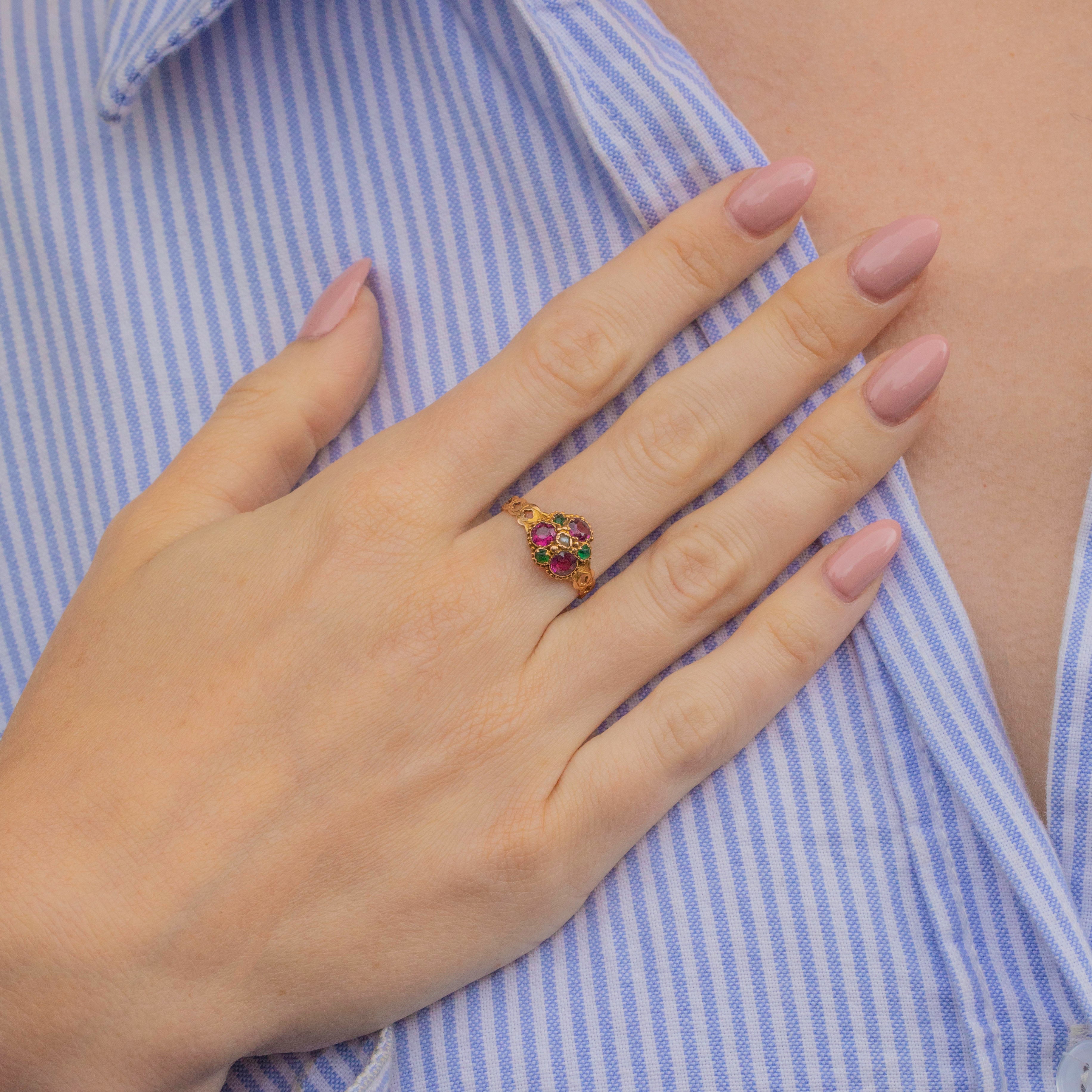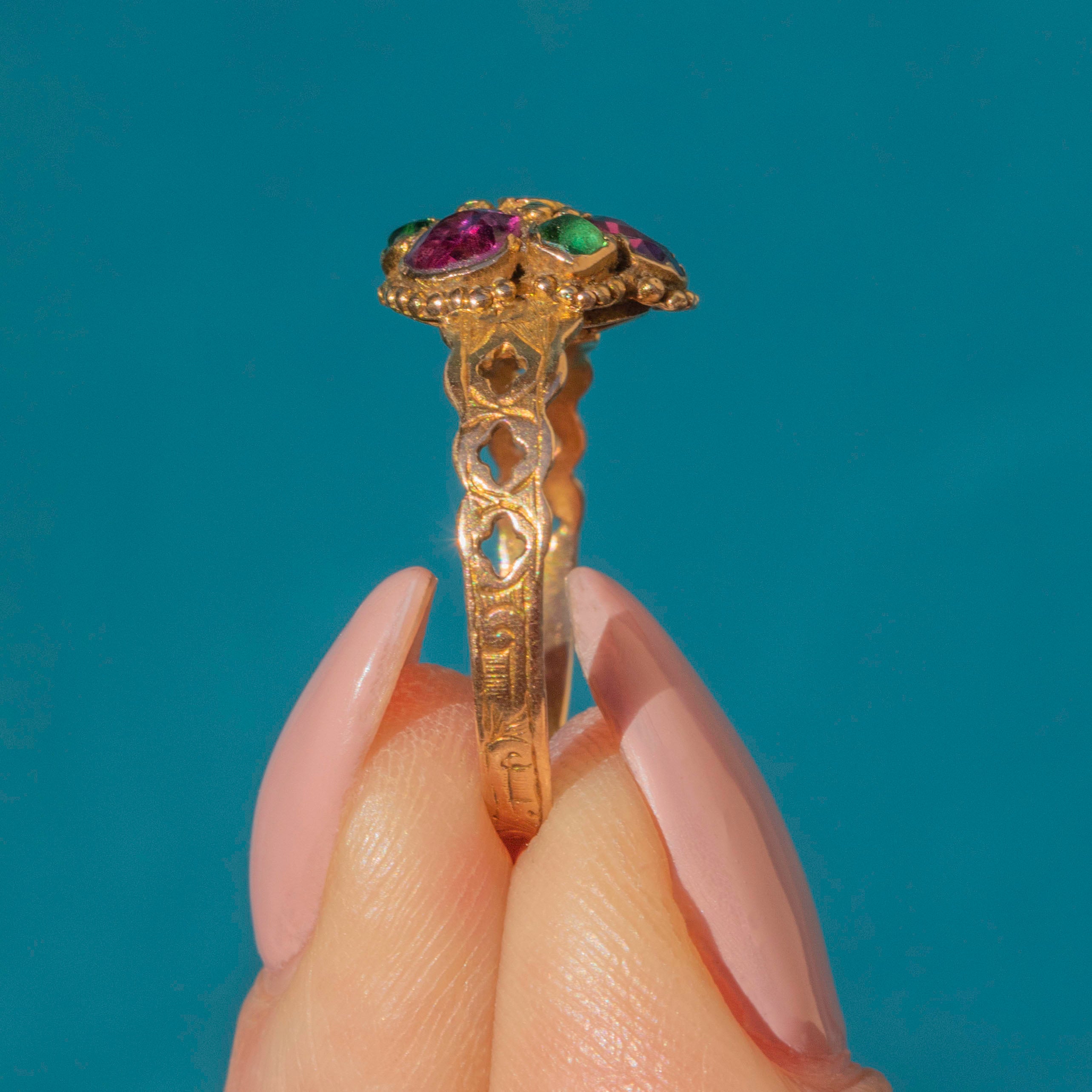 Full of charm, this Georgian 15ct Gold ring is adorable and features a vibrant floral design set with fuchsia Garnets framed by beautiful engravings.
