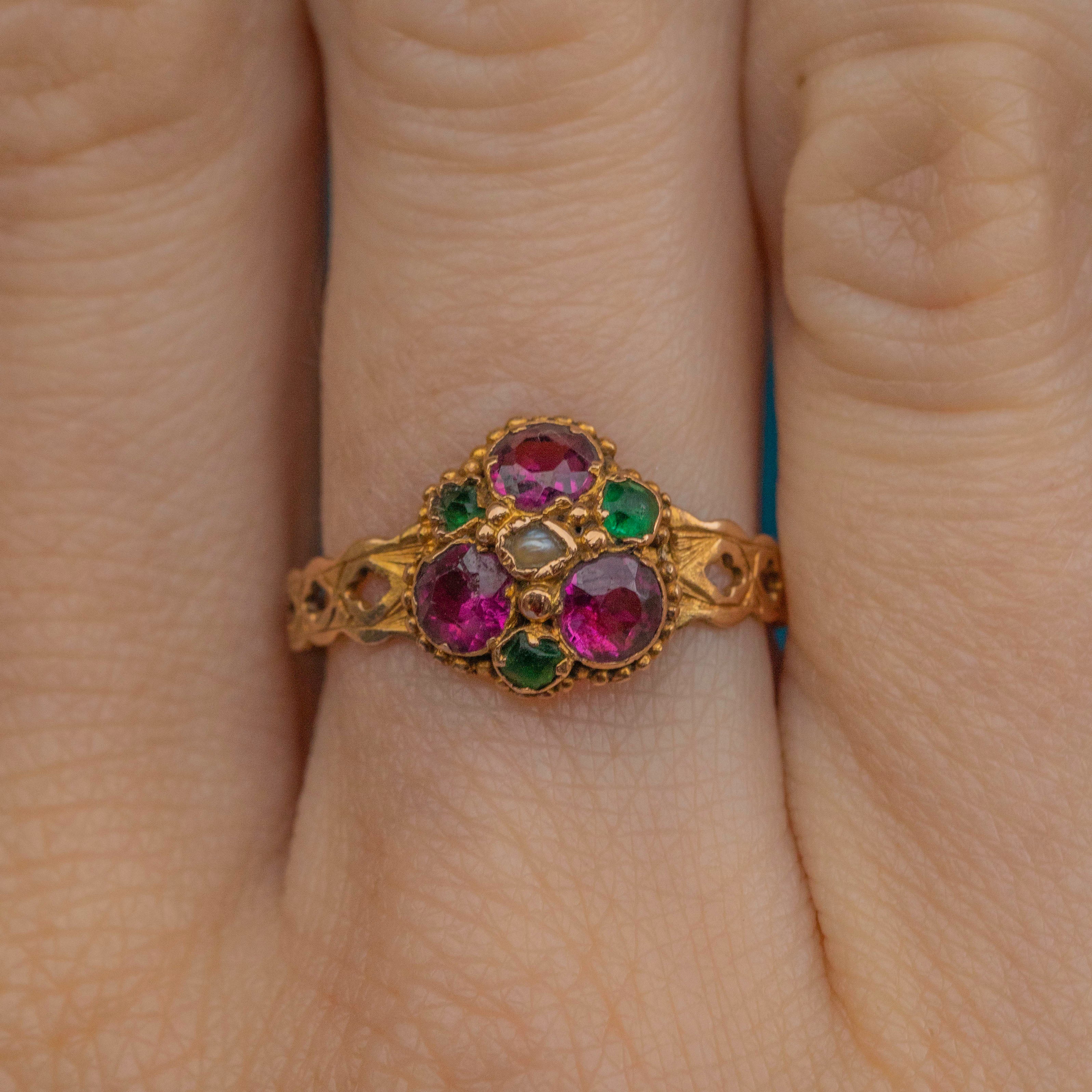 EXCELLENT. We are pleased to present this antique Georgian 15ct Gold Garnet flower ring in excellent condition. Her Pearl, Garnets, and Paste stones are in great condition, catching the light beautifully, and are free from any scuffs. The band is beautifully engraved, a true testament to Georgian craftsmanship. In such wonderful condition, this antique Gold ring is a must-have!