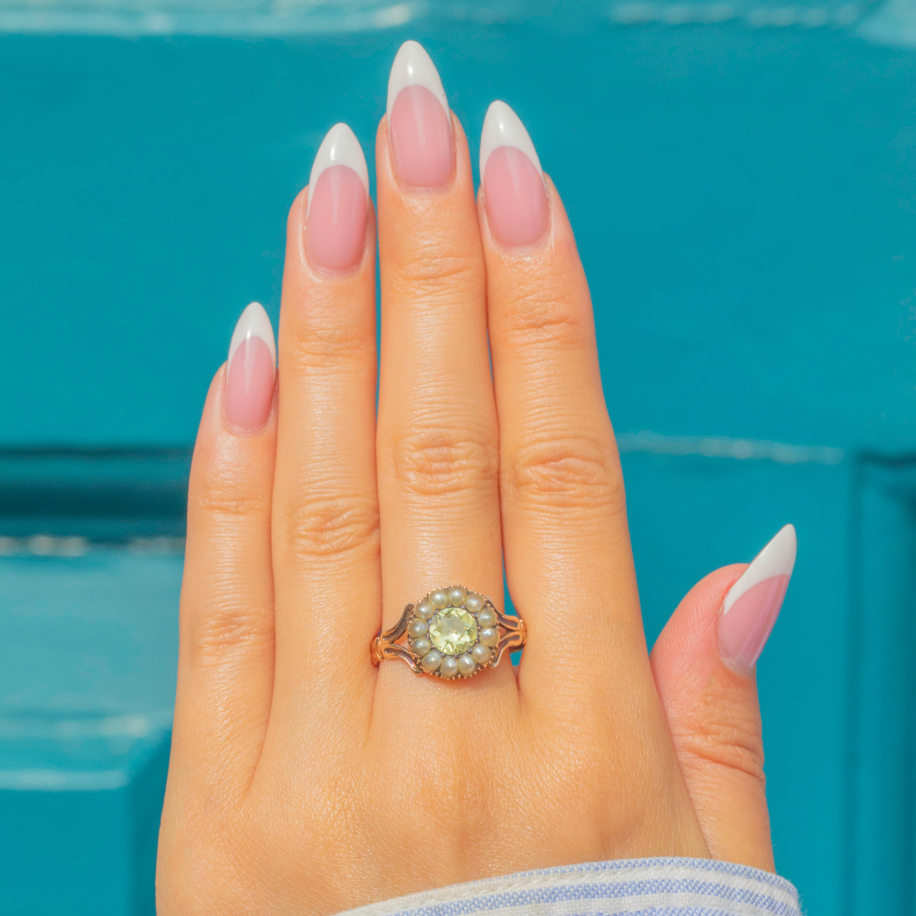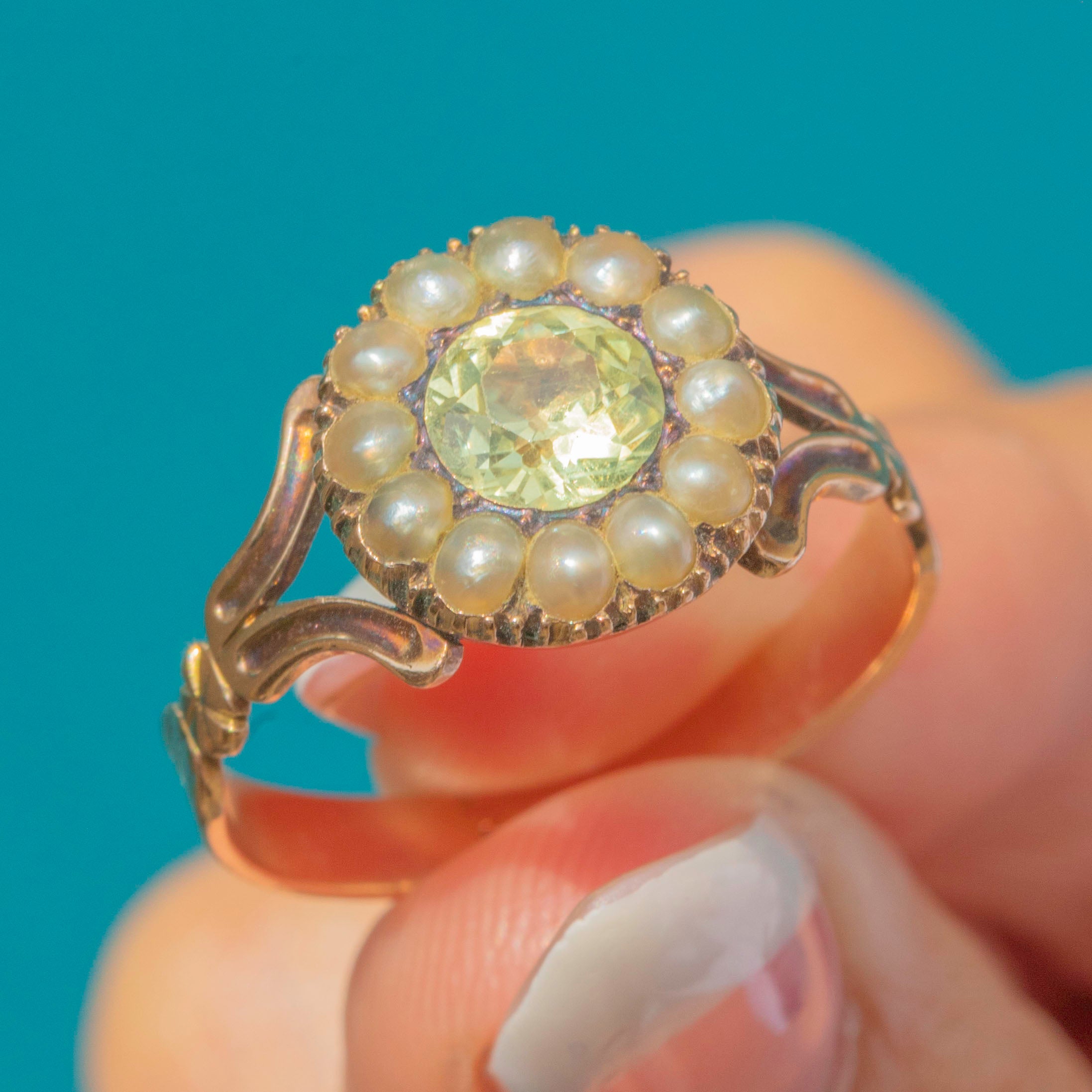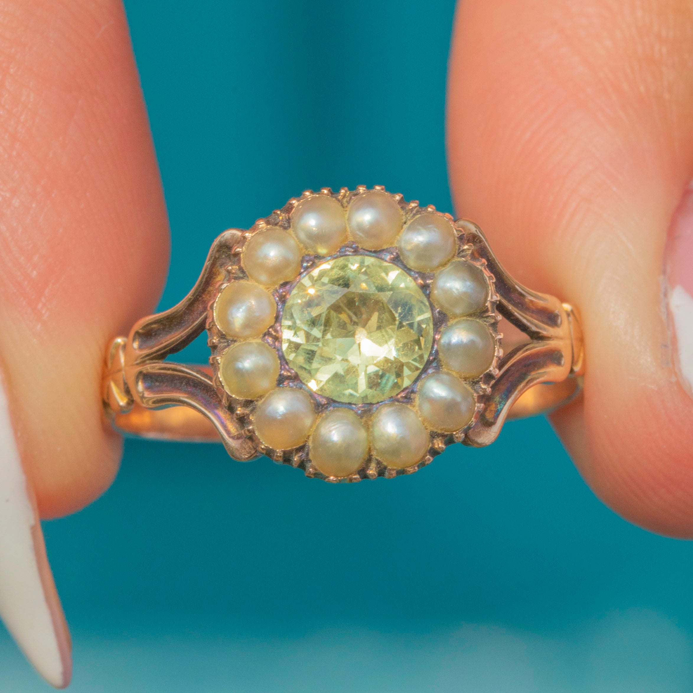 A luminous Georgian halo ring crafted circa 1830, set with a bright, clear Chrysoberyl framed by a halo of creamy natural Pearls. The split shoulders flow into a refined, closed-back setting, all crafted in rich 15ct Gold for that soft antique glow.