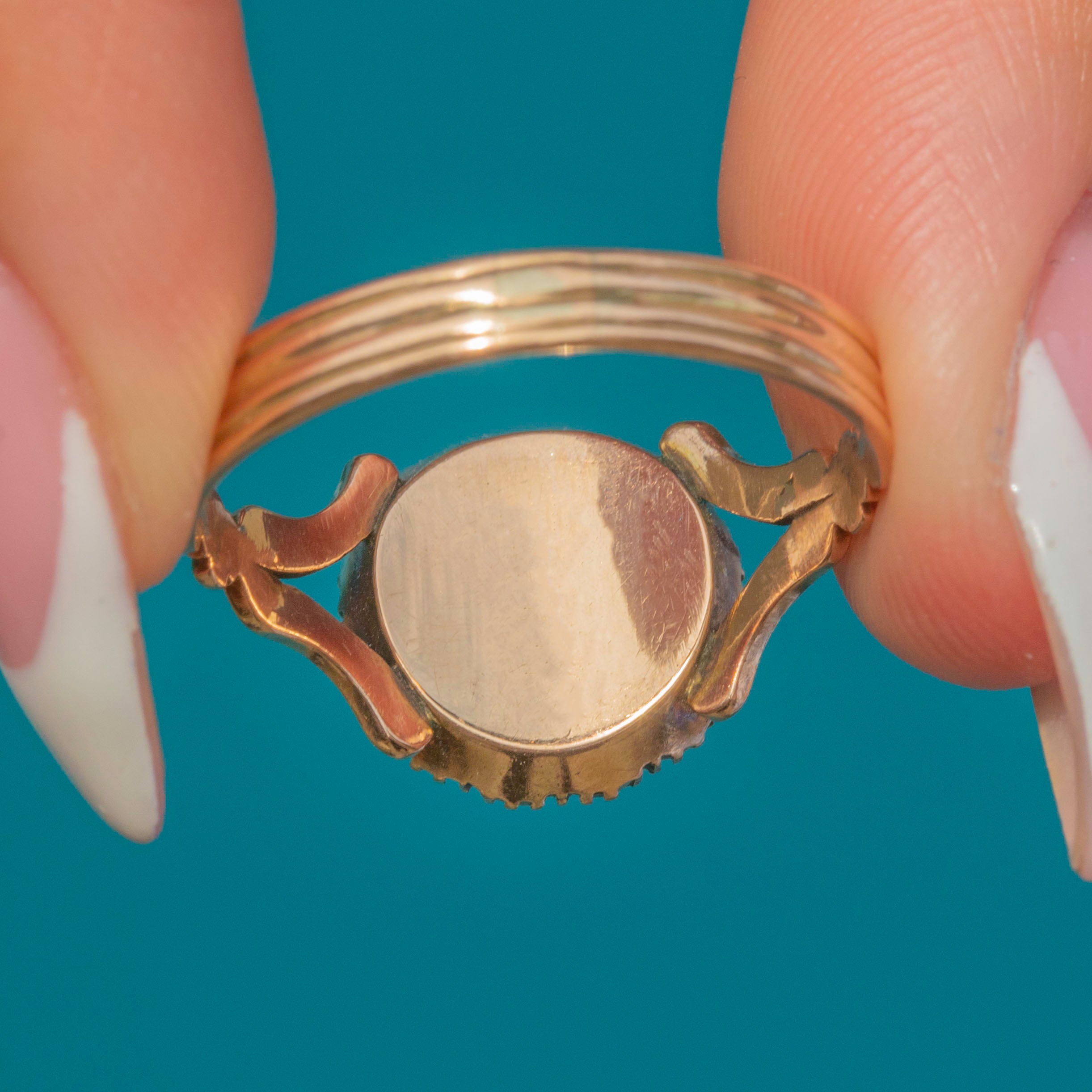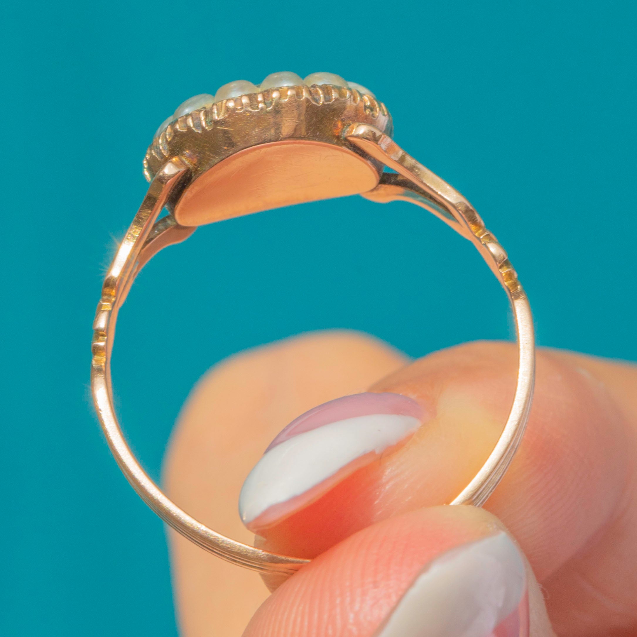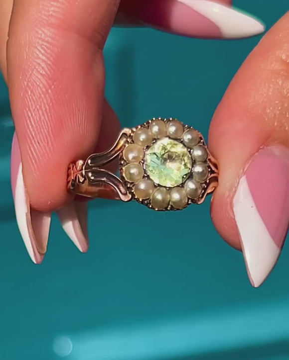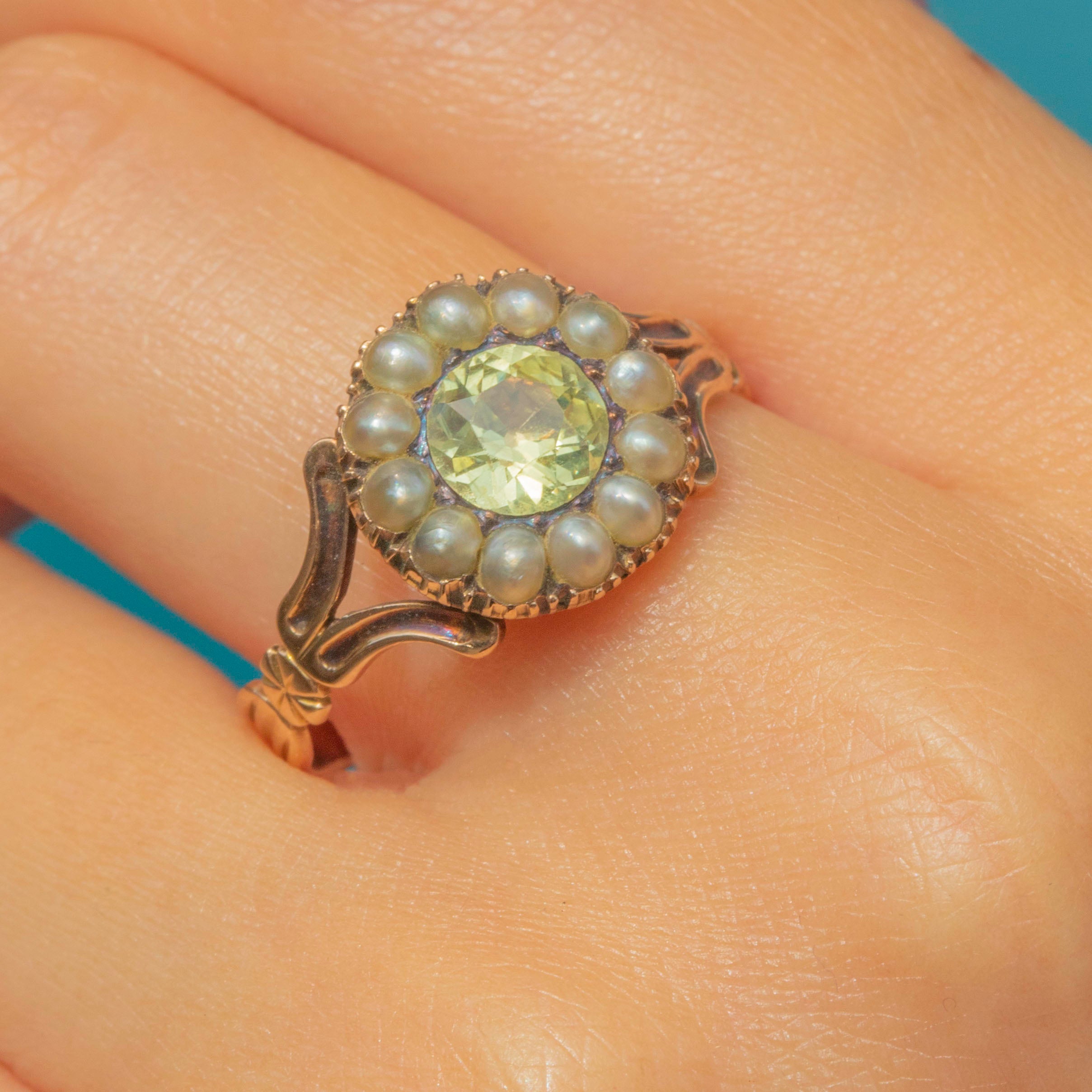A luminous Georgian halo ring crafted circa 1830, set with a bright, clear Chrysoberyl framed by a halo of creamy natural Pearls. The split shoulders flow into a refined, closed-back setting, all crafted in rich 15ct Gold for that soft antique glow.