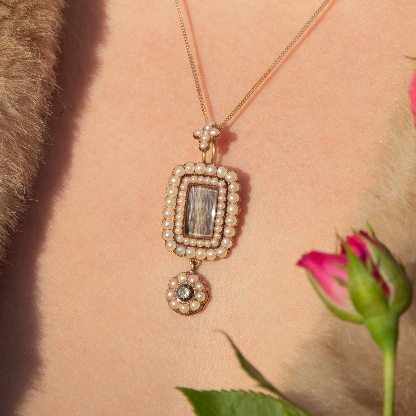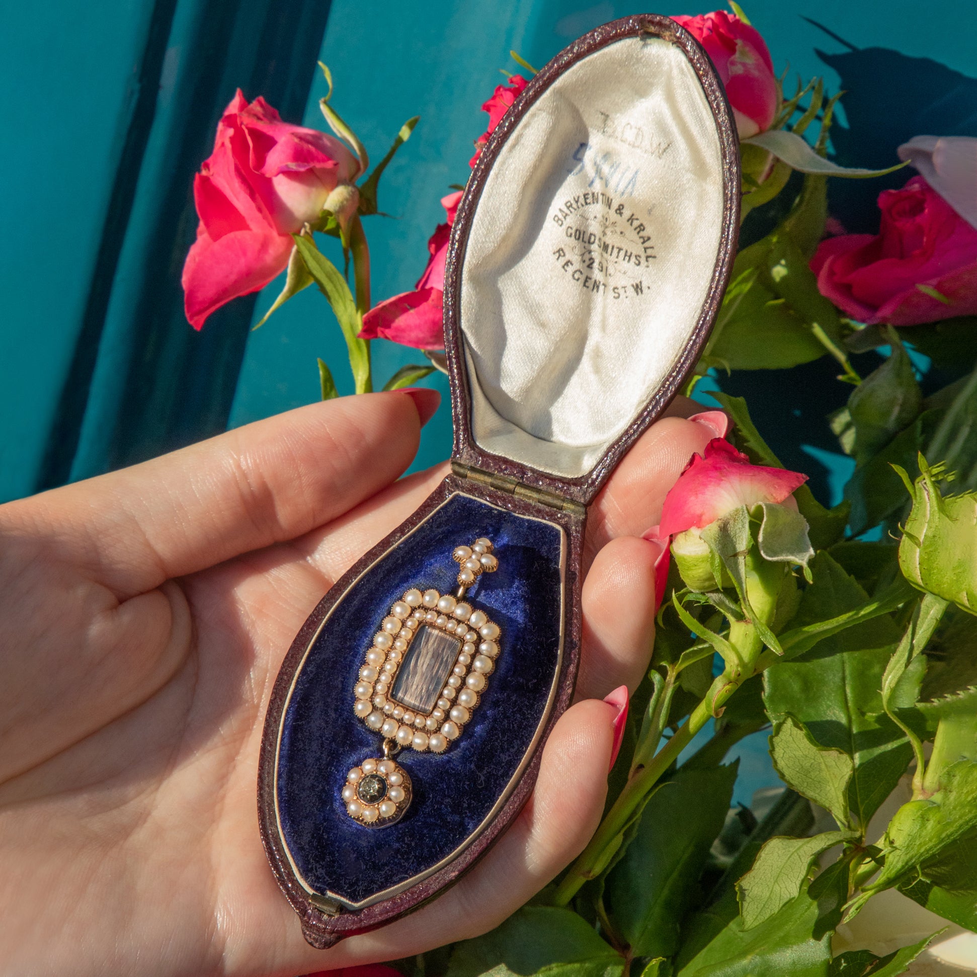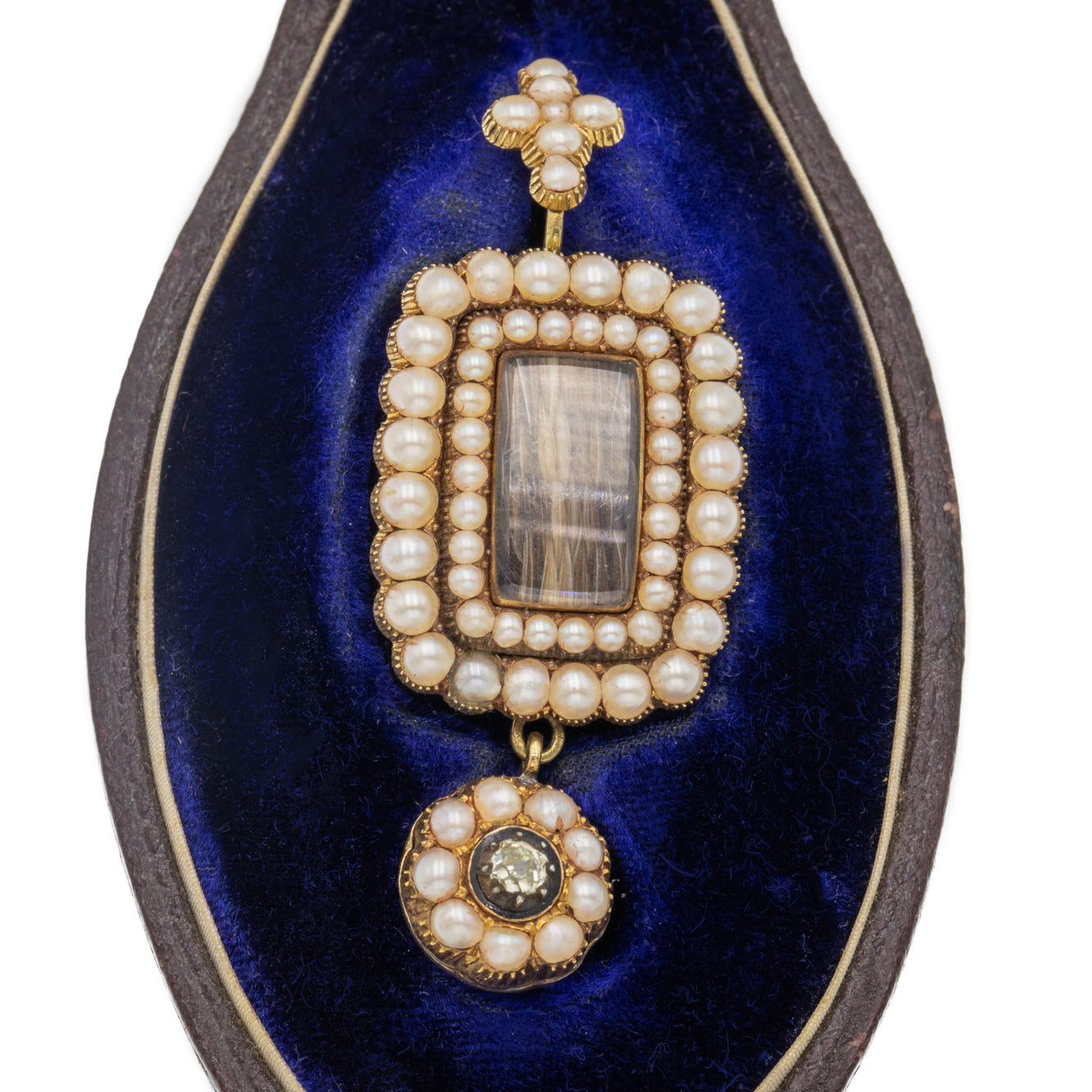 Pendentif de deuil géorgien en or 15 carats avec perles en grappe et diamants, boîte en velours d'origine adaptée pour antiquités
