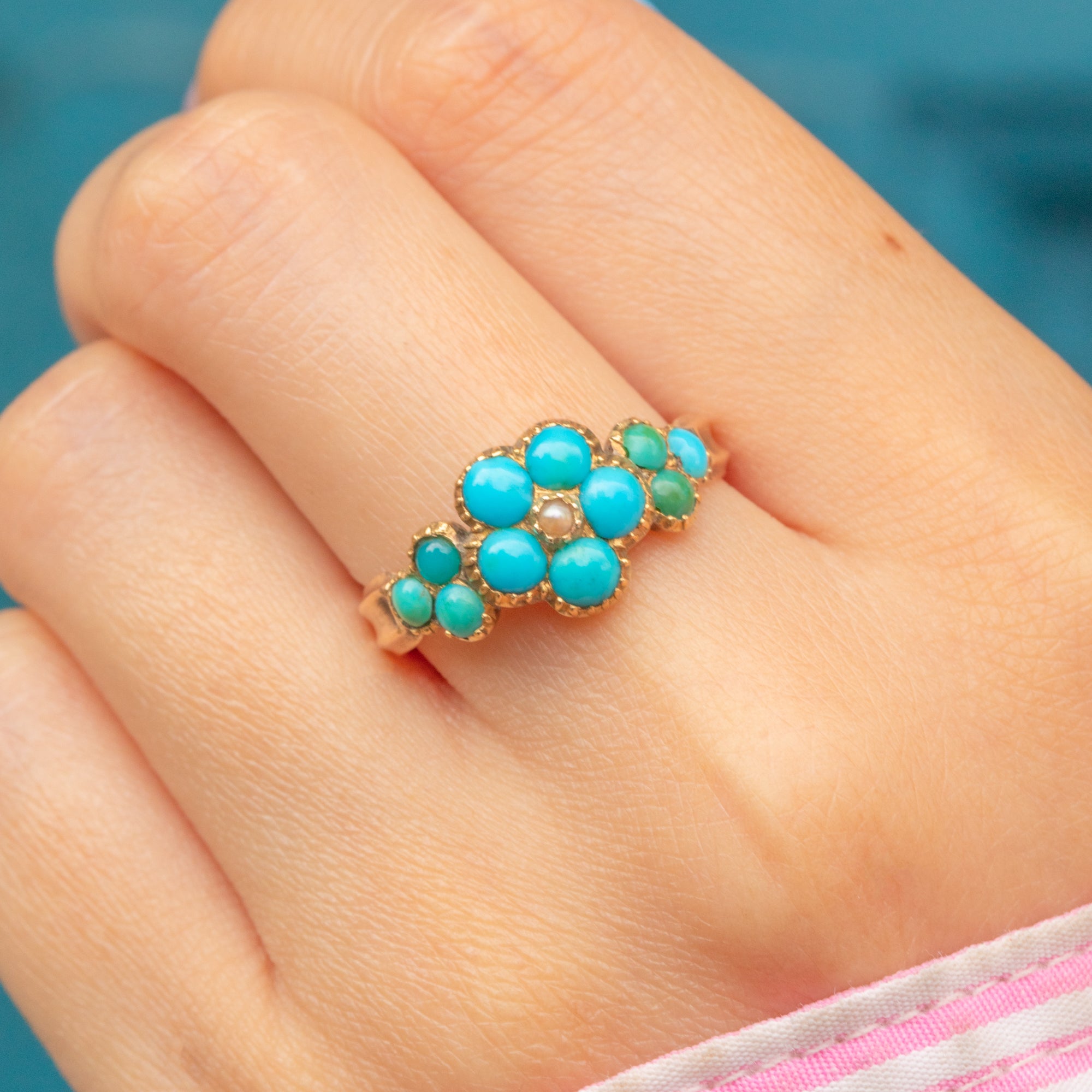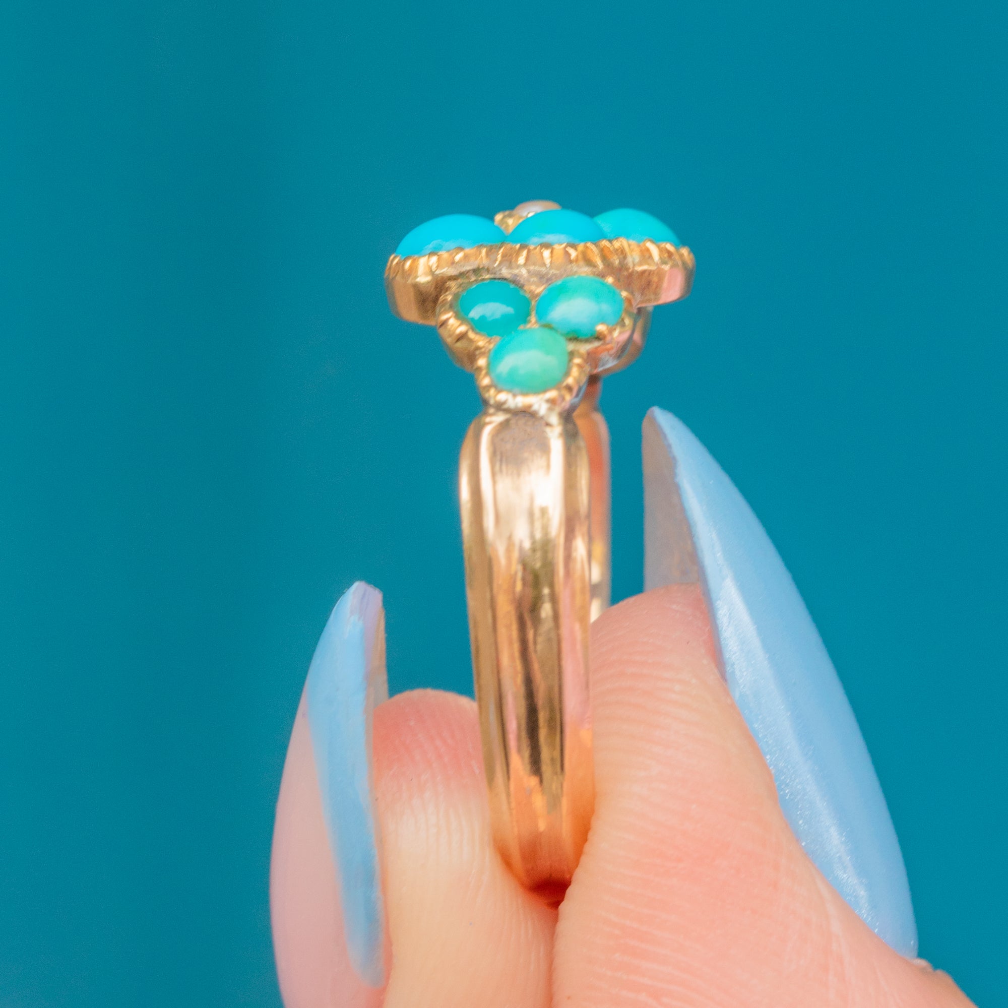 This antique cluster ring is crafted into an adorable forget-me-not cluster formation, with each Turquoise displayed within classically Georgian piecrust settings!