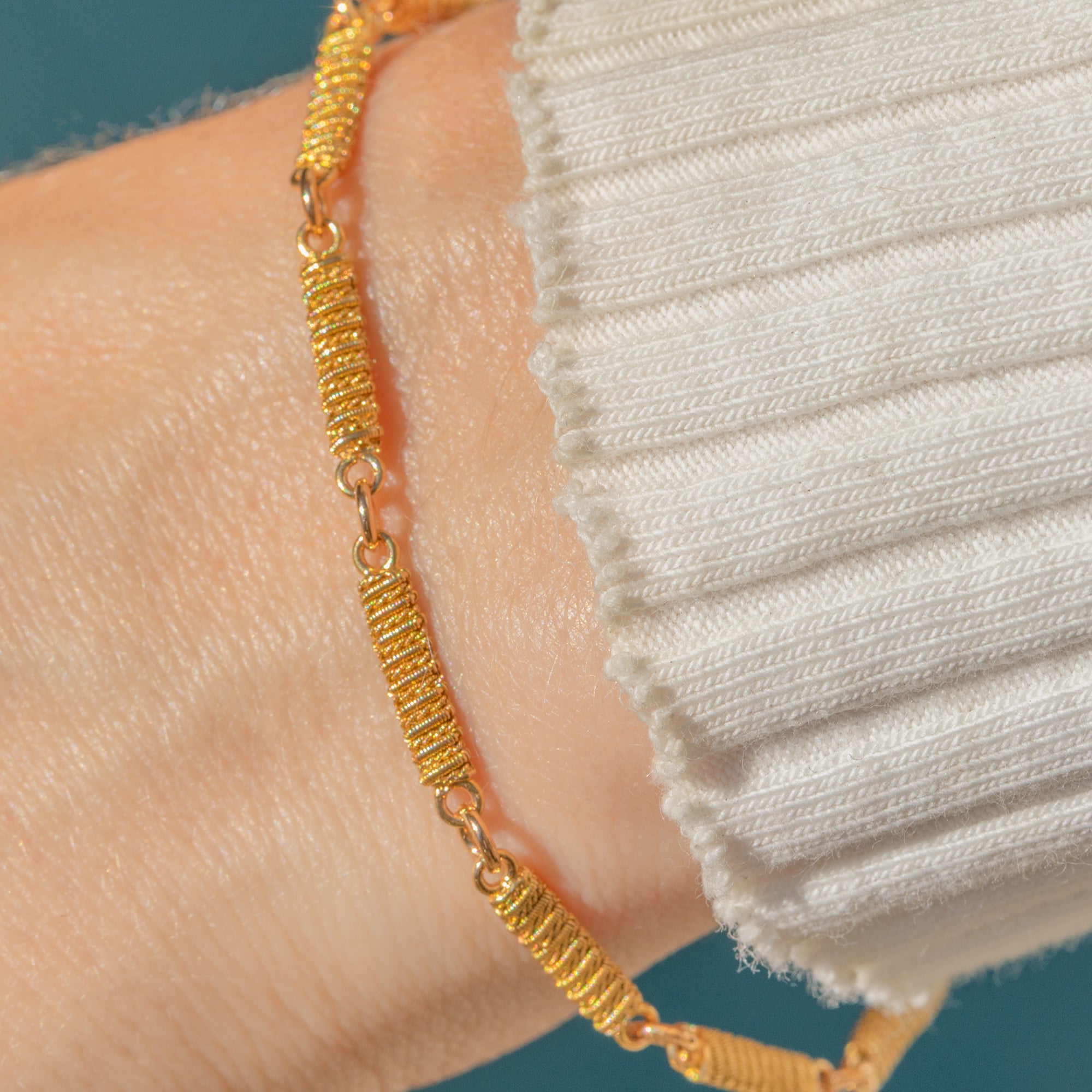 This exquisite antique solid 18ct Gold bracelet, dated 1780, features finely crafted cannetille Gold-work bar links, creating a rich texture and depth. Its warm, glossy finish has been beautifully preserved, showcasing the intricate detailing of each link.