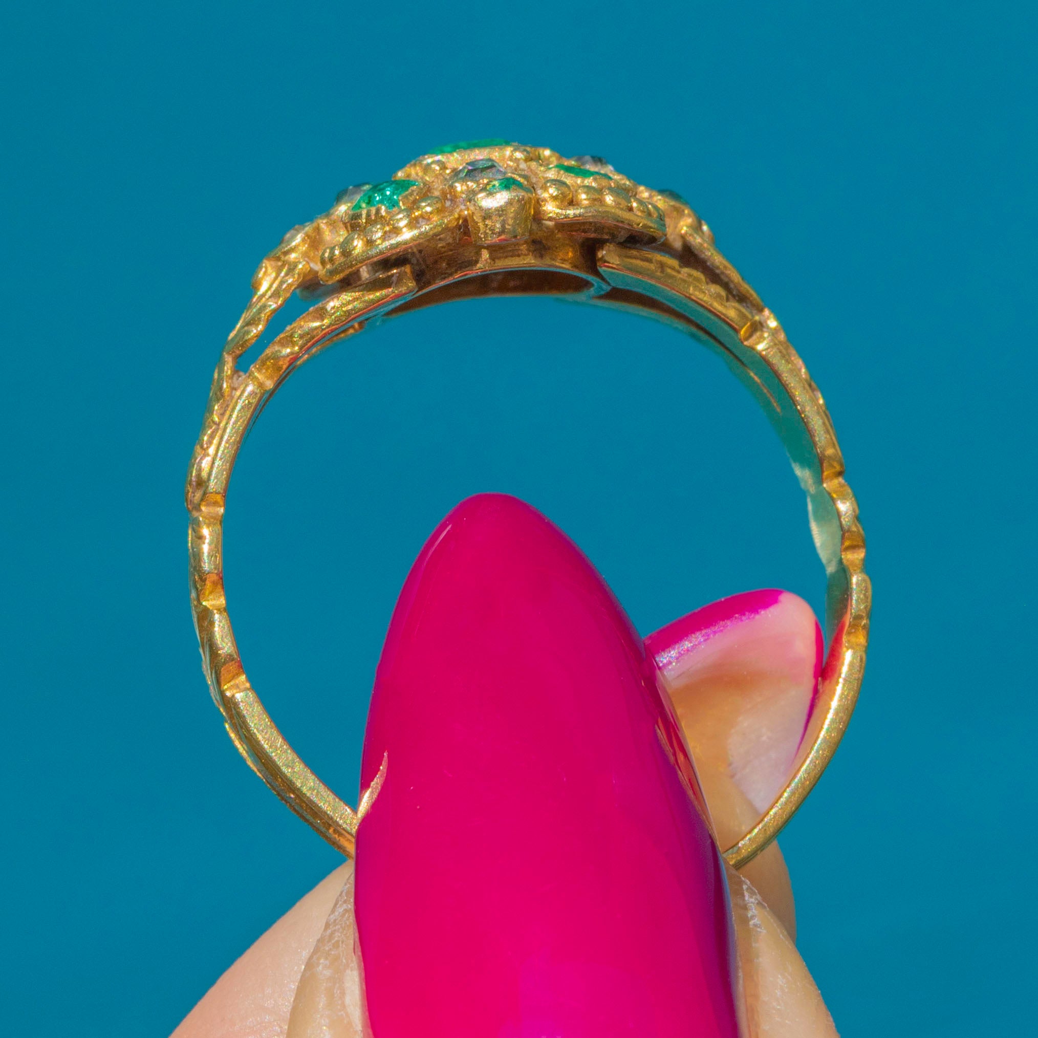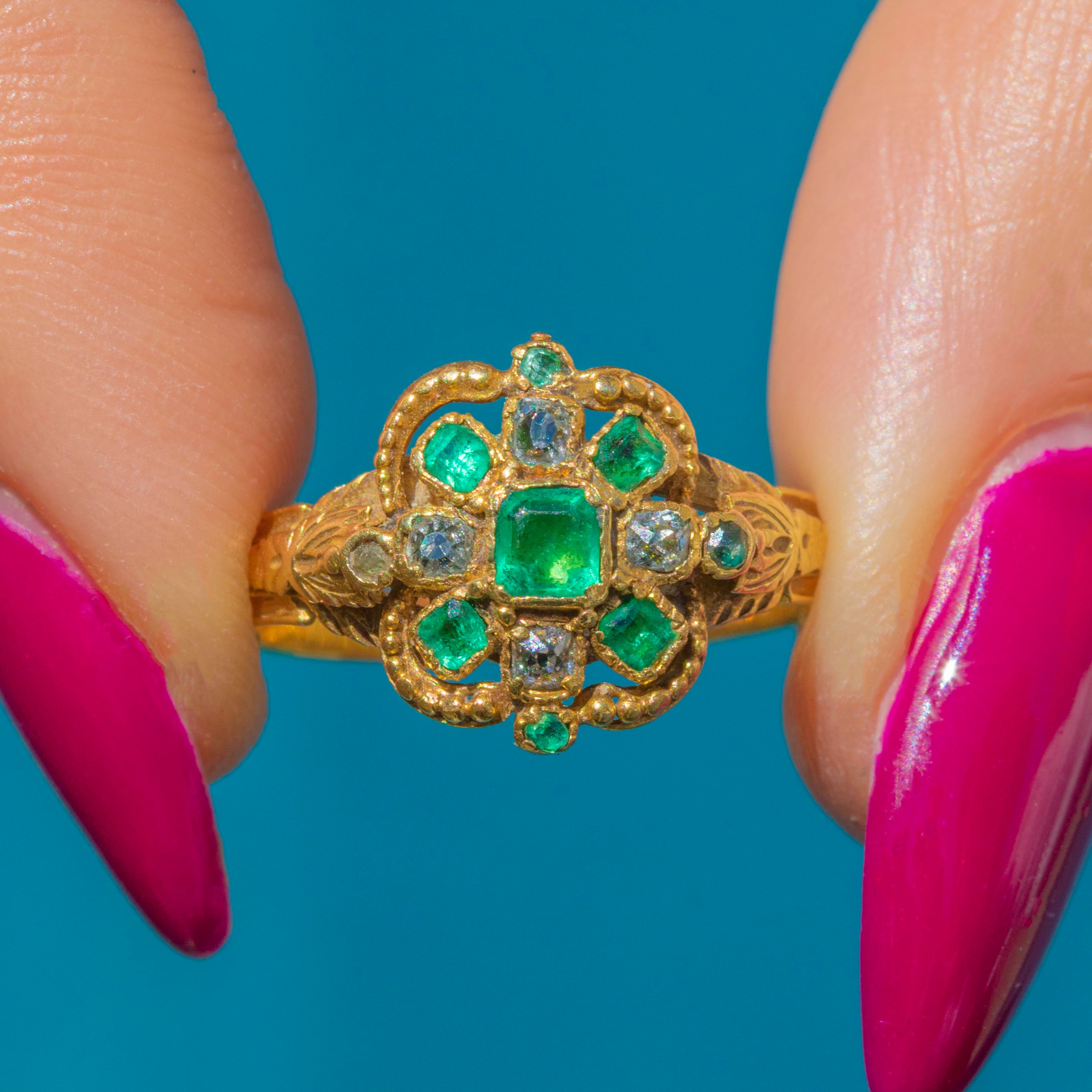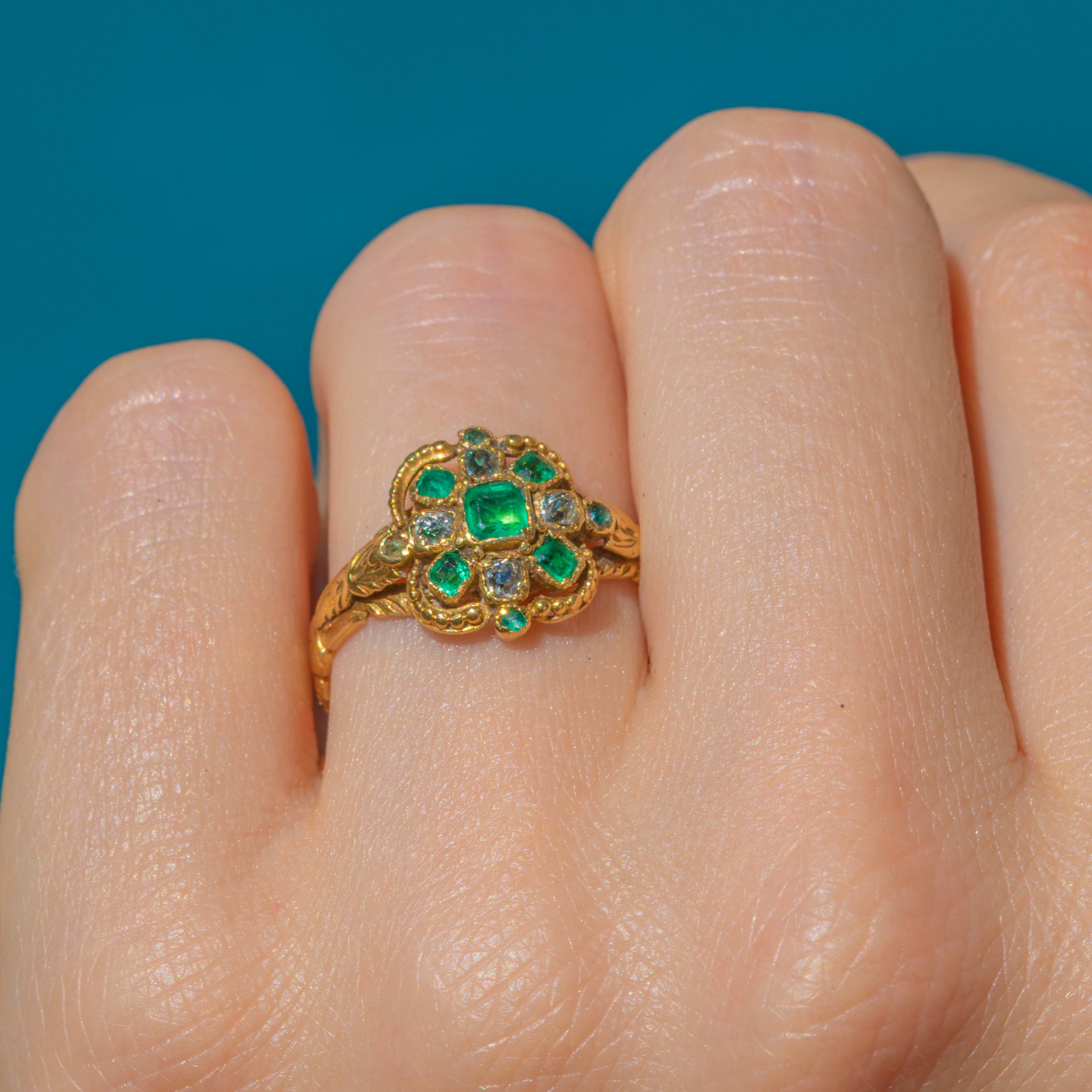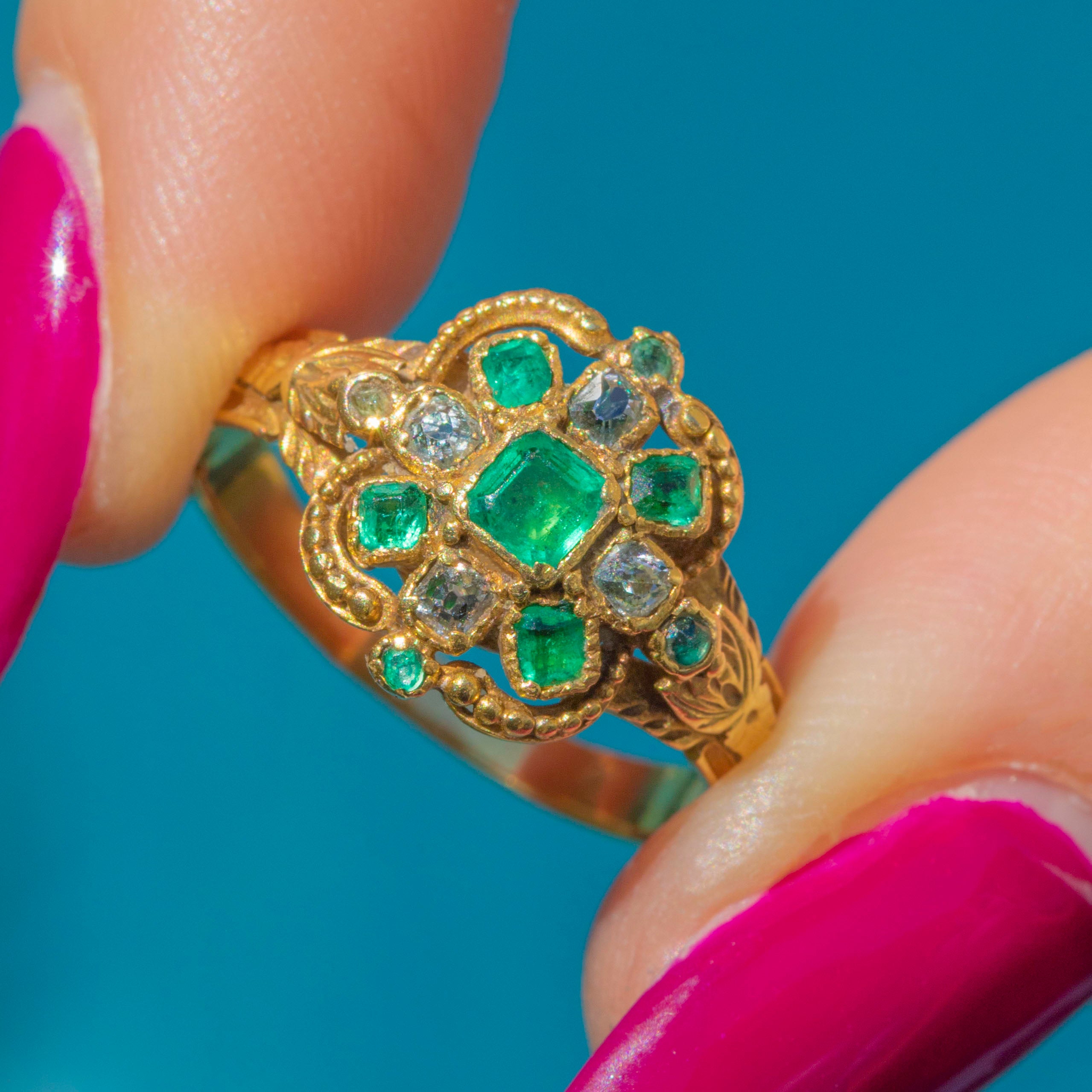 EXCELLENT: This Georgian ring is in sublime condition for its age. All of the gemstones are secure within their settings, with hardly any signs of wear to their facets, and the ring shoulders are immaculate. There is some variation in the colour of the Emeralds, an indicator of their natural essence.