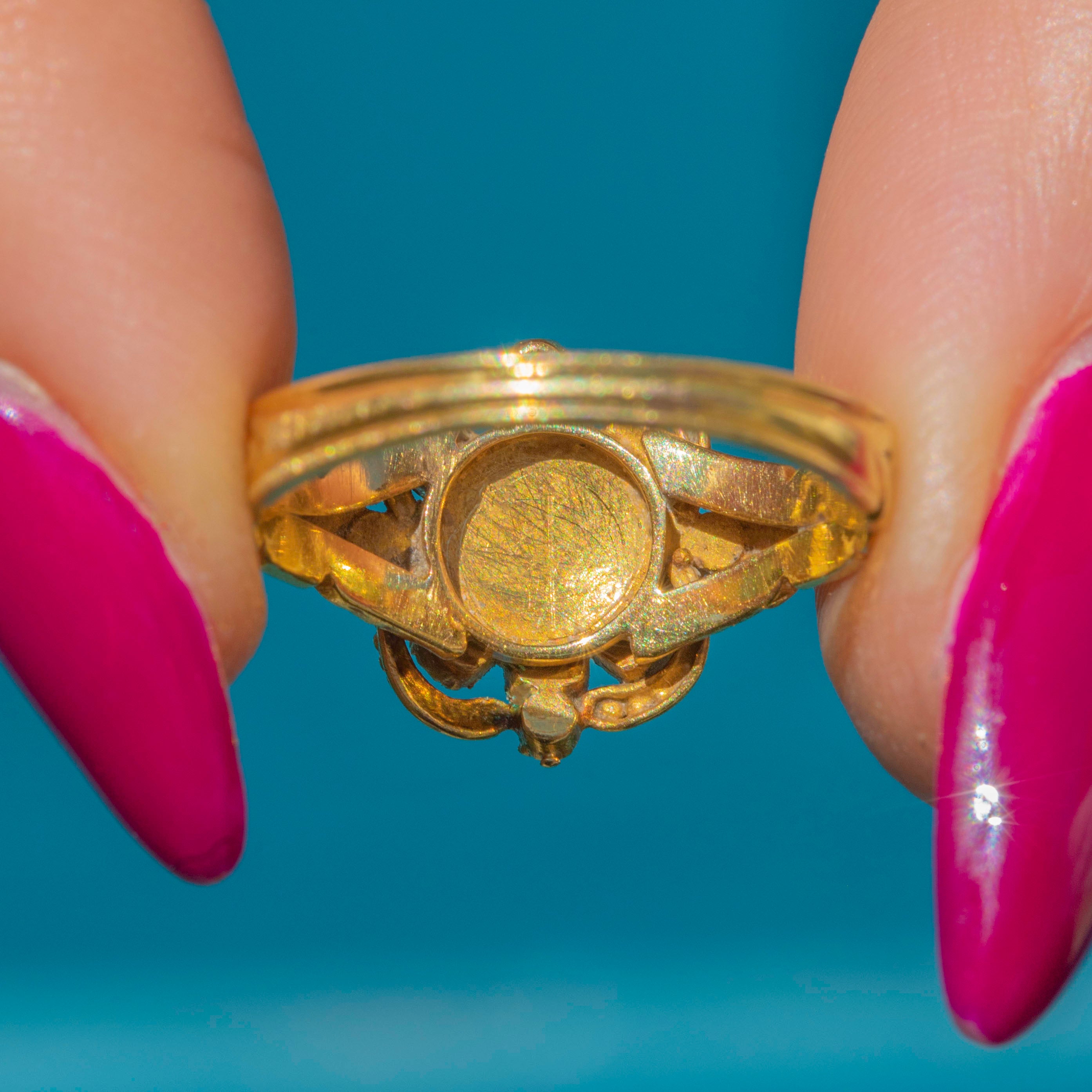 A peruzzi cut is an incredibly rare cut of Diamond, and a wonderful indicator of this ring's Georgian origin. This Georgian ring simply exudes grandeur- just look at those sparkling Diamonds and her openwork design on the cluster! The ornate ring shoulders add a certain decadence to this piece. She is a delightful one!