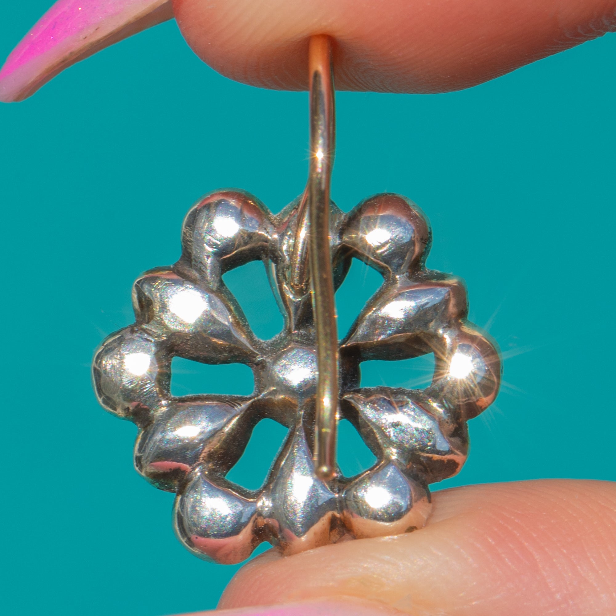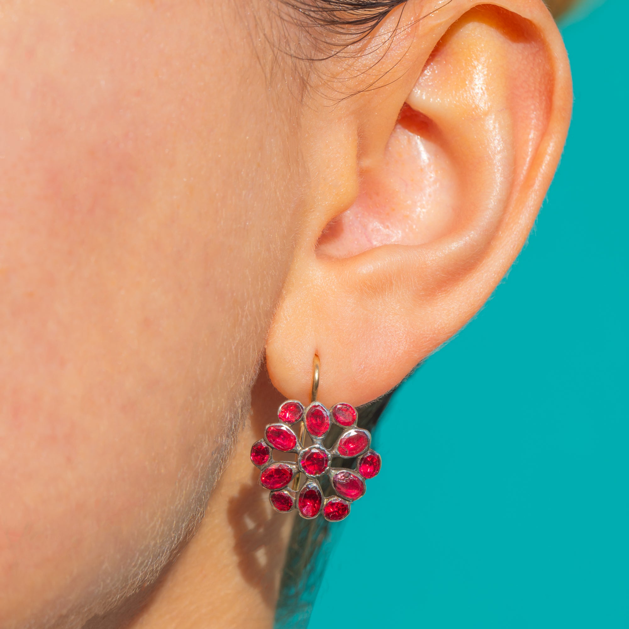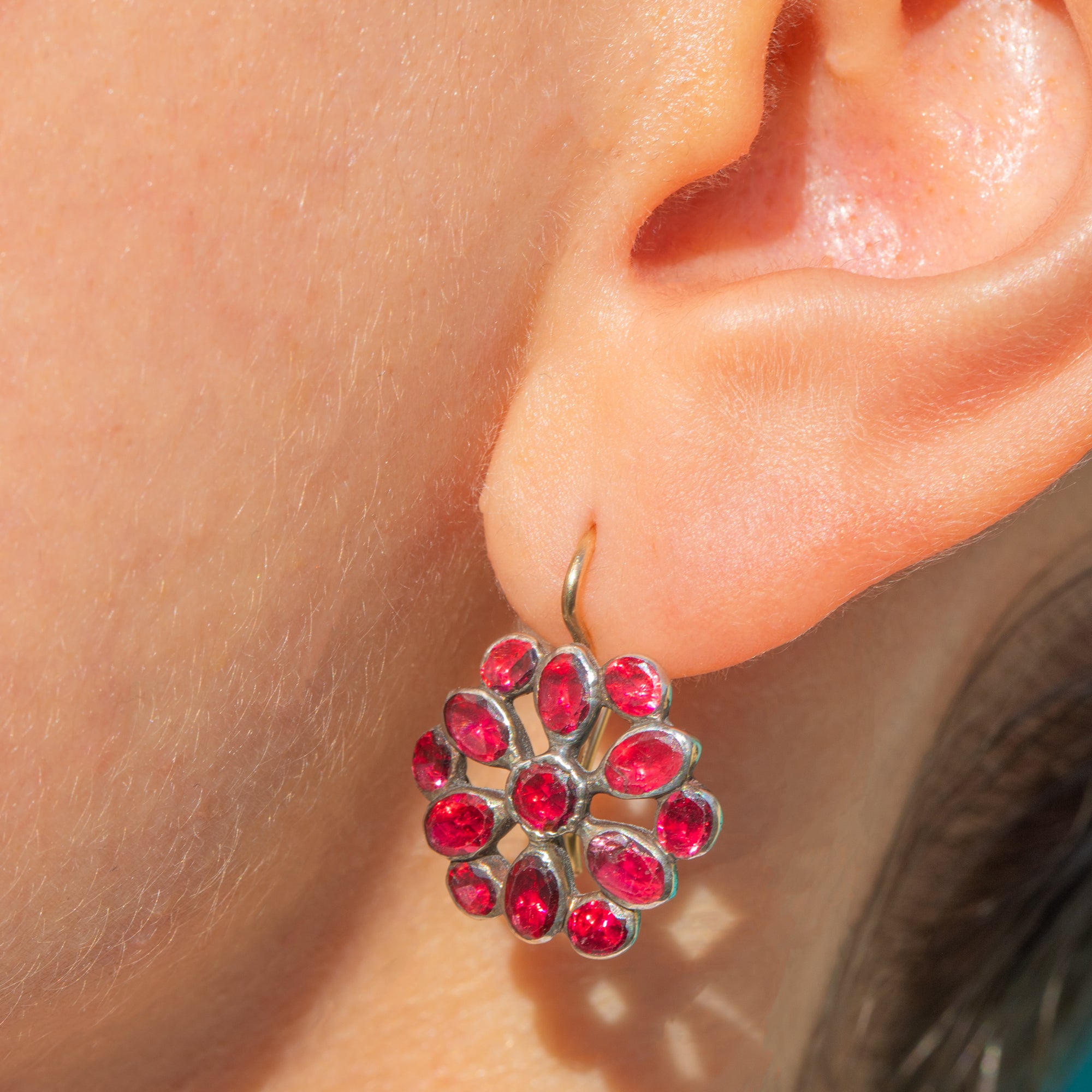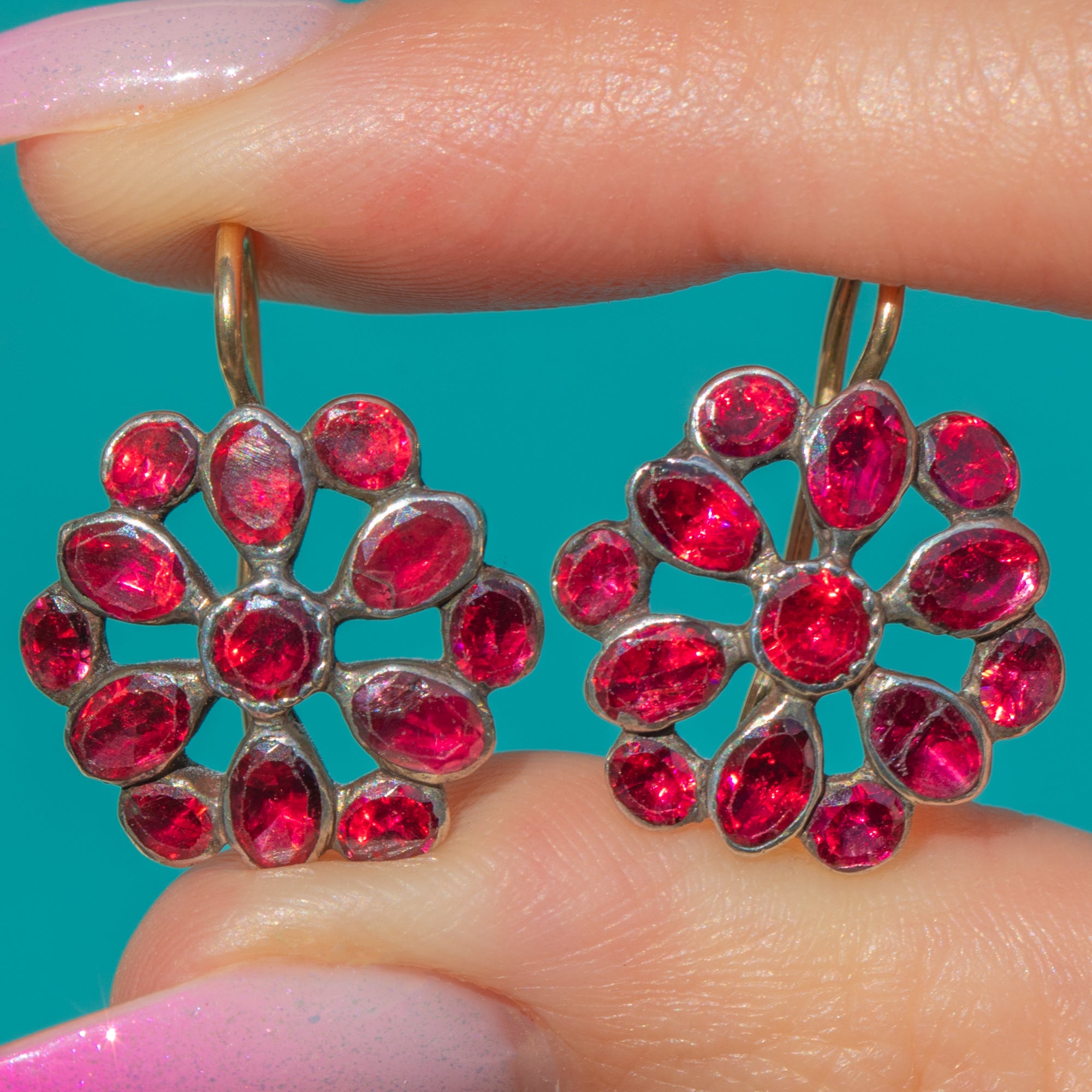 Alive with rich, wine-red glow, these Georgian Garnet cluster earrings bloom in a romantic floral rosette. Each stone is nestled in softly domed Silver collets, the cluster suspended from elegant 18ct Gold hooks for a refined two-tone finish. The result is a timeless drop with beautiful texture, depth and period charm.