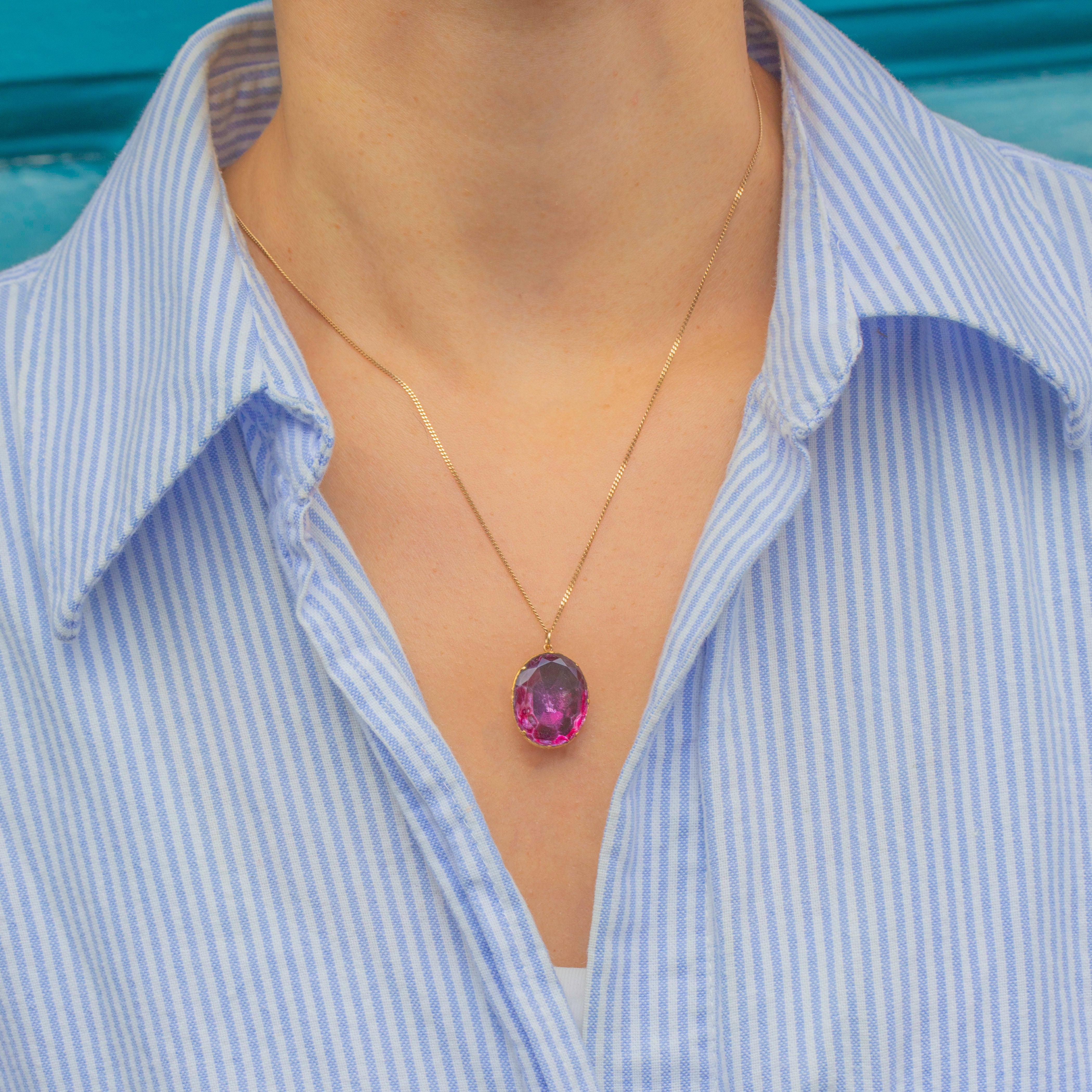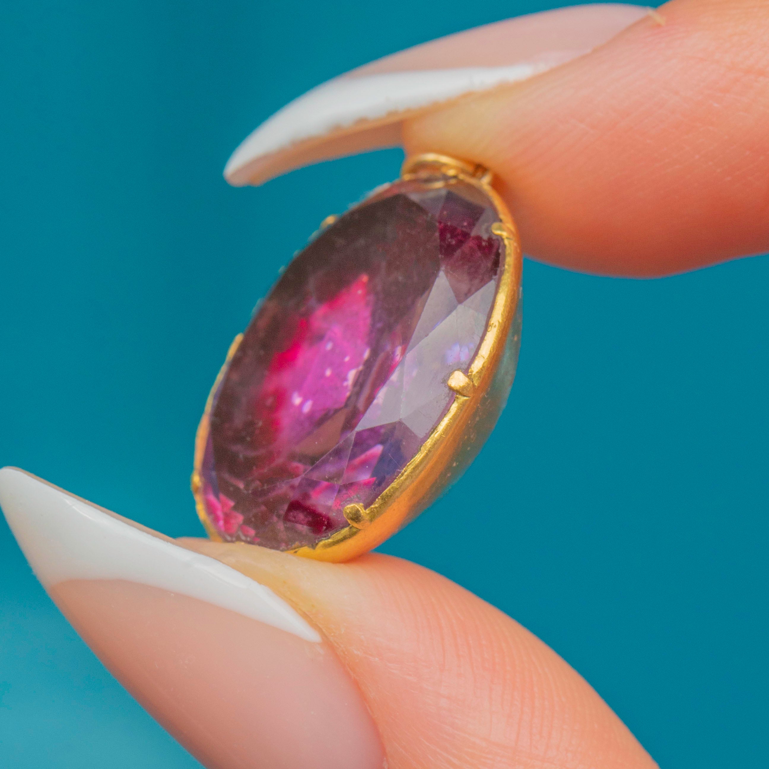 A luminous Georgian Amethyst pendant in rich 18ct Gold. The large, foil-backed oval Amethyst sits in a hand-made collet with neat claw tips, its magenta-purple glow enhanced by the original closed back. The reverse is engraved with a delicate monogram—pure period romance in wearable form.