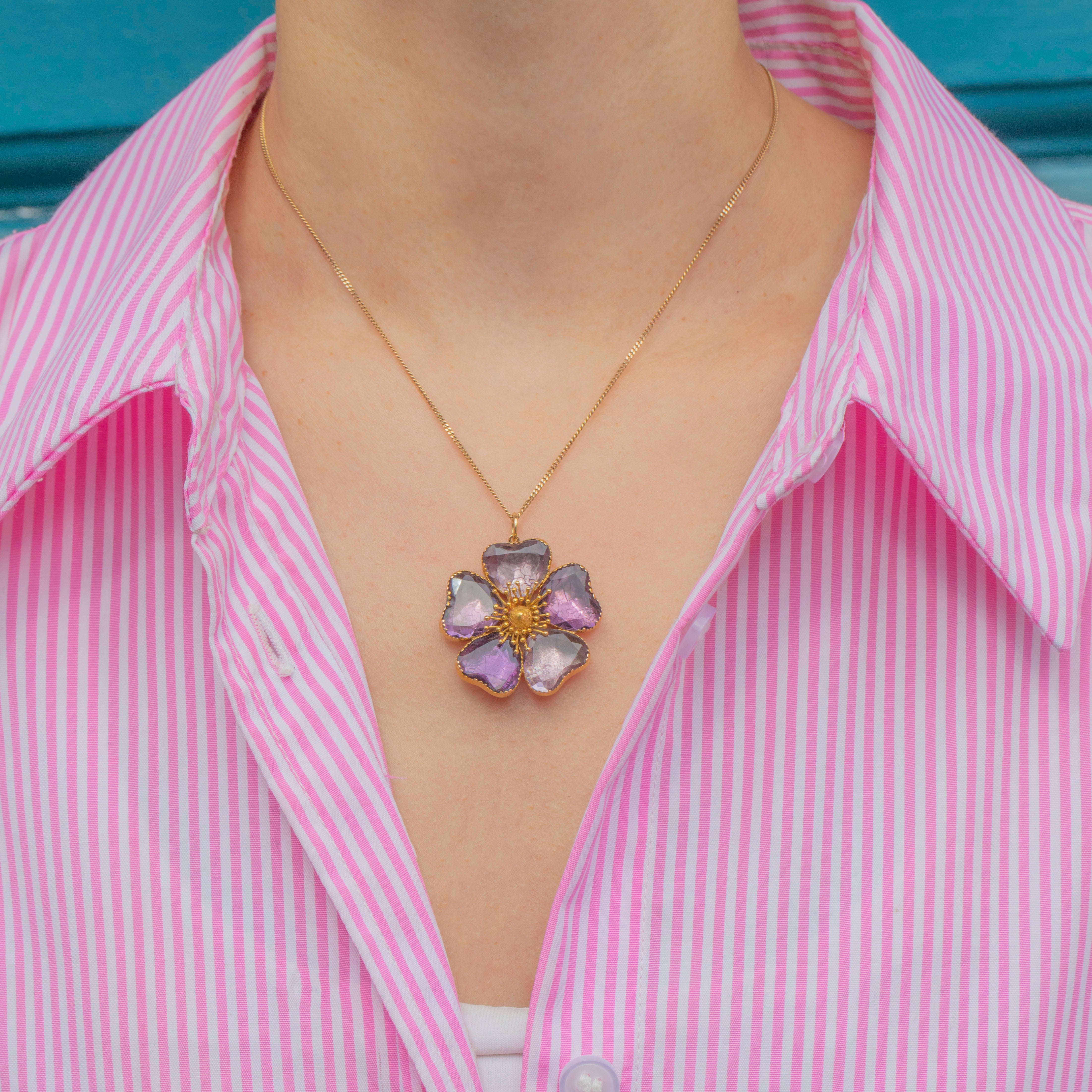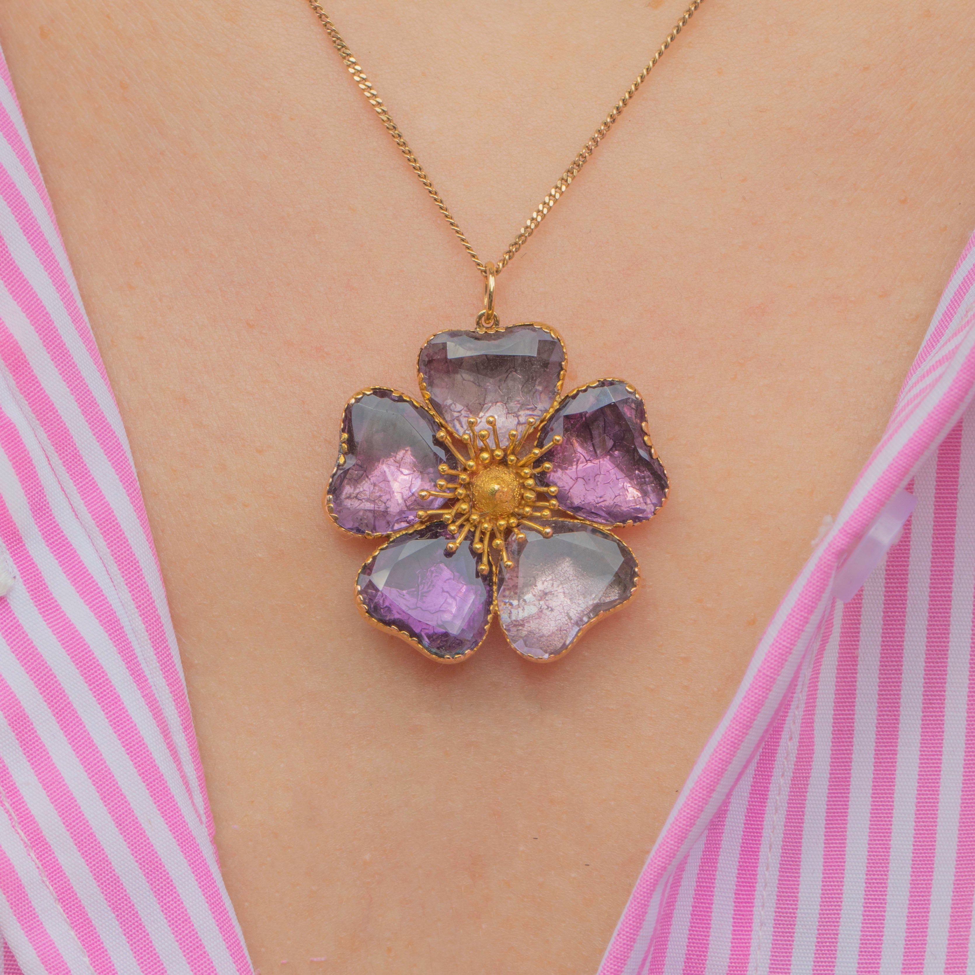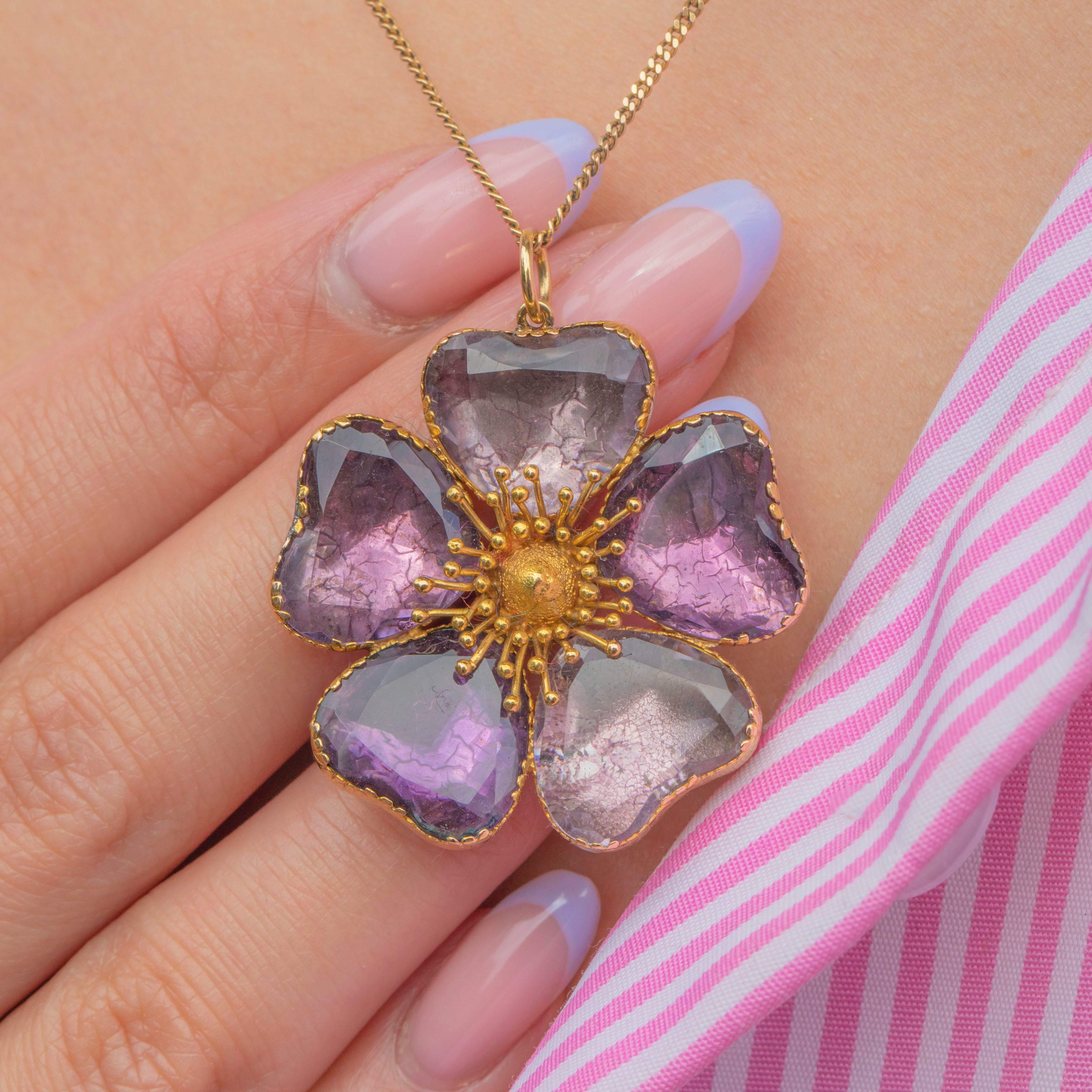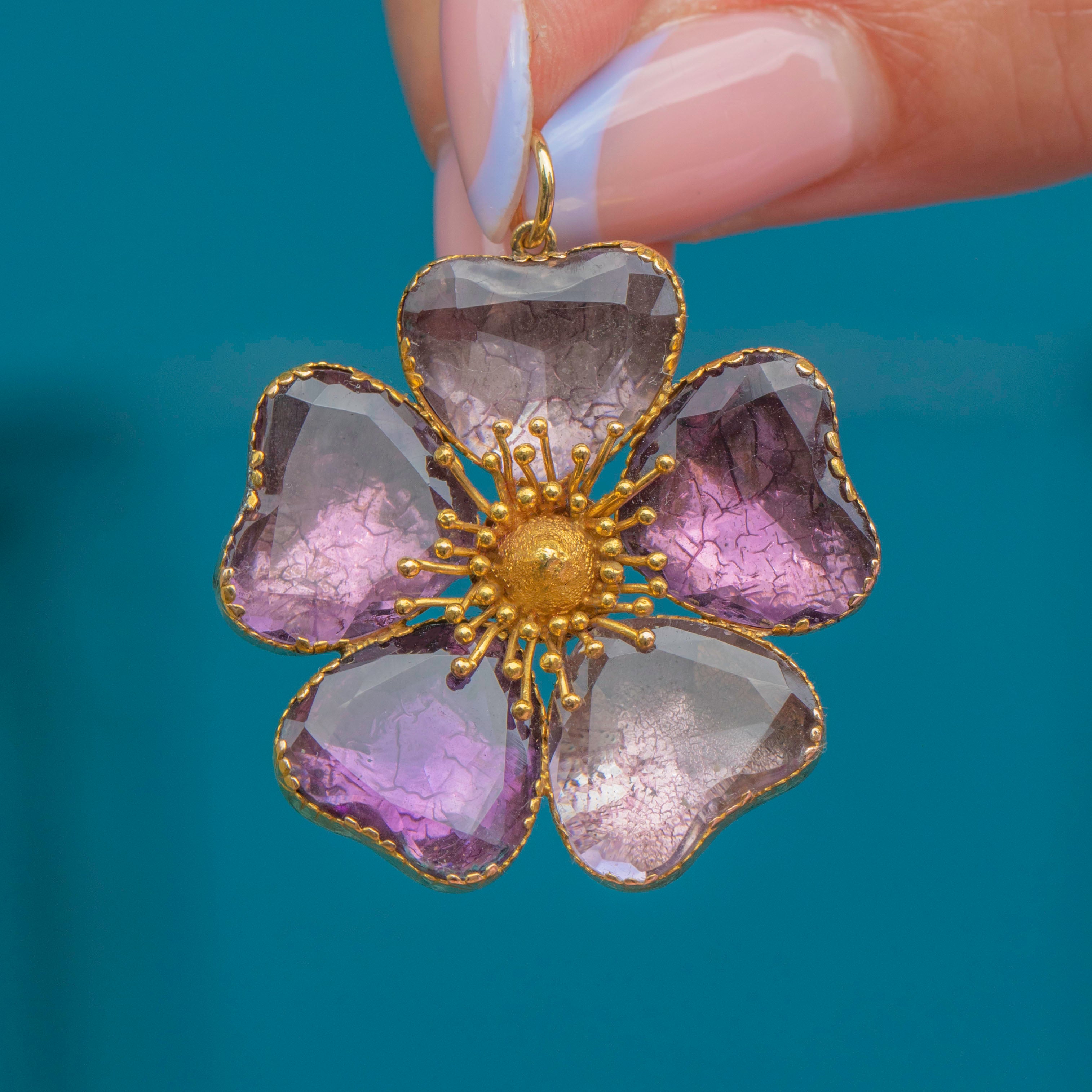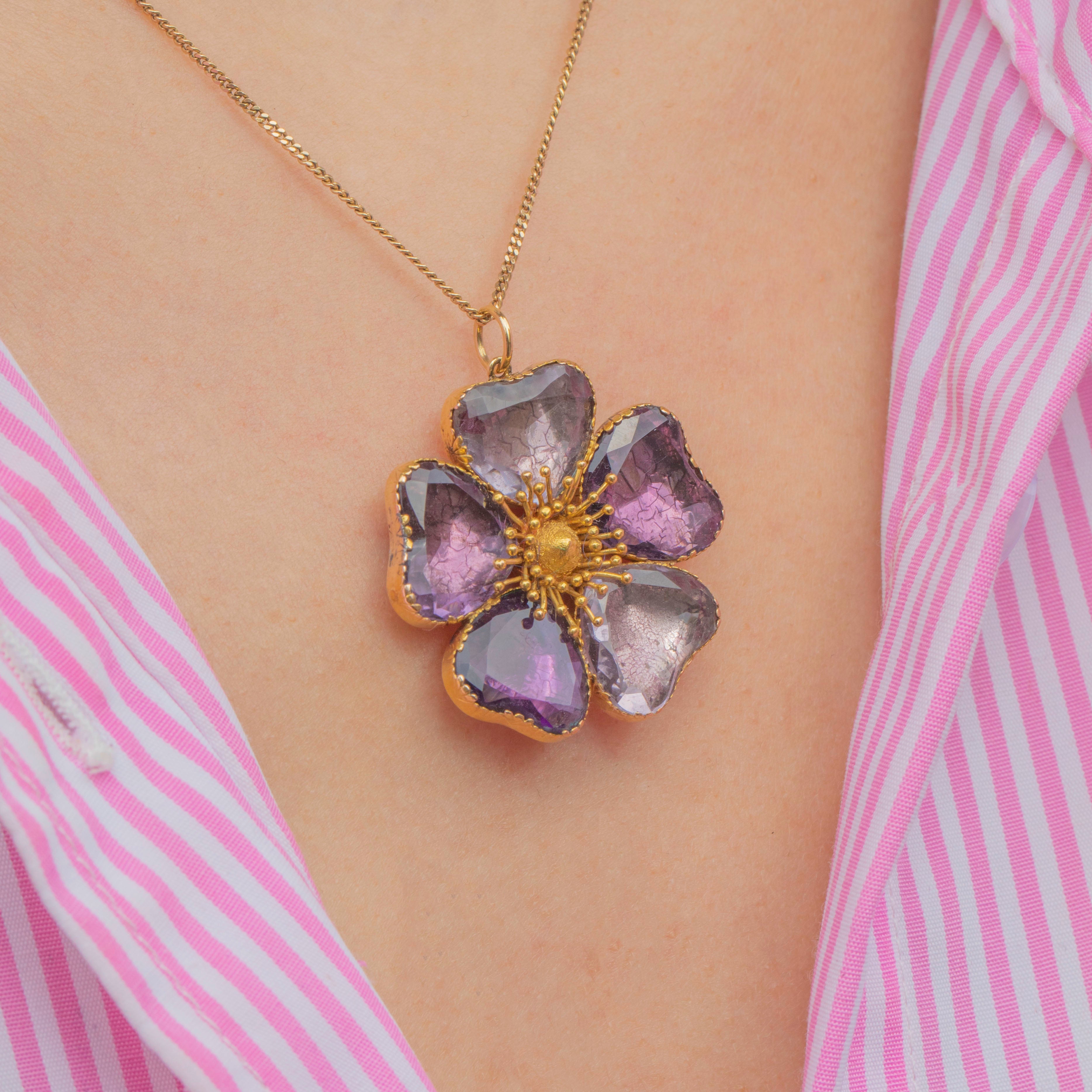 Radiating a resplendent vibrancy, this large antique wild rose pendant flaunts five foiled Amethysts as her petals, each with distinct lavender and lilac hues - foiled in quintessential Georgian style for added radiance.