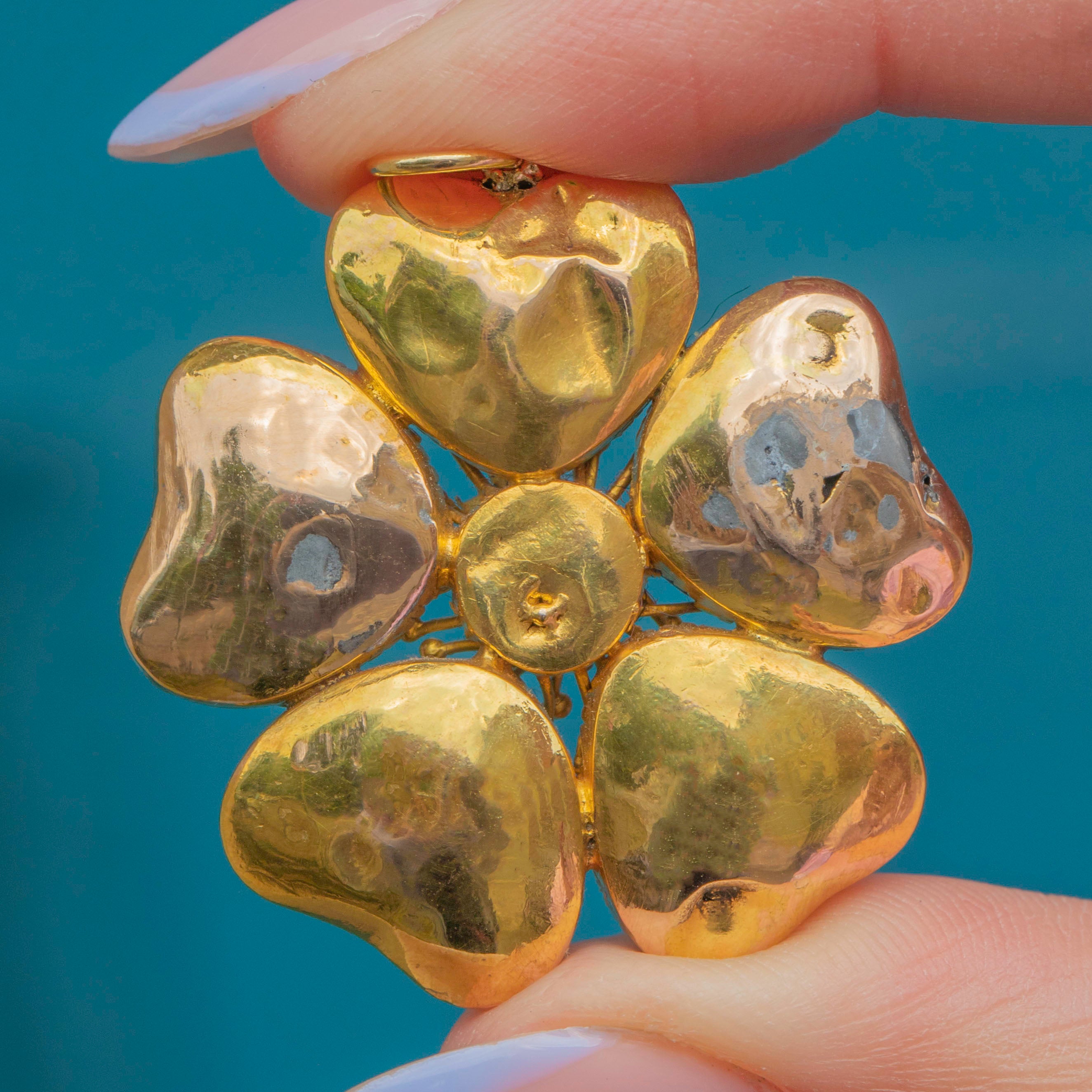 GOOD: This Georgian 18ct Gold foiled Amethyst wild rose pendant is in good condition. The front of the pendant is near perfect, with each foiled Amethyst free from any scuffs or scratches and sitting secure in their settings. There are some significant signs of wear to the back of the pendant, including dents and discolouration to the Gold and evidence of a brooch conversion. However, this cannot be seen when the pendant is worn and does not affect her wearbility. With a securely soldered jump ring, this Georgian pendant can be worn with utmost confidence.