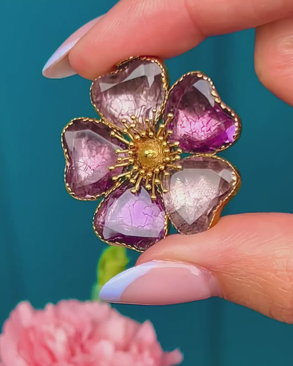 Each Amethyst is set within warm 18ct Gold settings and centred by an 18ct Gold detailed stamen, its Golden hue complimenting the cool toned Amethysts wonderfully.