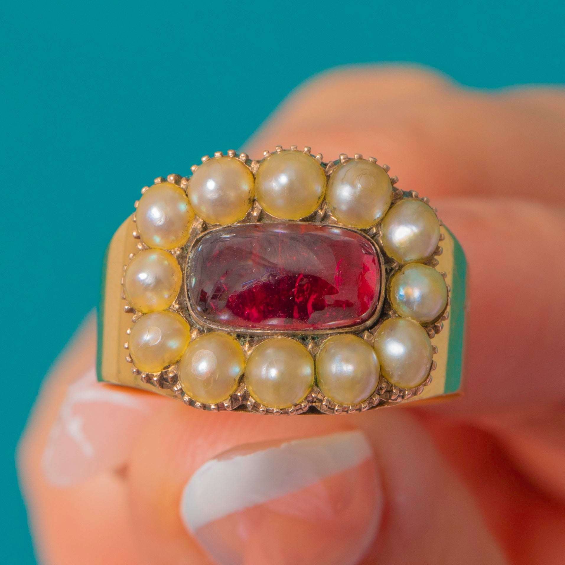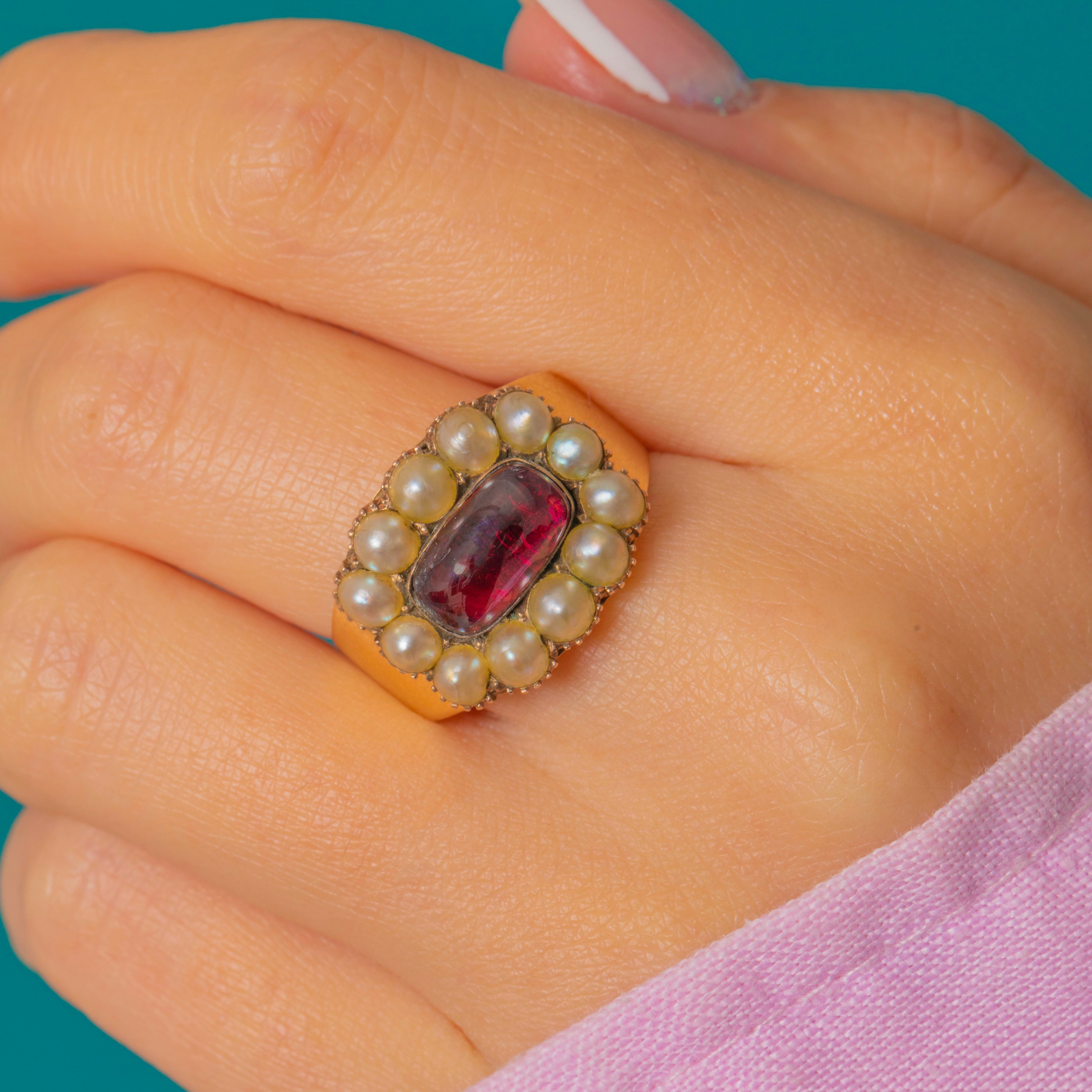 18ct Gold Georgian Garnet Cabochon Pearl Cluster Ring 1.60ct, c.1814 Item added