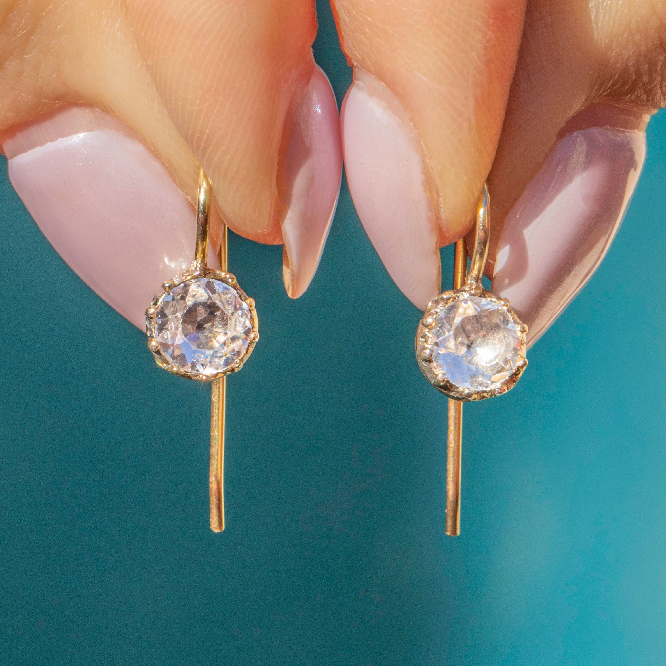 Beautifully crafted, these antique earrings feature dazzling Paste stones that capture the light as they suspend delicately below your lobes. Complimented effortlessly by the warm hues of the gilded 18ct yellow Gold, the expertly hand-cut Paste are held securely in place by their piecrust settings.