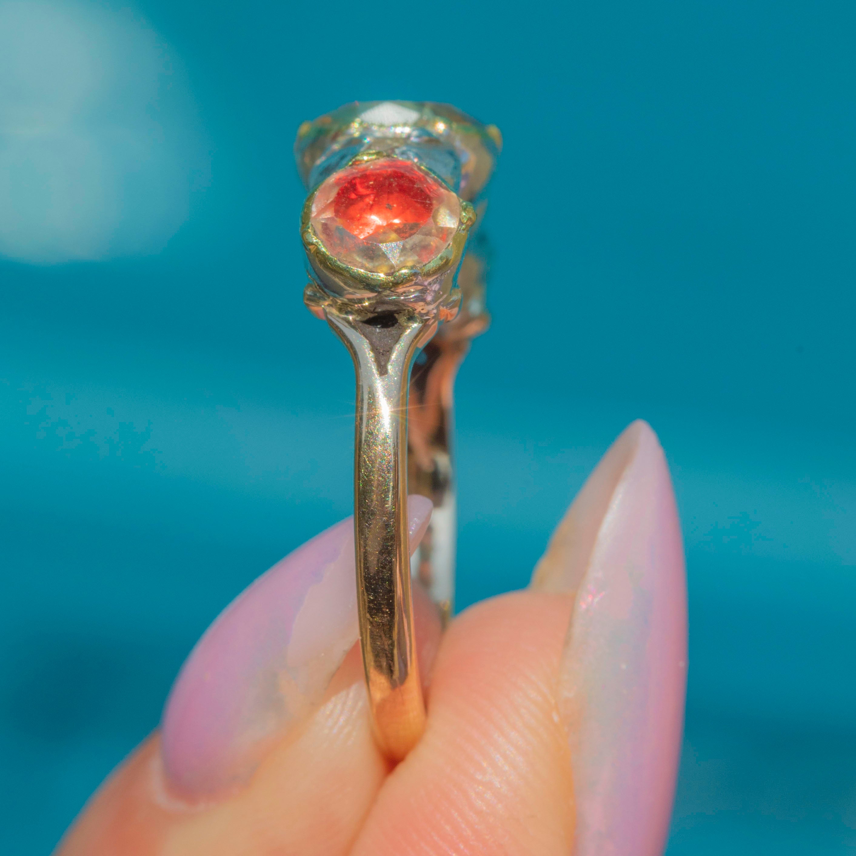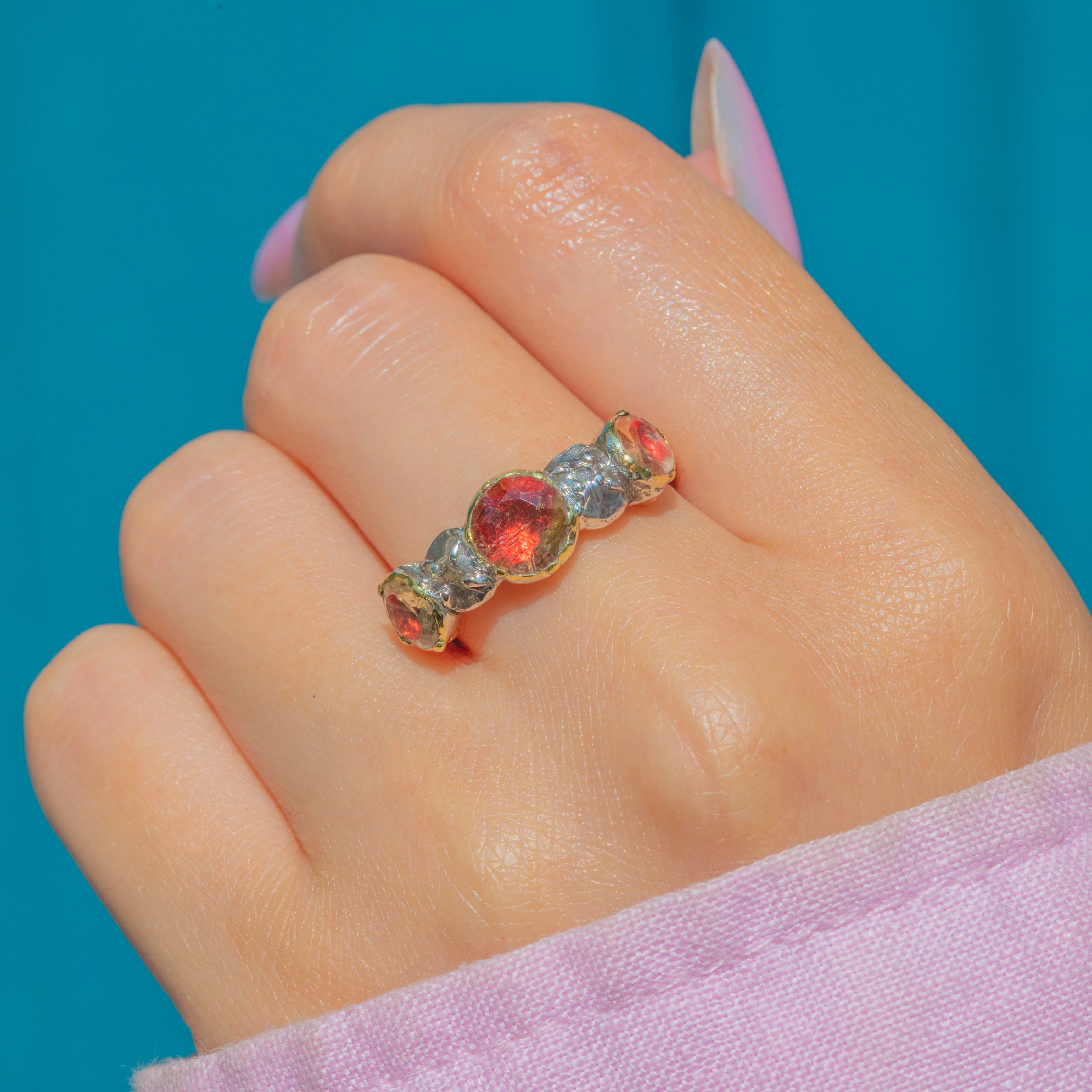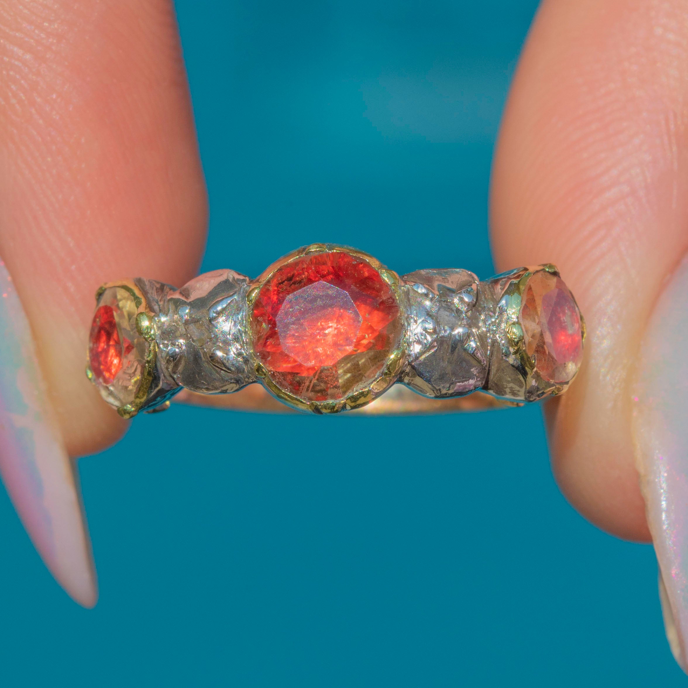 The ring is centred by three Oil & Vinegar Citrine stones, characterised by its distinctive dual red and yellow tone - split like oil and vinegar. Each Citrine is flanked by a scintillating rose-cut Diamonds and is married together by the warmth of the buttery 18ct Gold band.