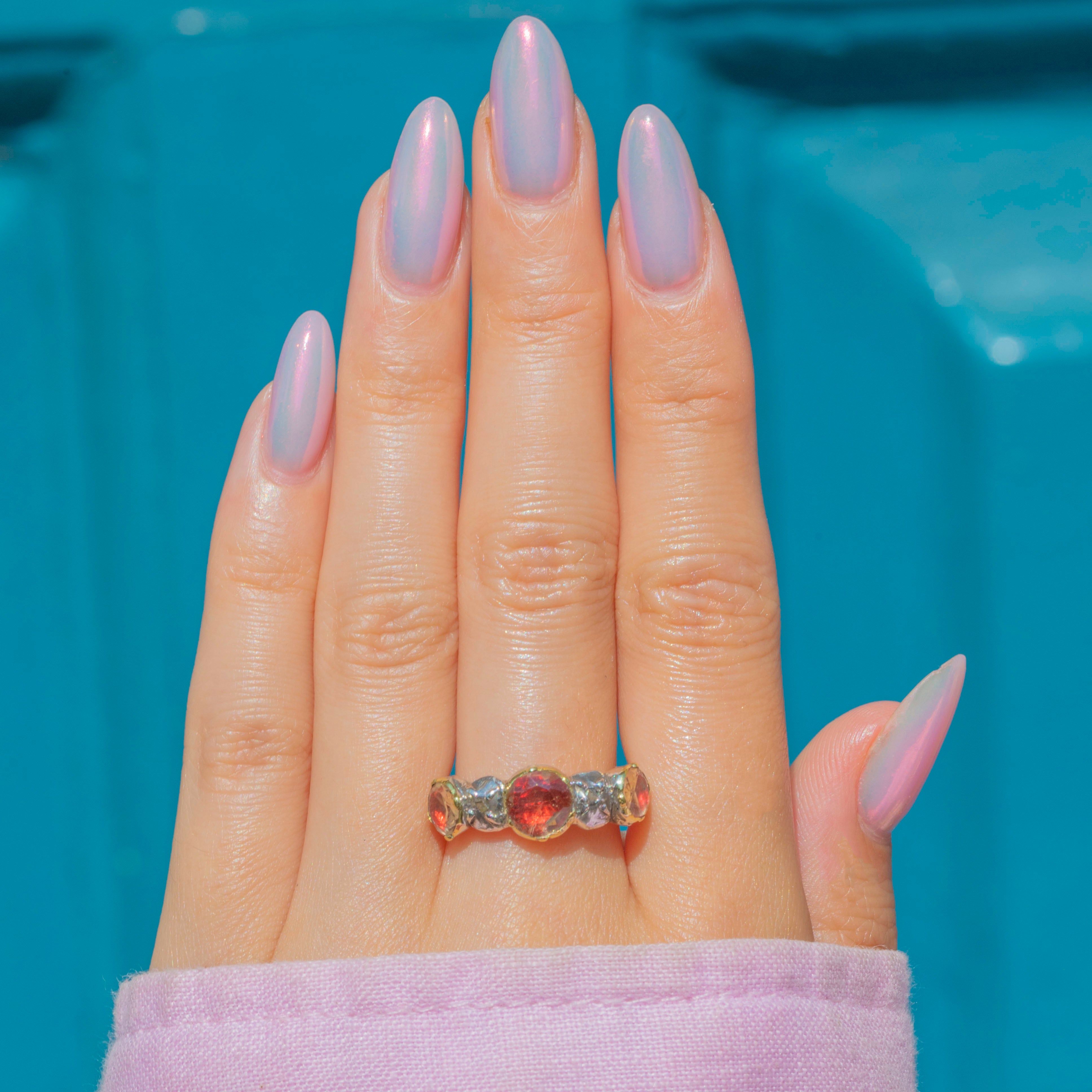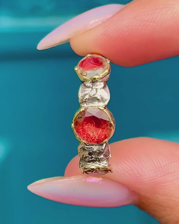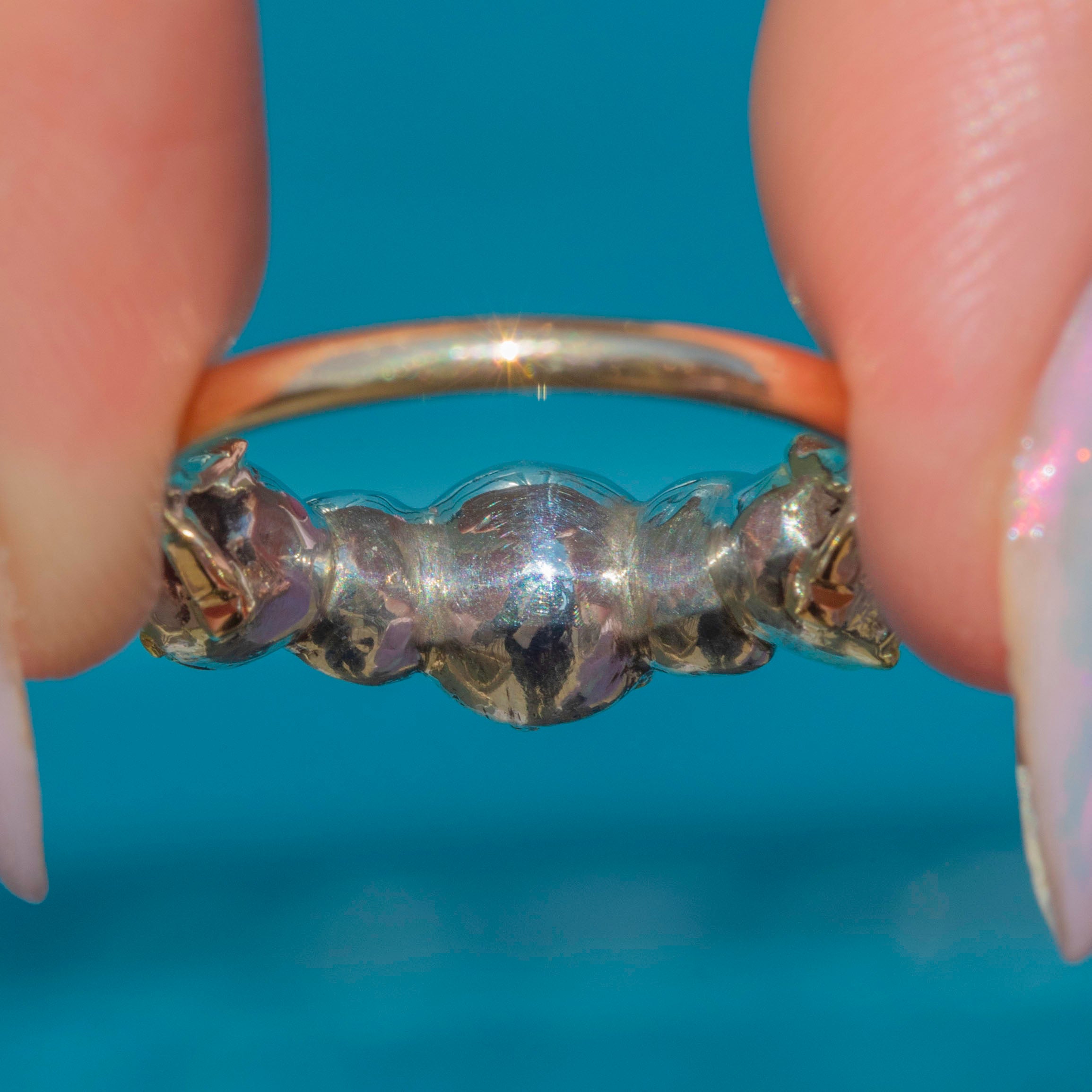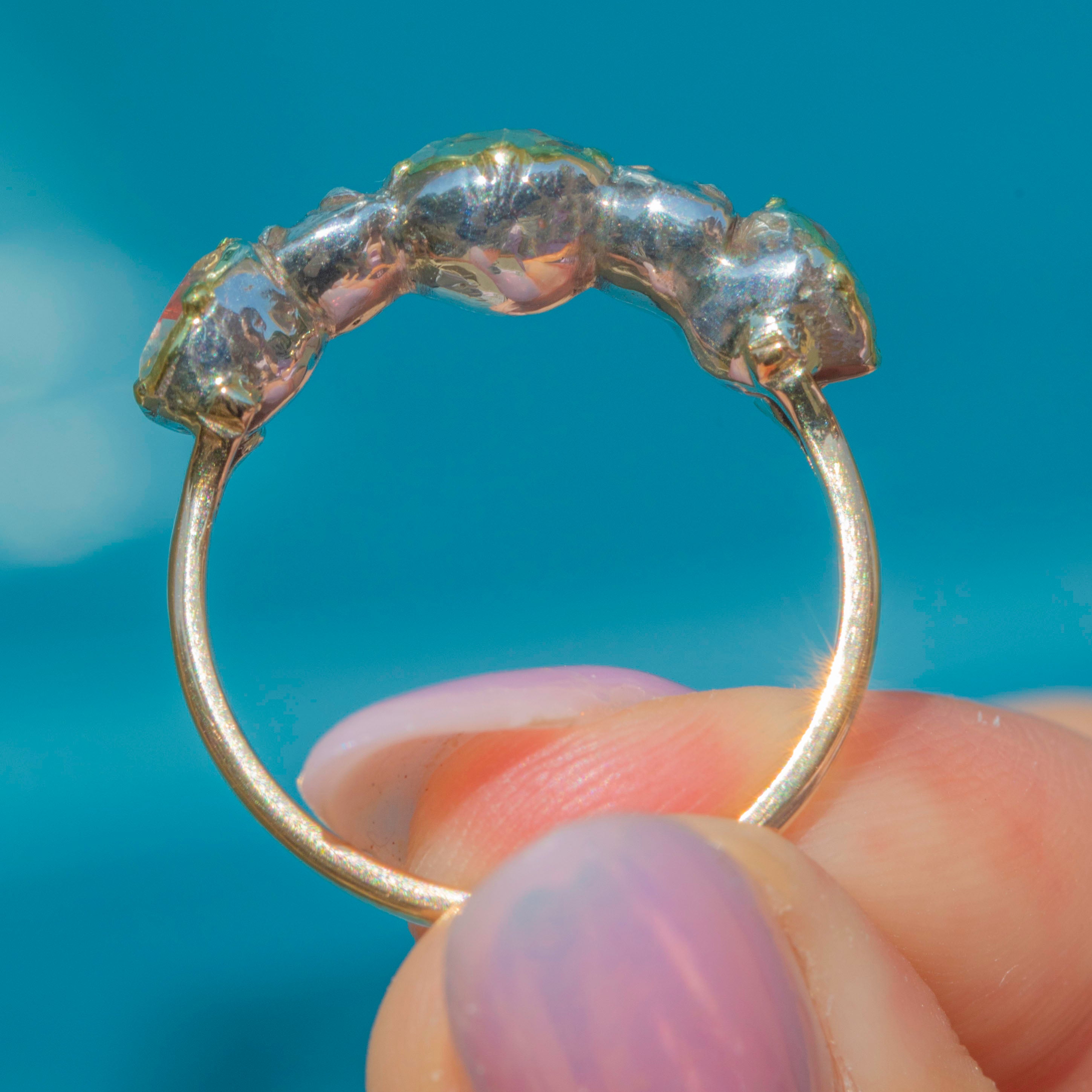 The ring is centred by three Oil & Vinegar Citrine stones, characterised by its distinctive dual red and yellow tone - split like oil and vinegar. Each Citrine is flanked by a scintillating rose-cut Diamonds and is married together by the warmth of the buttery 18ct Gold band.