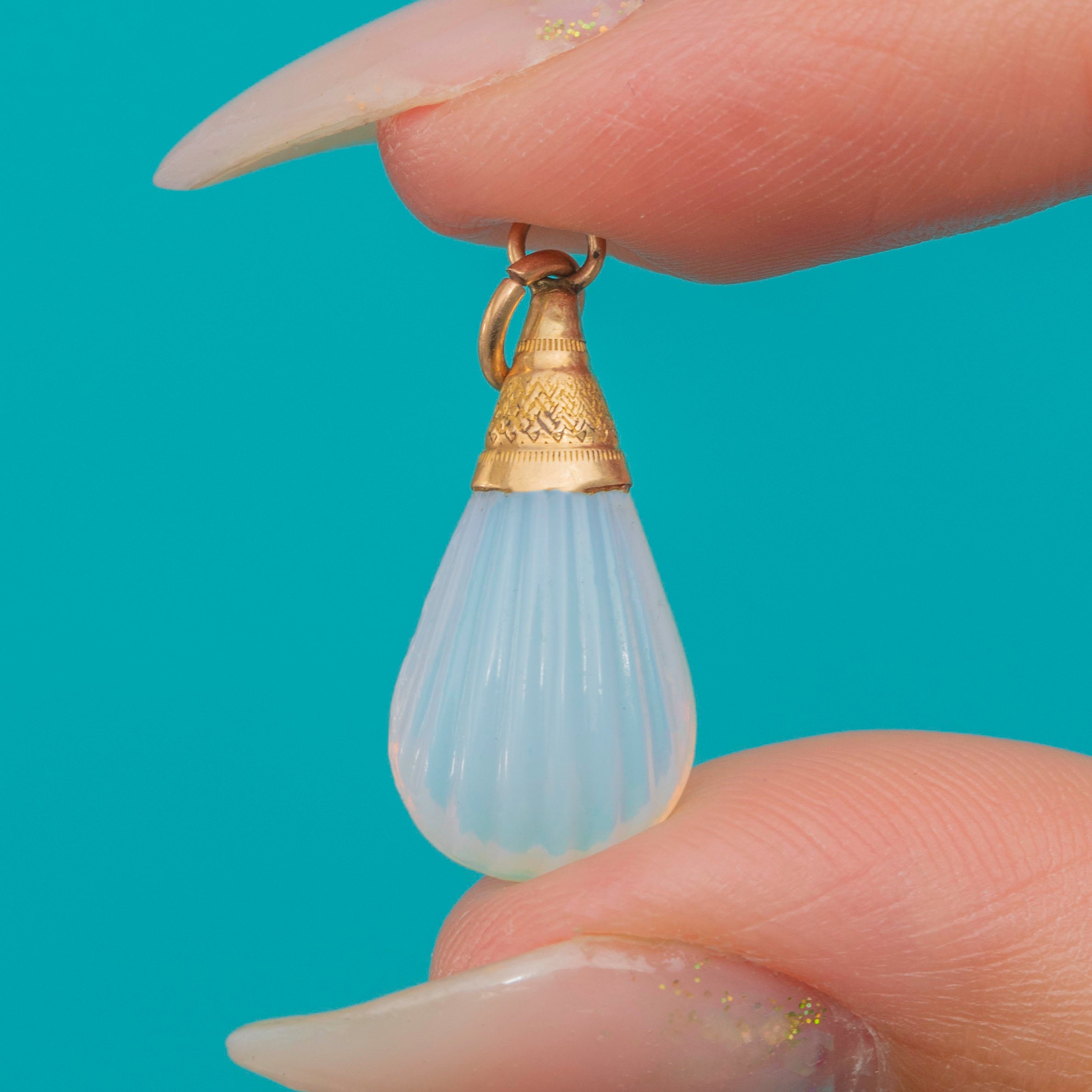 A delicate Georgian era pendant crafted in 18ct Gold, designed in the form of a scallop shell with a glowing and magical Opaline glass teardrop charm. The softly rounded form catches the light beautifully, giving the piece an ethereal shimmer that contrasts with the warm Gold frame.