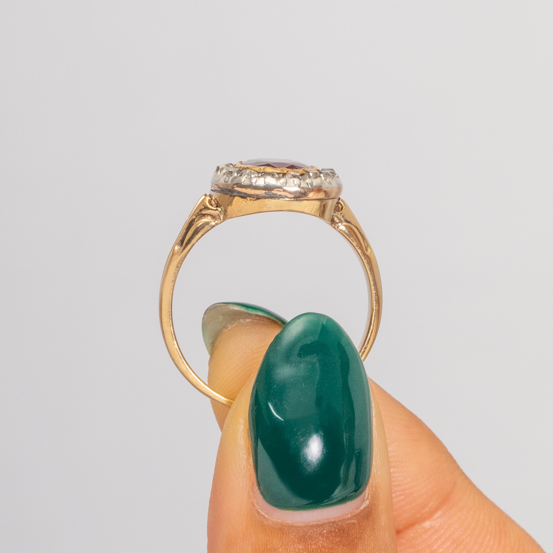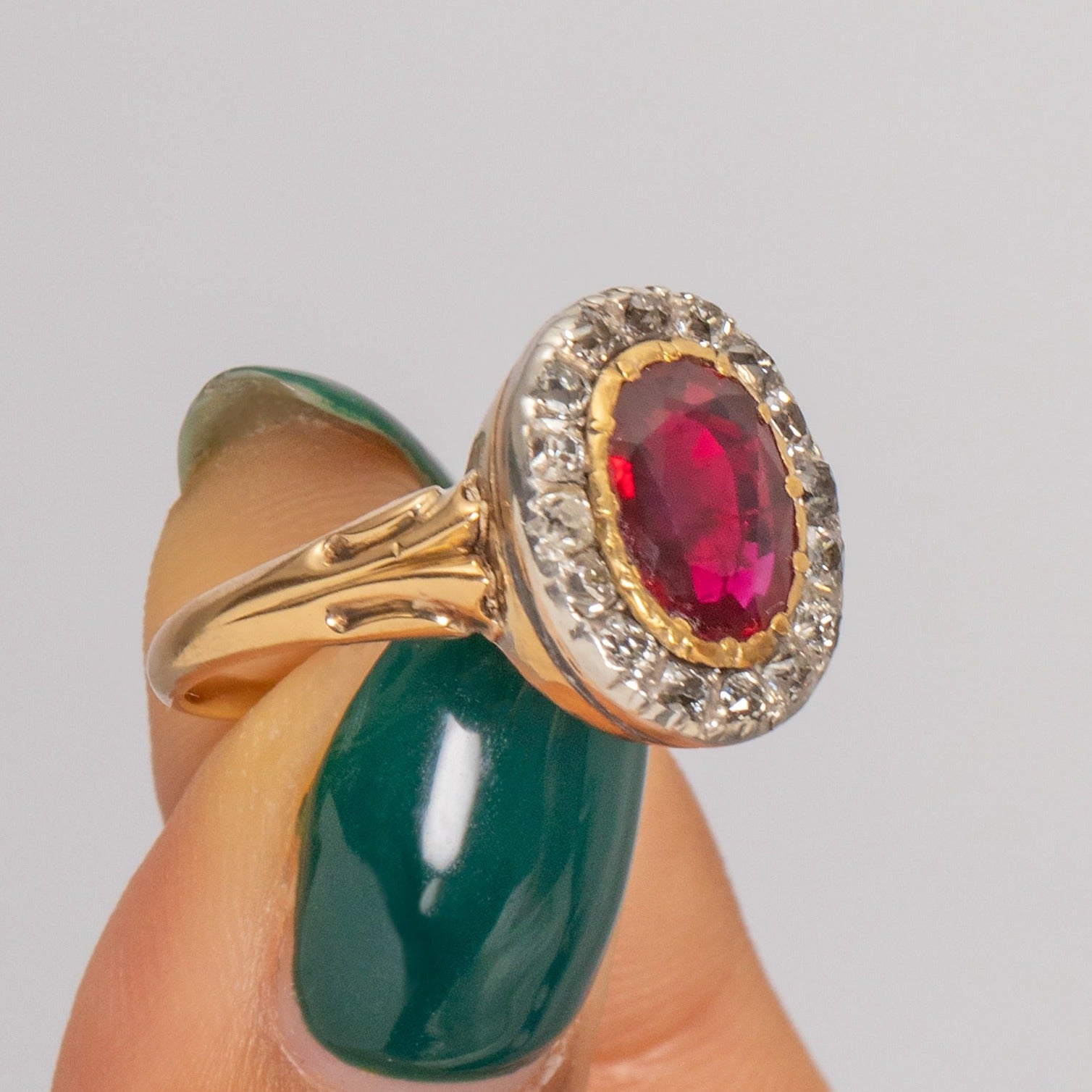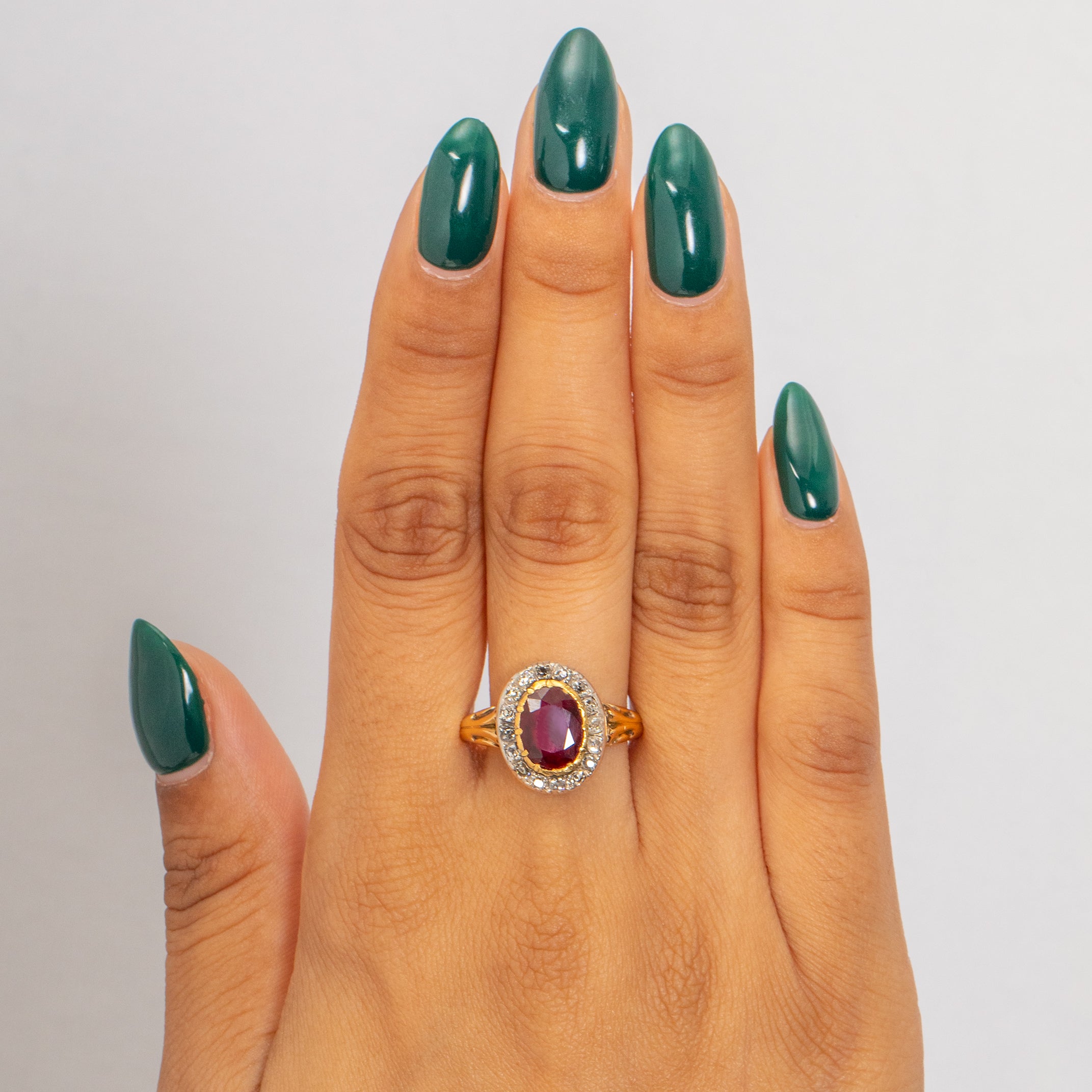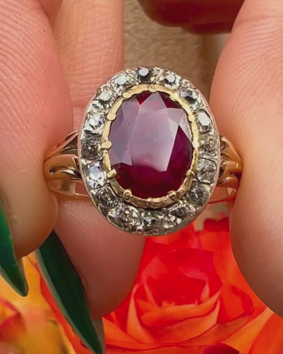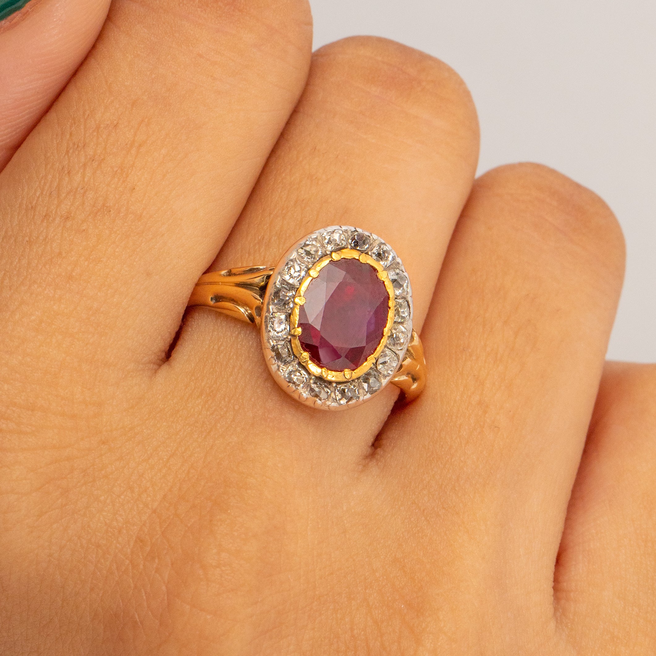 Bague en or 18 carats géorgien avec rubis et diamant en grappe, rubis de 2,40 carats.