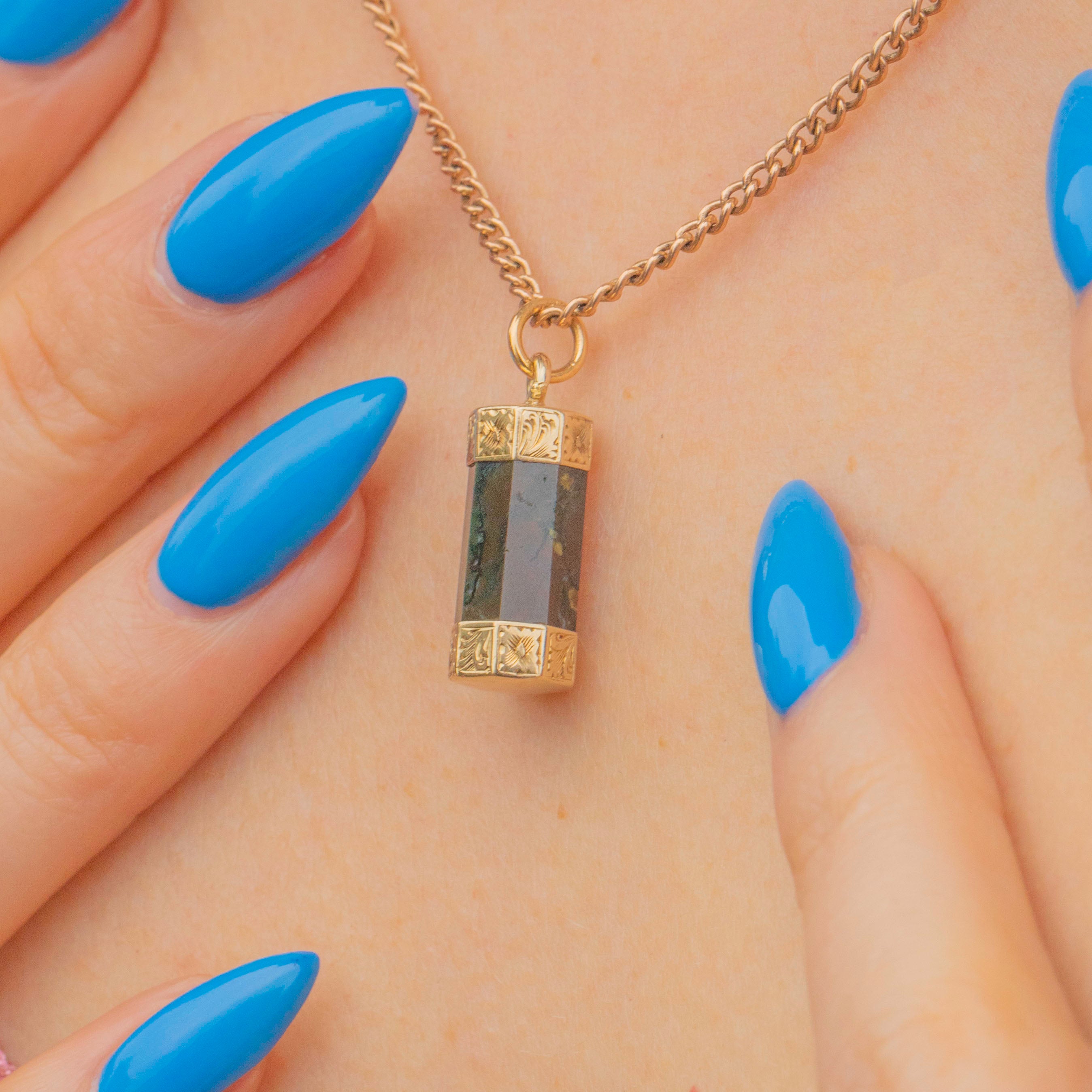 This curious Georgian 9ct Gold Agate column pendant is bursting with dark, chocolatey-brown hues. Formed into an octagon shape, this pendant features beautifully crafted 9ct Gold settings on either side, adorned with intricate engraved panels.