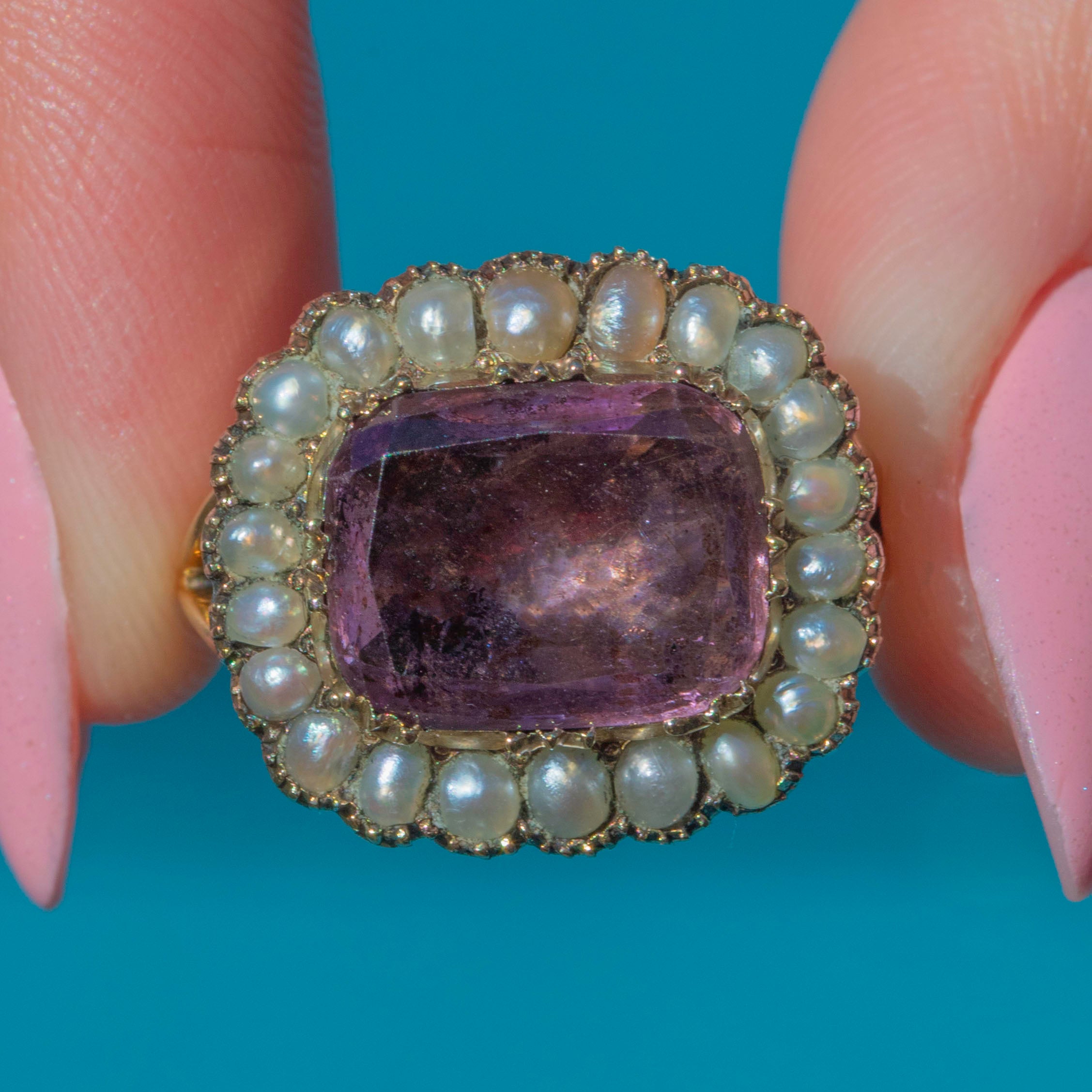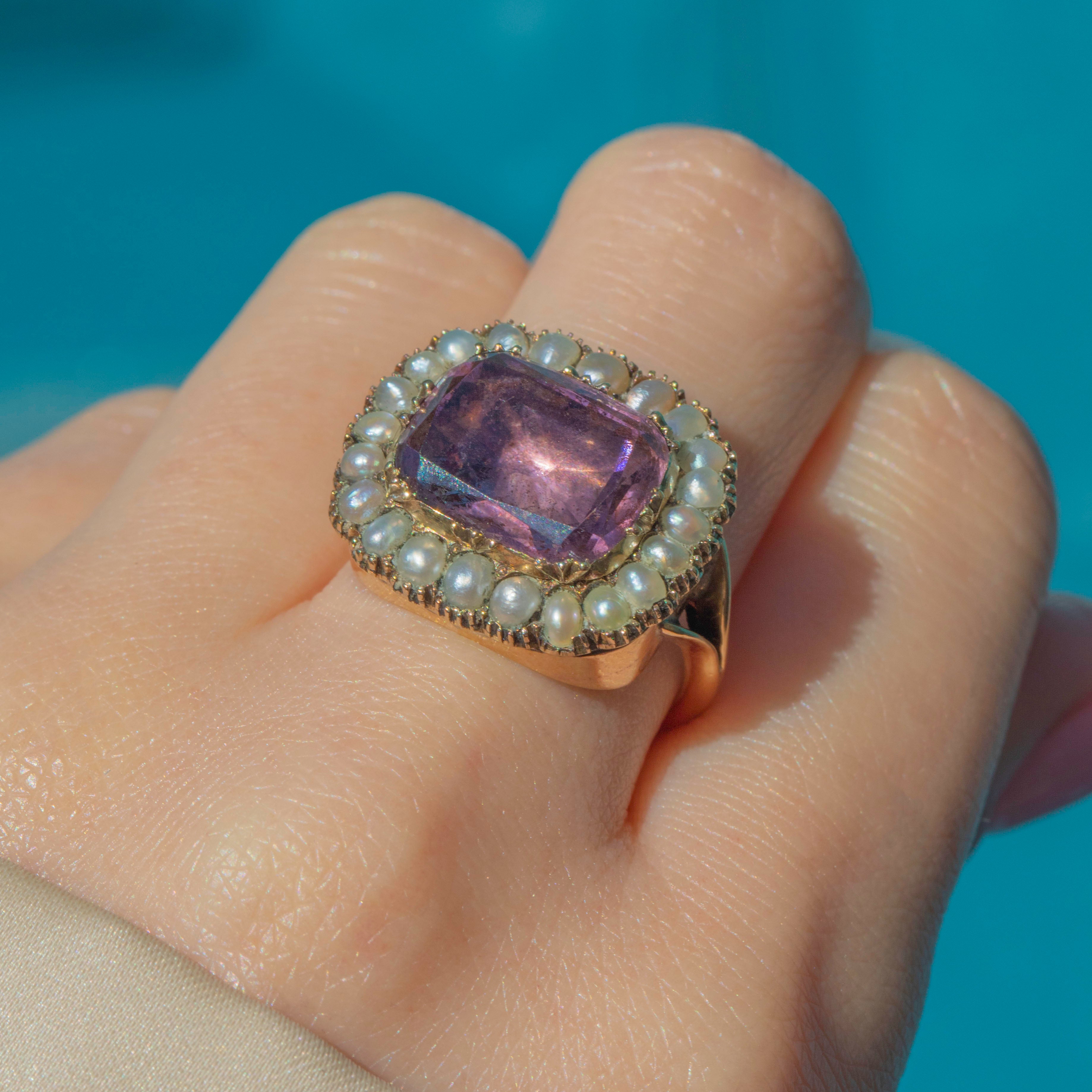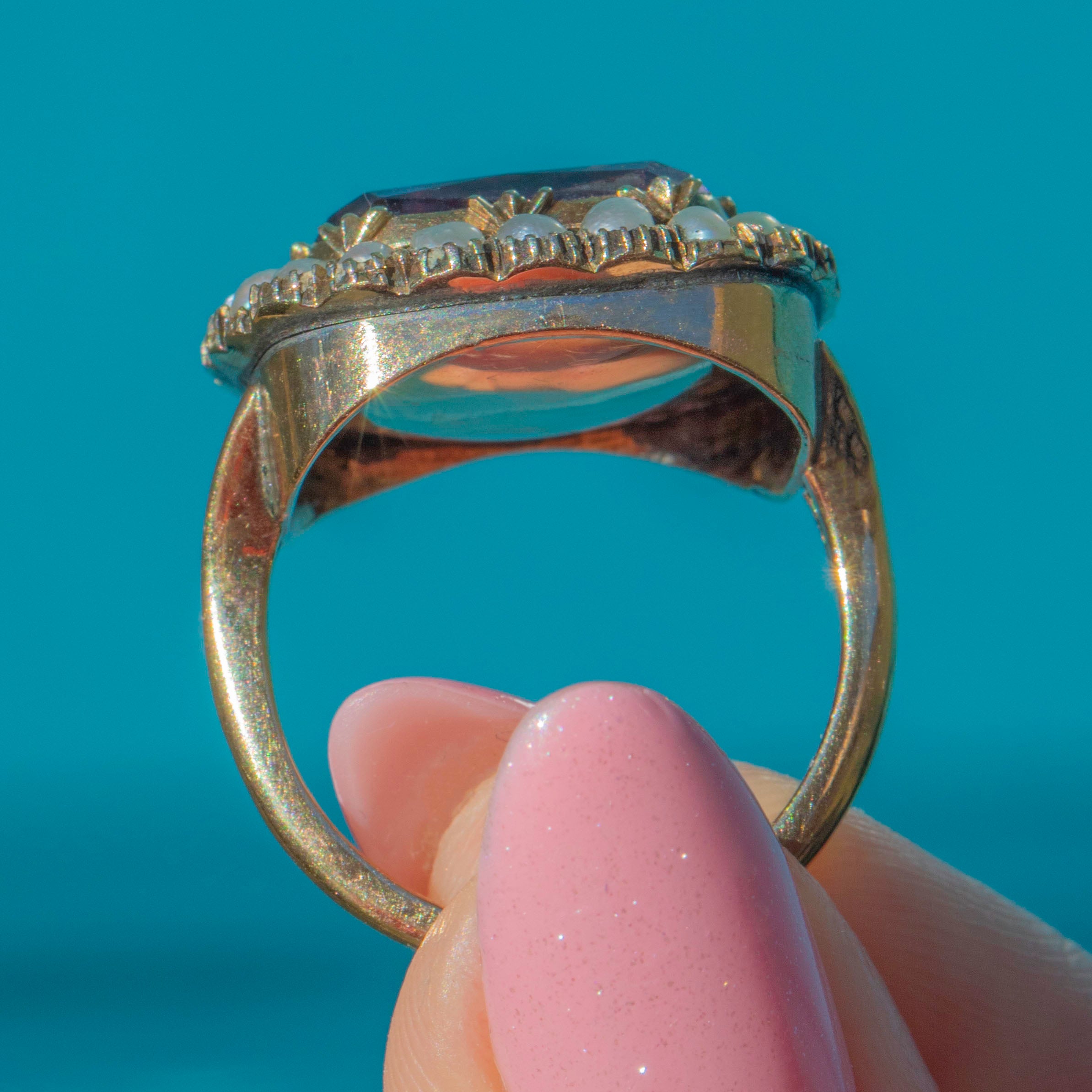 This Georgian 9ct Gold Amethyst Pearl cluster ring radiates regal elegance!