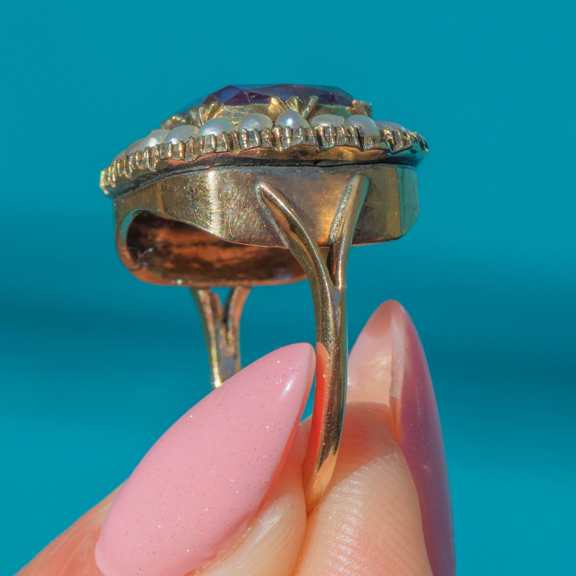 Georgian 9ct Gold Amethyst Pearl Cluster Ring, 3.80ct