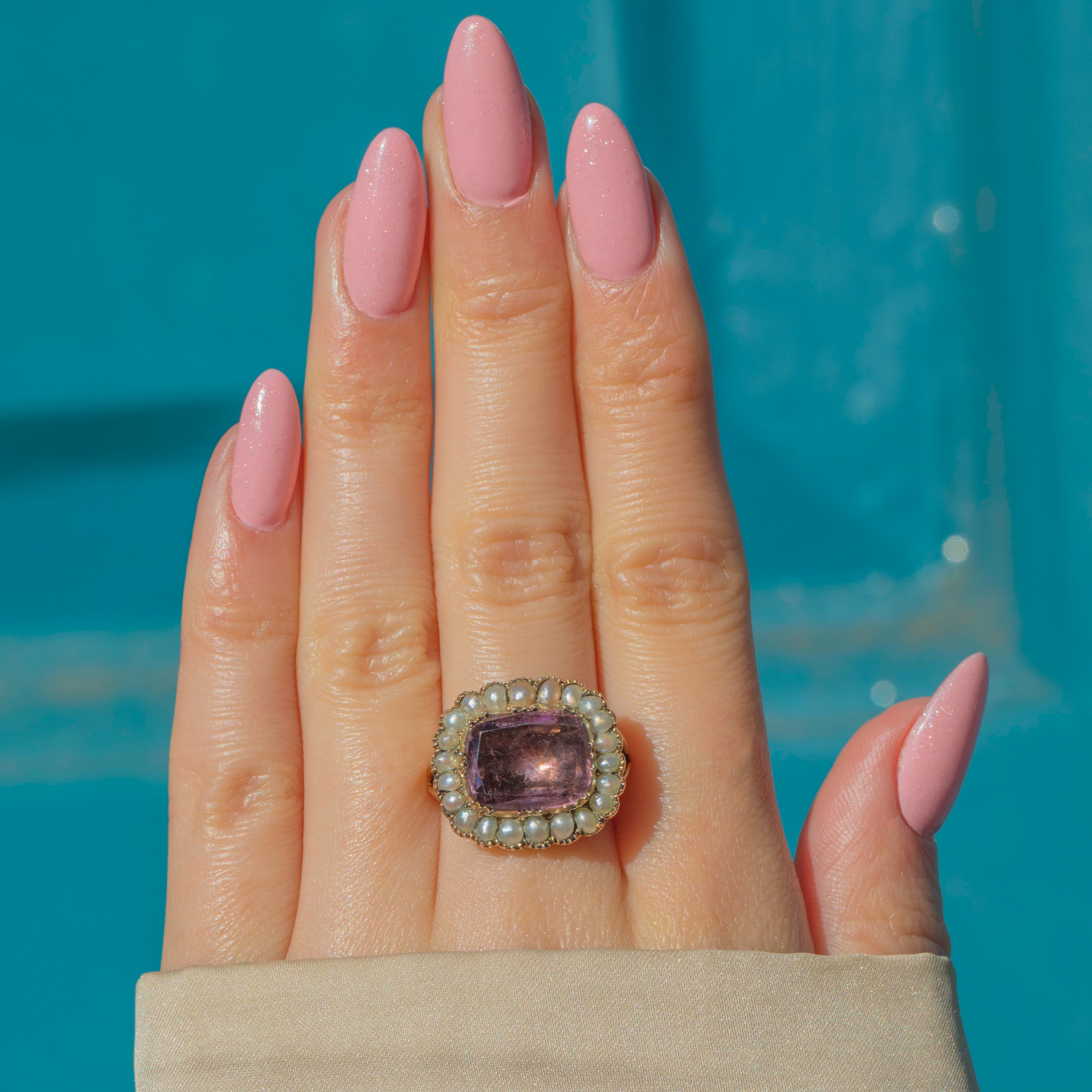 VERY GOOD-EXCELLENT: This Georgian 9ct Gold Amethyst Pearl cluster ring is in great condition. The Amethyst is radiant, with natural inclusions that can be admired under close inspection. Each of the gemstones is set securely within its settings and with only minor signs of wear commensurate with age, she is a must-have!