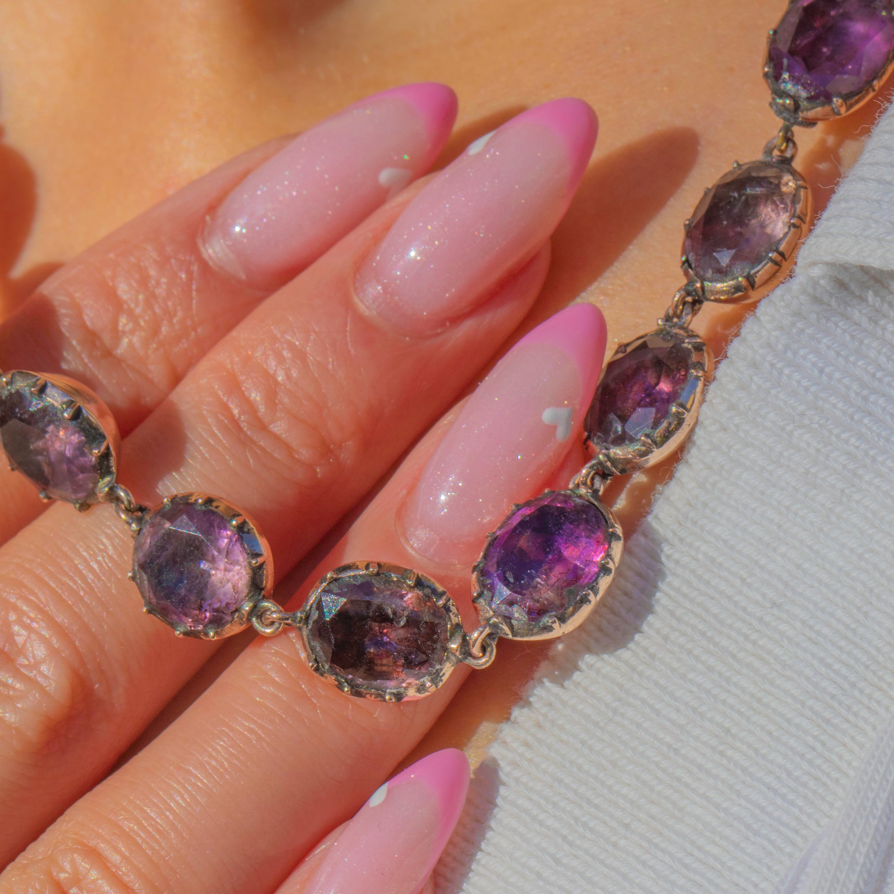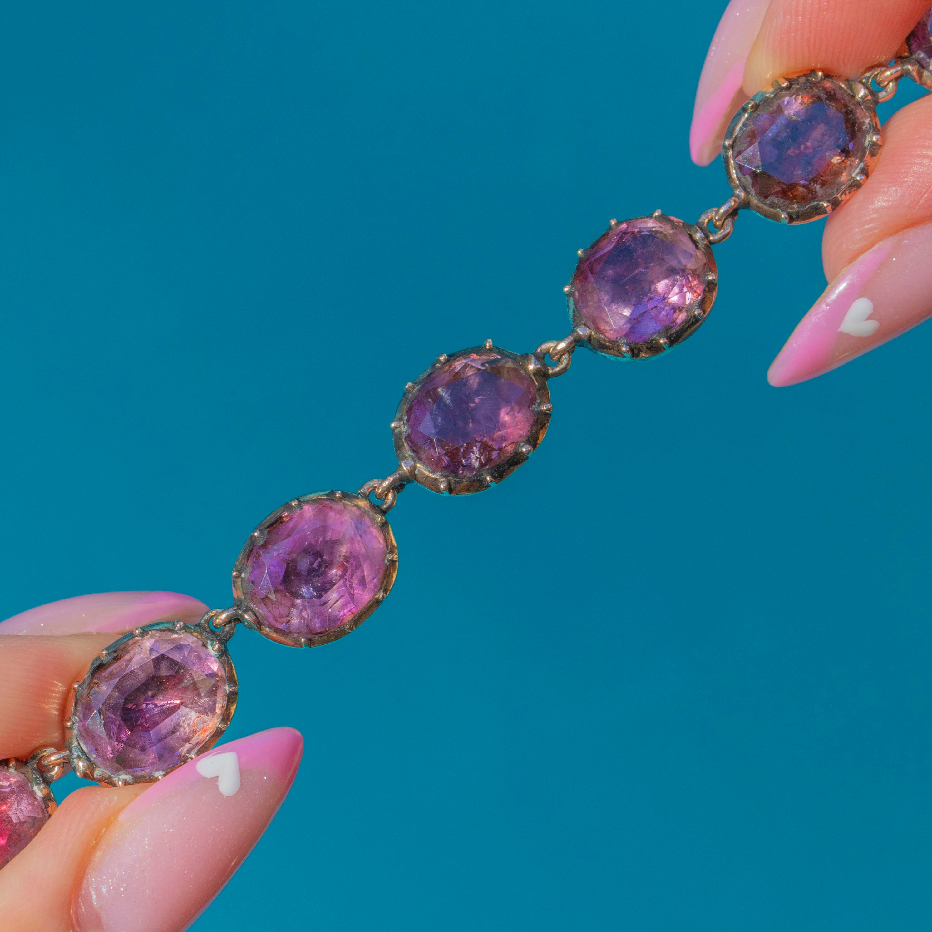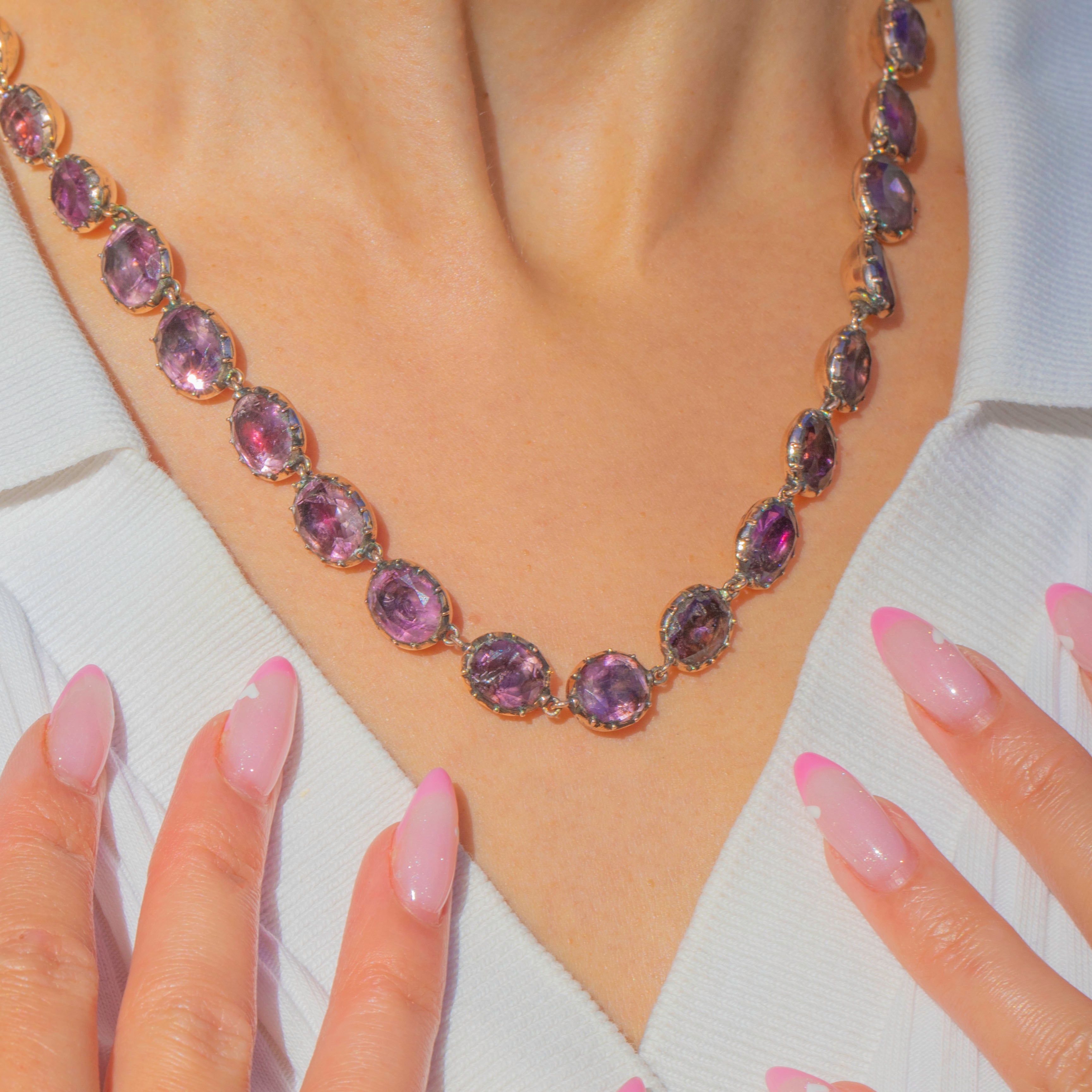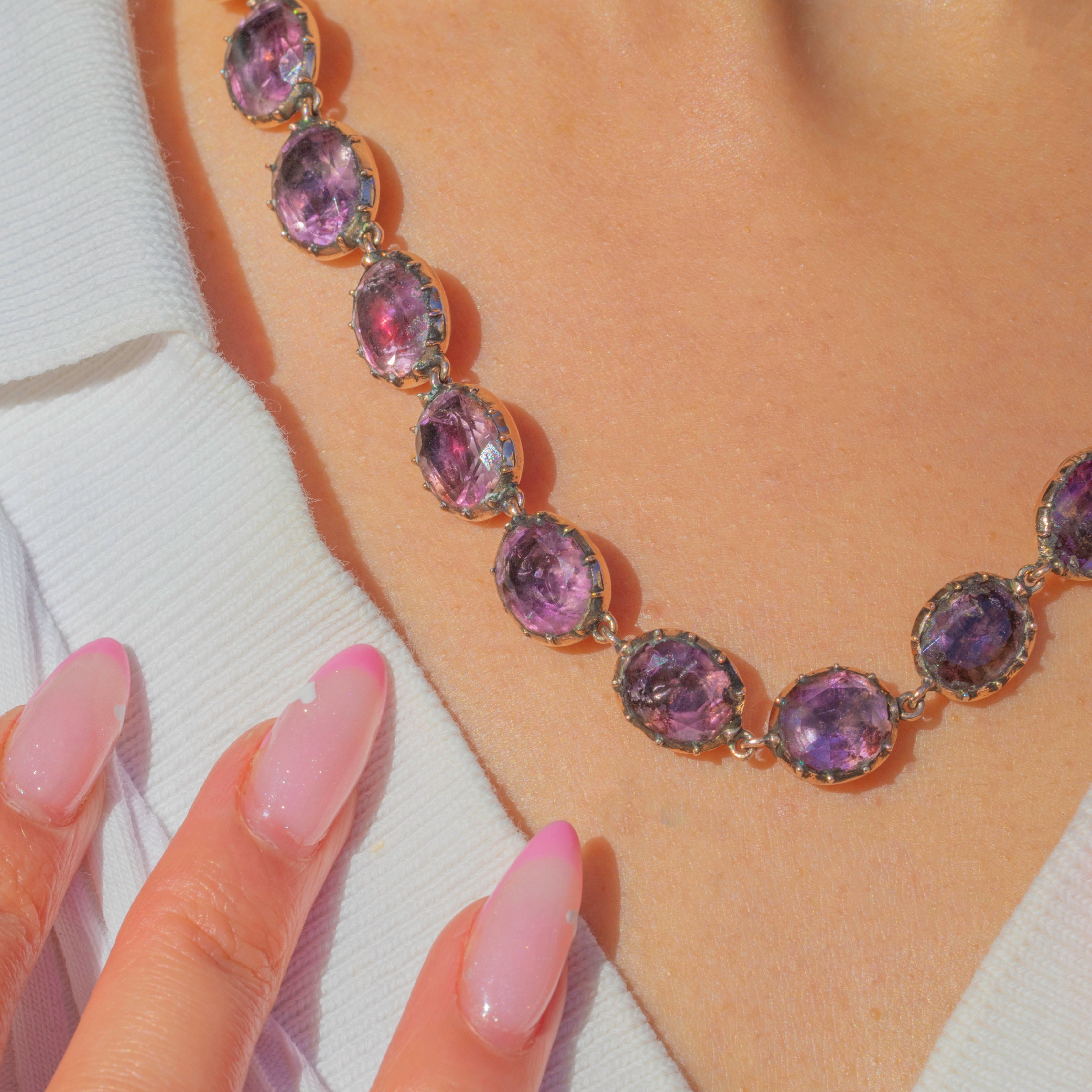A breathtaking Georgian rivière necklace crafted in 9ct Gold, set with a continuous row of foiled Amethysts that shimmer with warm purple hues. Each oval stone glows with the subtle luminosity characteristic of Georgian foiled settings, radiating light with every movement.