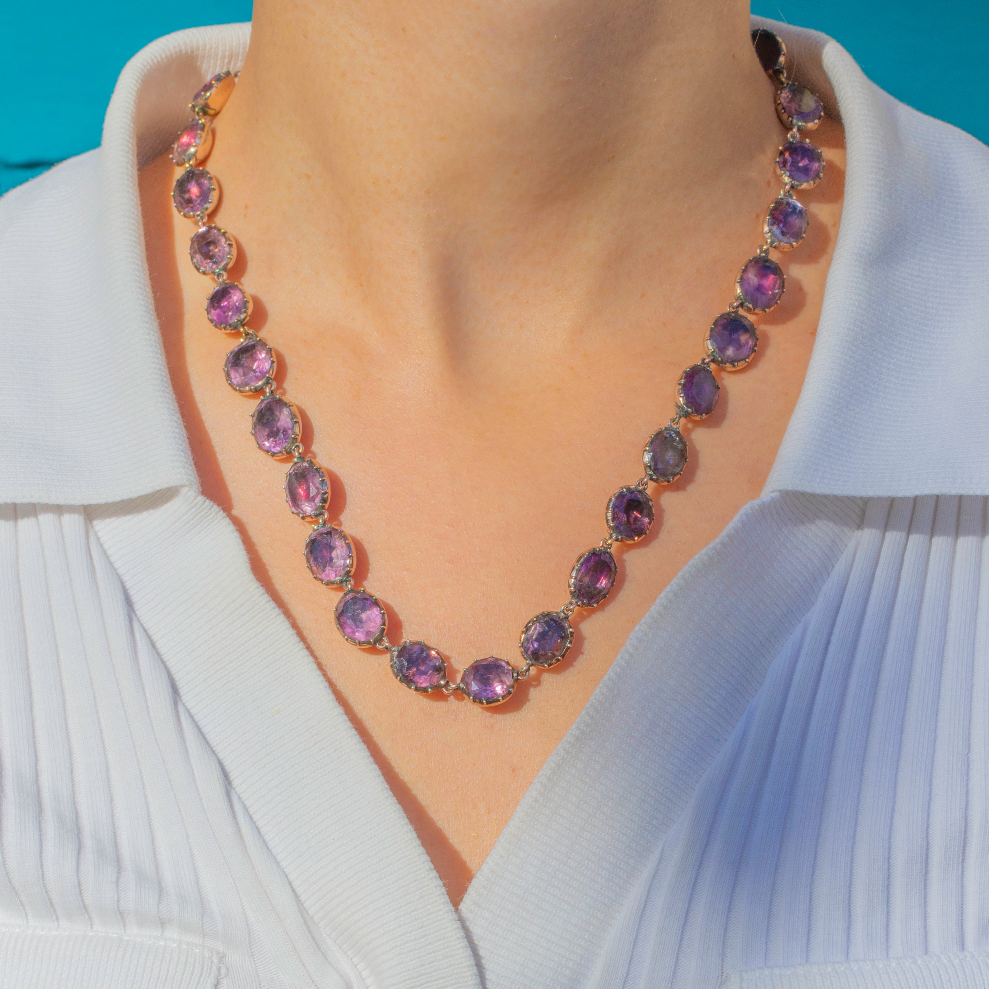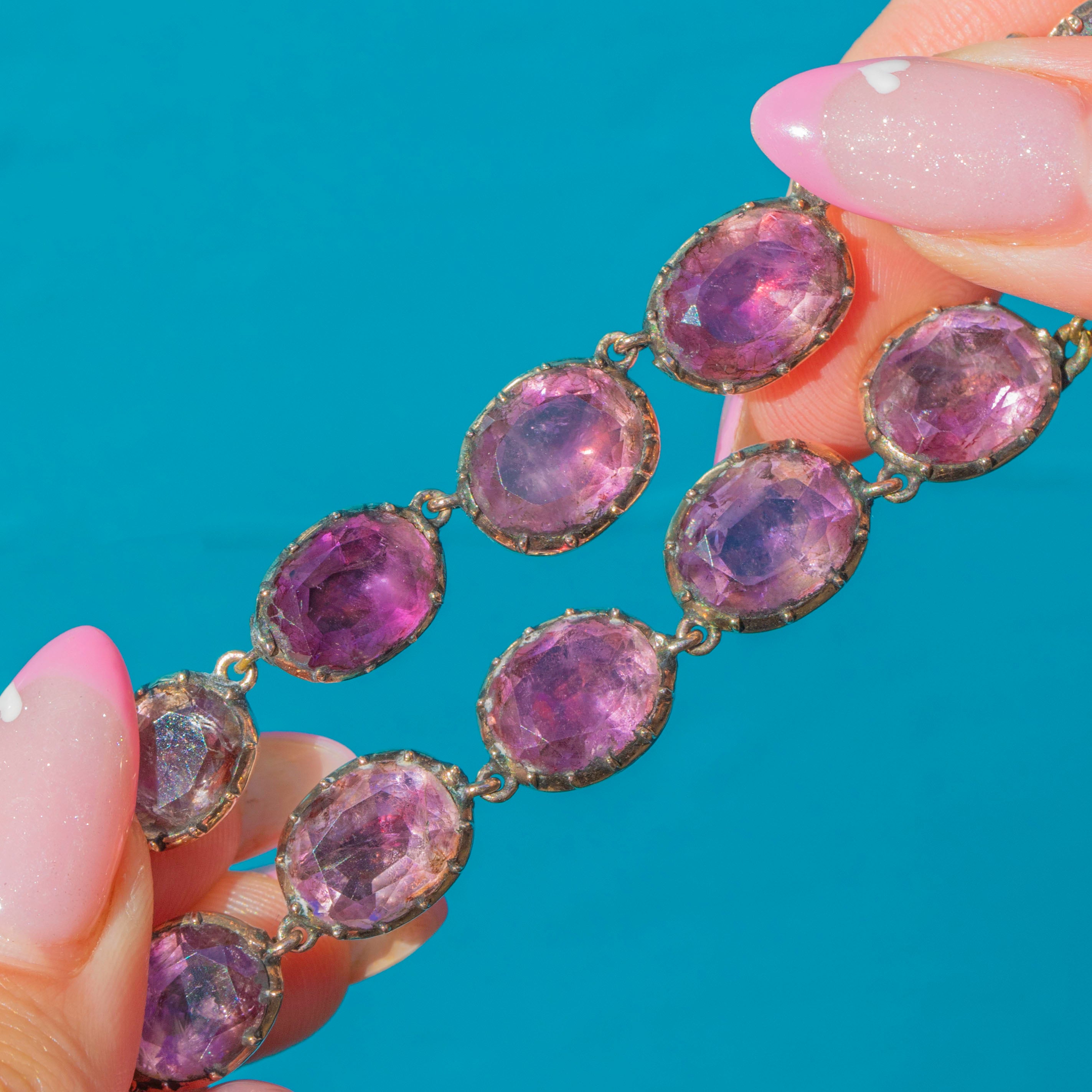VERY GOOD-EXCELLENT: The Amethysts are beautifully matched and securely set, showing minor wear to the Gold backs from age and previous wear. Foil backs remain bright with strong colour and sparkle. An outstanding and wearable Georgian necklace.
