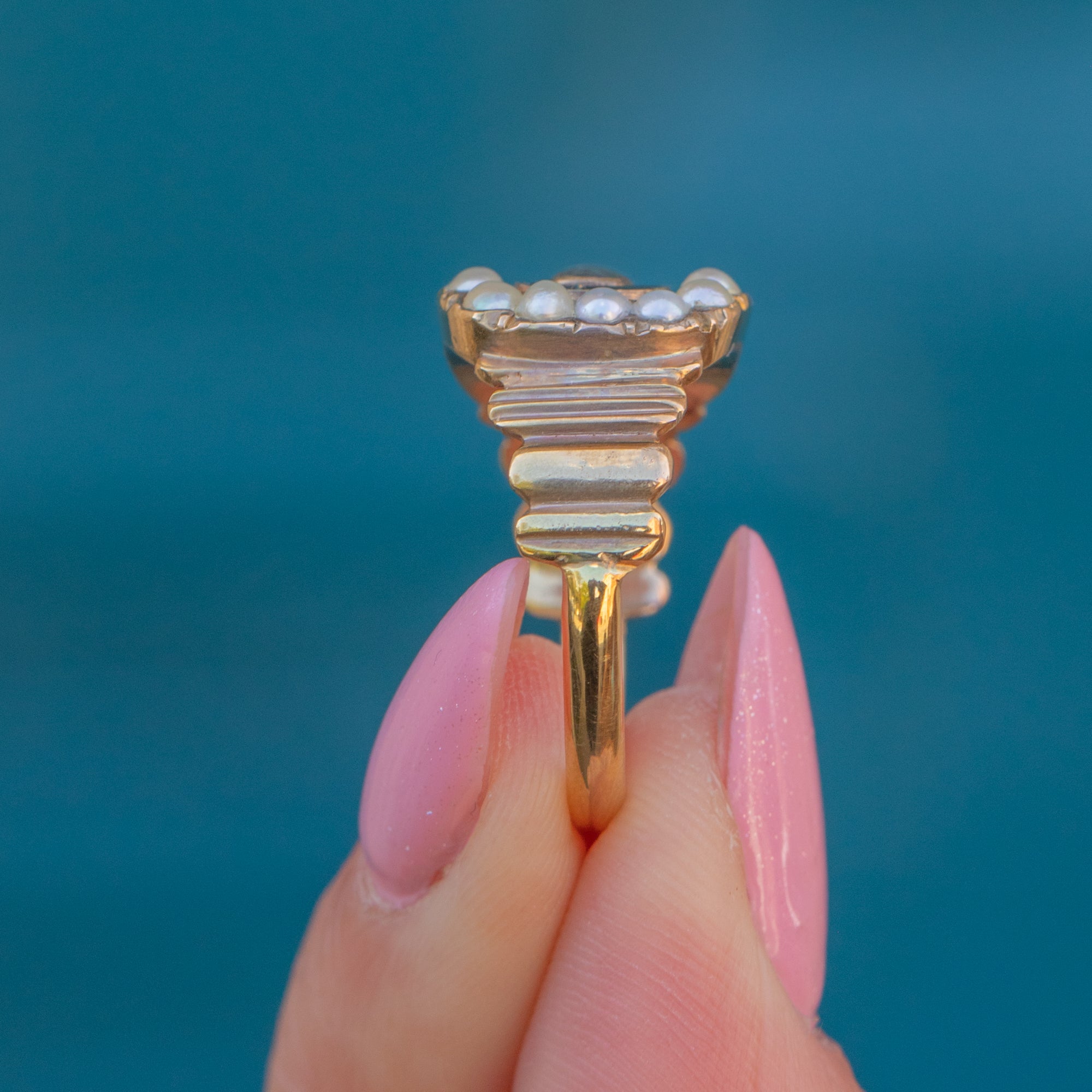 Georgian mourning rings are rich in early 19th-century romanticism, and she is no exception. Displating a woven hair centre, this 9ct Gold ring is encircled with inky black Enamel and a halo of lustrous Pearls, representing tears.