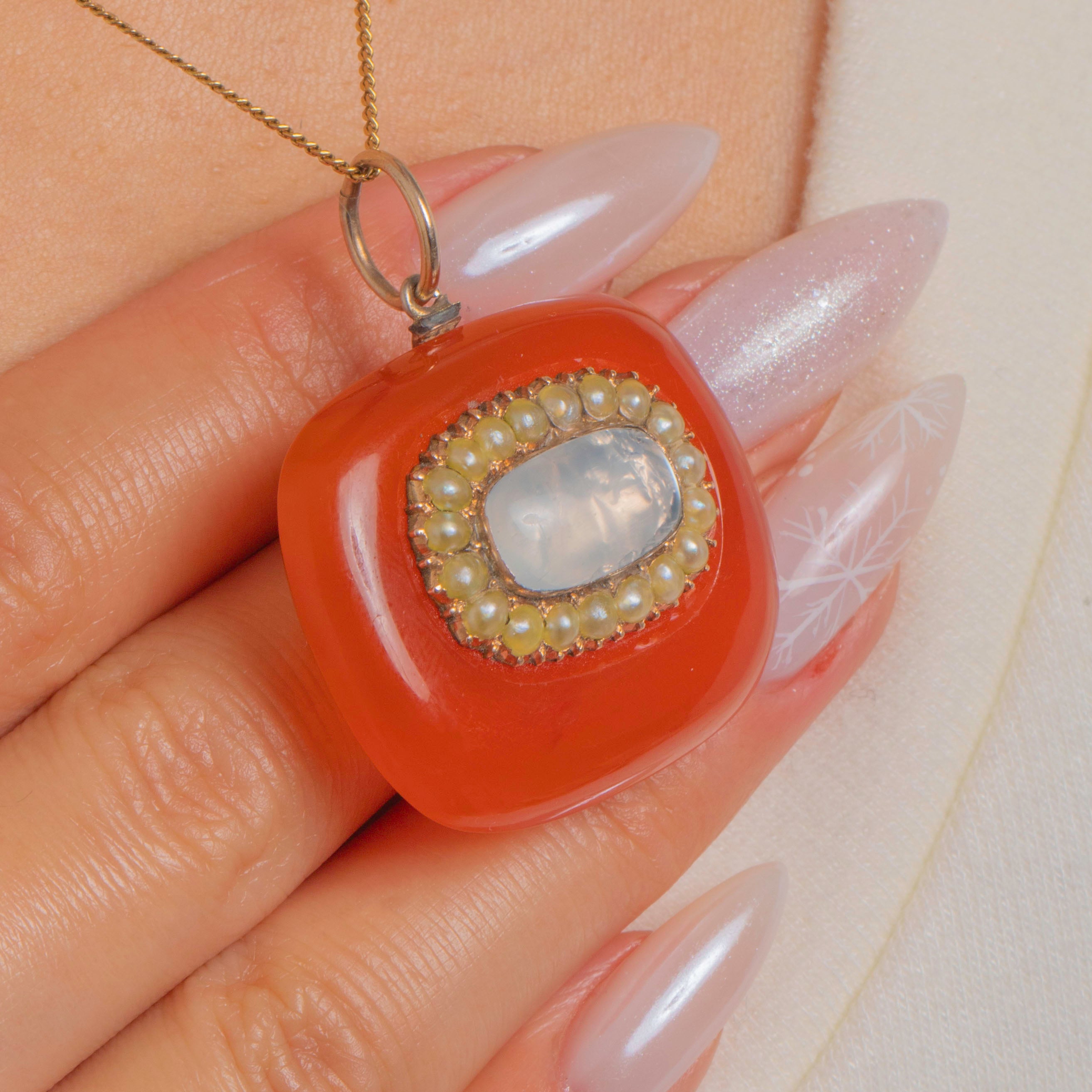 A striking Georgian pendant showcasing a rich orange-red Carnelian tablet centred by a luminous oval Moonstone and encircled by a neat halo of creamy seed Pearls. The colour-play is wonderfully graphic and elegant, with the soft glow of Moonstone and Pearls set off by the saturated Carnelian and warm 9ct Gold mount.