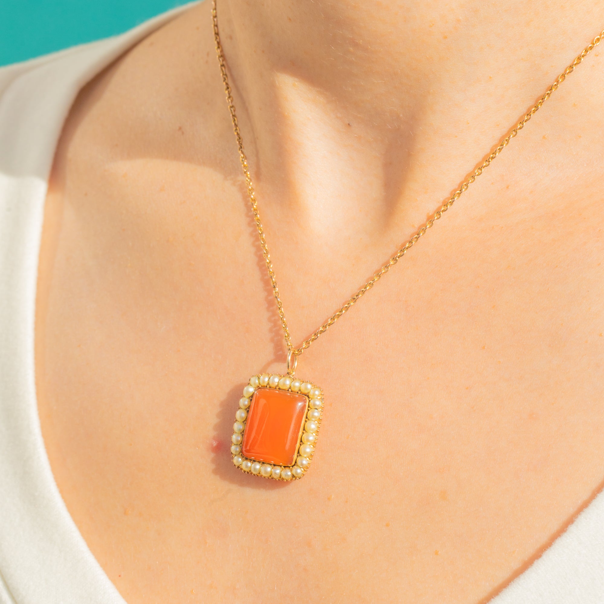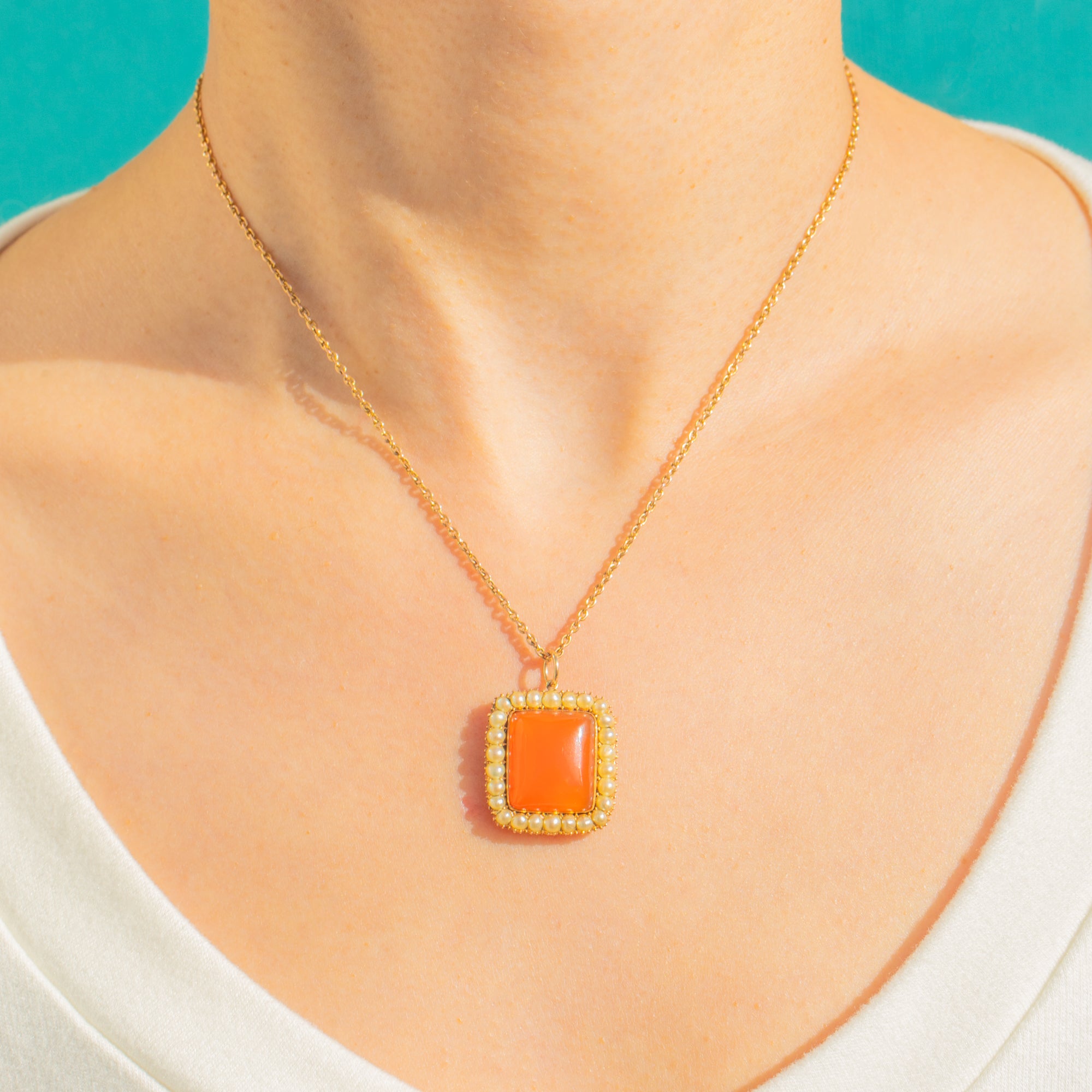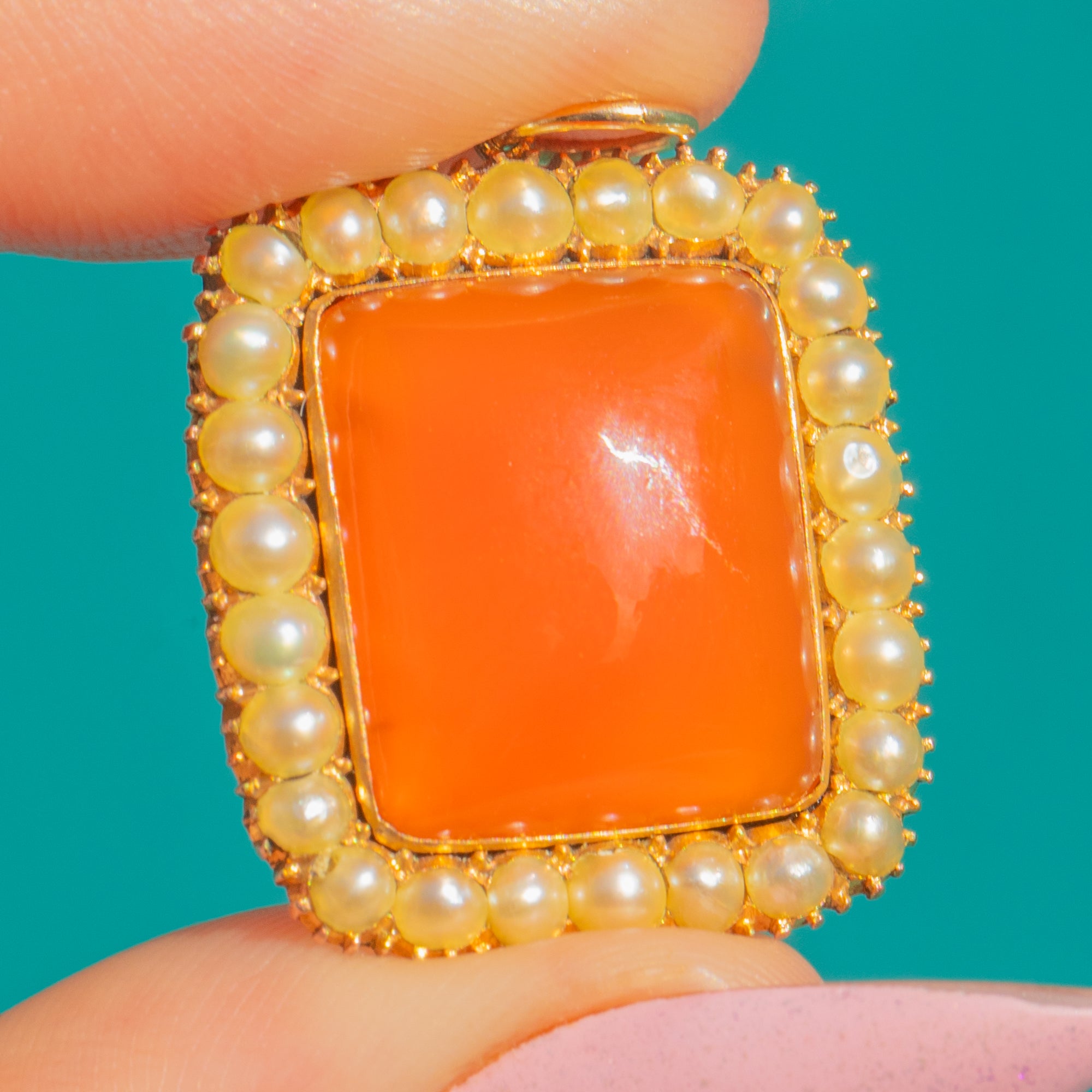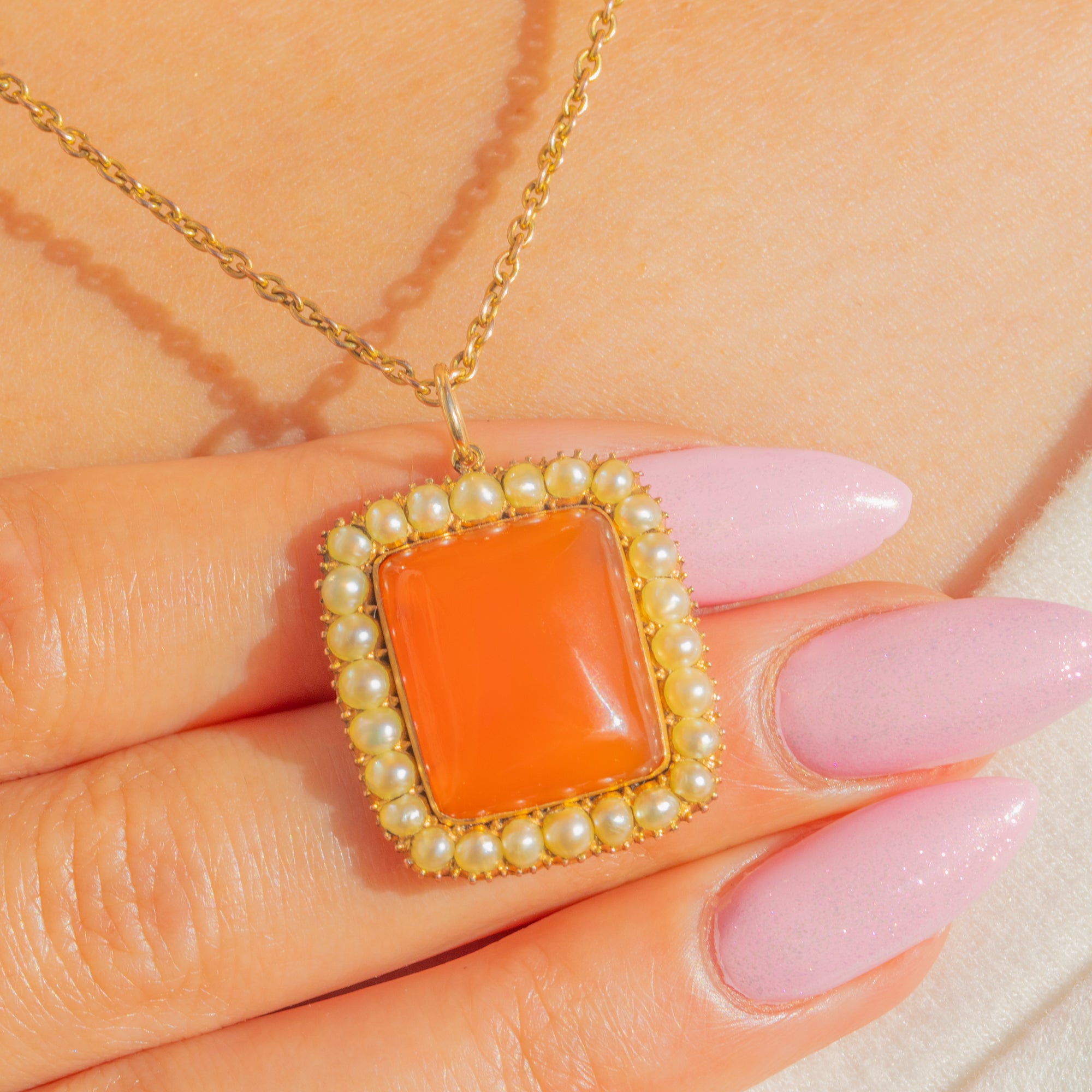 A beautifully romantic Georgian cluster pendant, centred around a rich, glowing Carnelian cabochon framed by a halo of delicate Natural Pearls. The warm, translucent orange of the Carnelian contrasts beautifully with the soft lustre of the Pearls, creating a timeless and elegant composition.