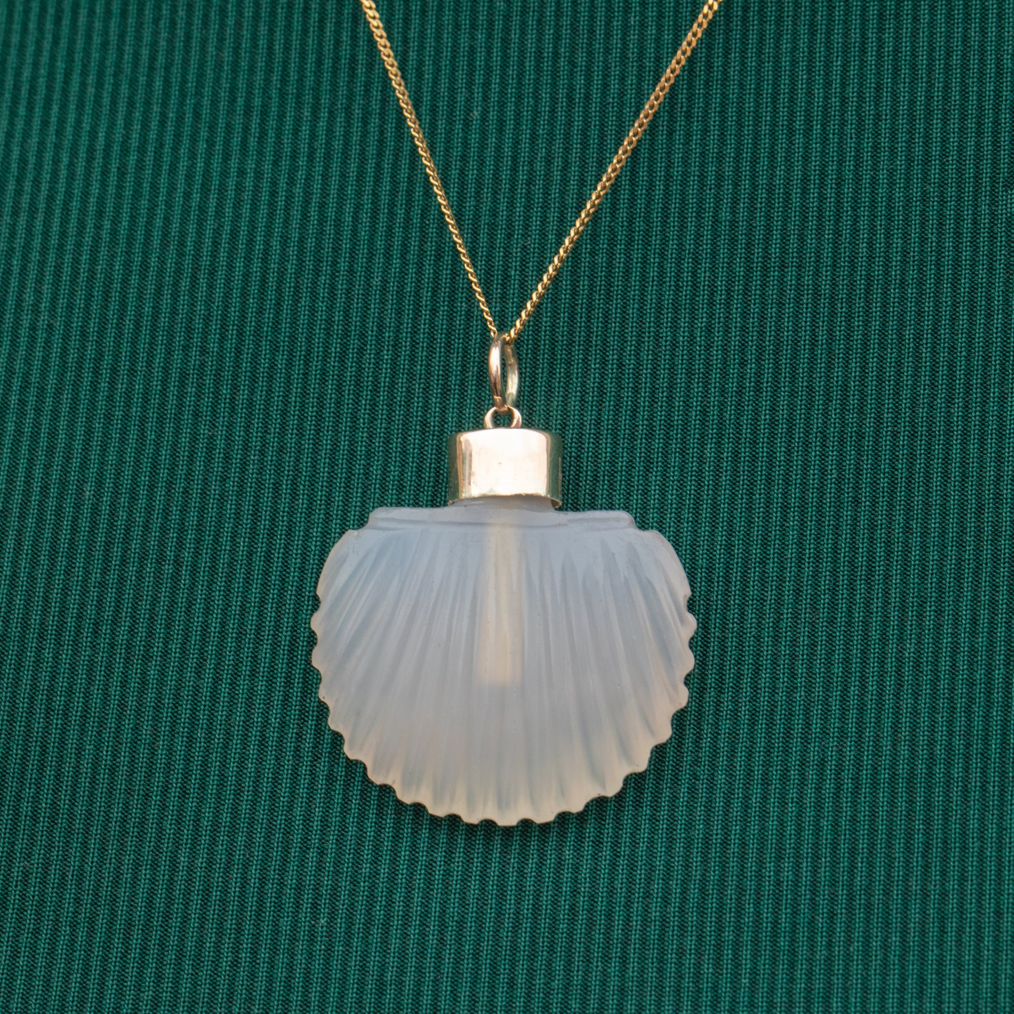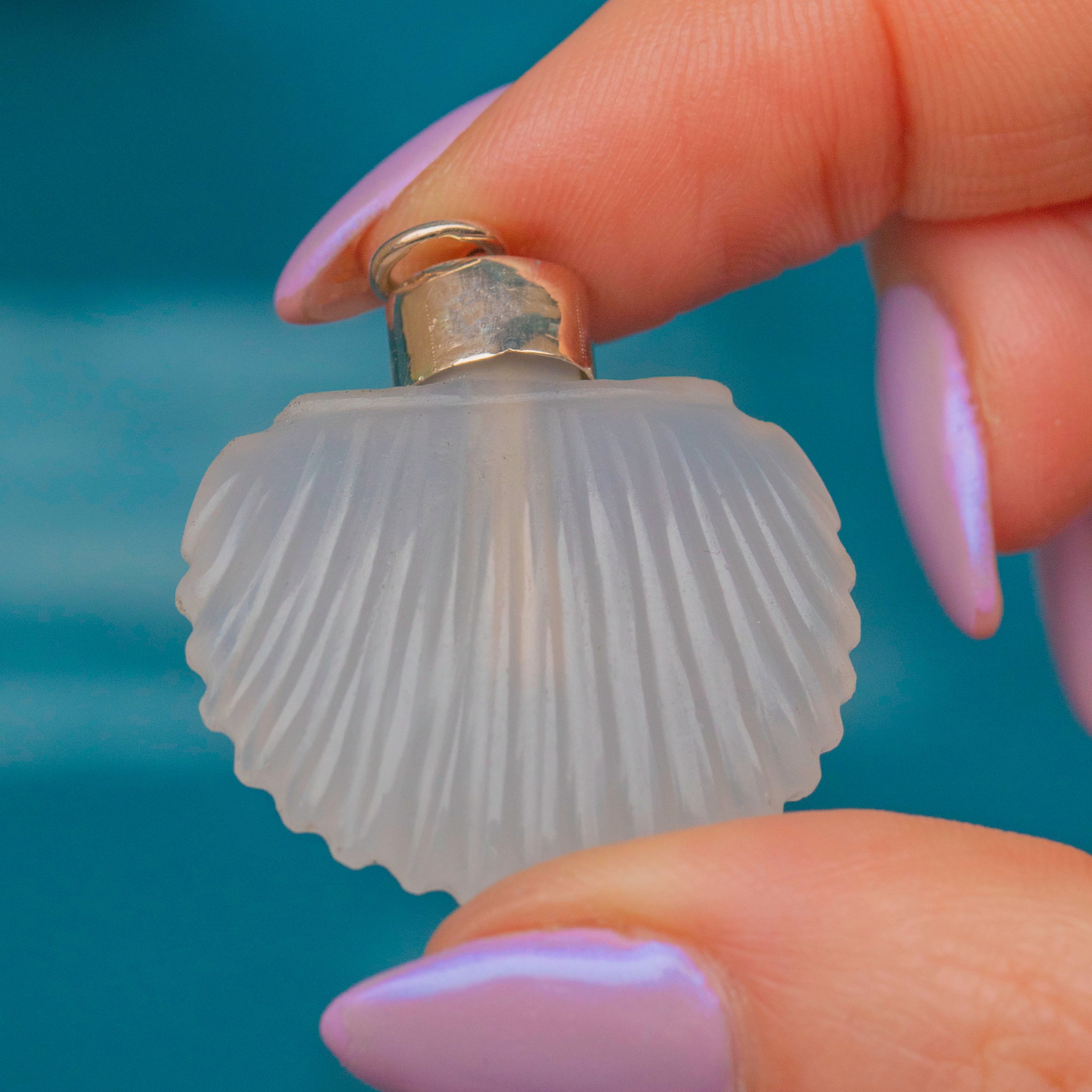 This Georgian 9ct Gold Chalcedony scallop shell scent bottle is adorable! Crafted from a gorgeous opaque Agate stone, this pendant is crafted beautifully with her shell engravings providing a lovely texture and depth.