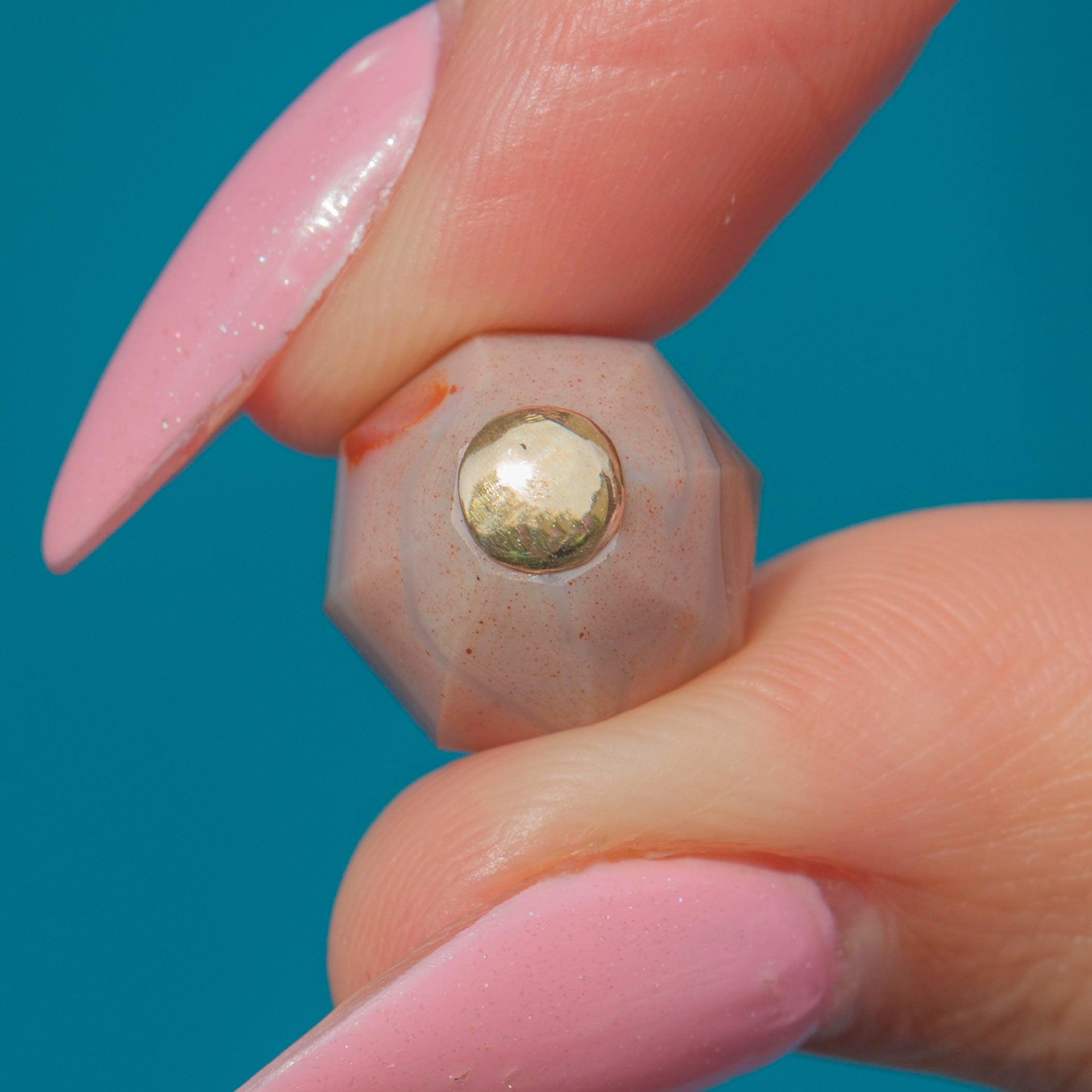 EXCELLENT: This Georgian 9ct Gold faceted Agate orb pendant remains in exceptional condition. The Agate is wonderfully faceted, with sharp, defined edges that reflect light beautifully. Set securely in its warm Gold mount, the piece is finished with a generously sized jump ring—offering versatile styling options to suit your personal look.
