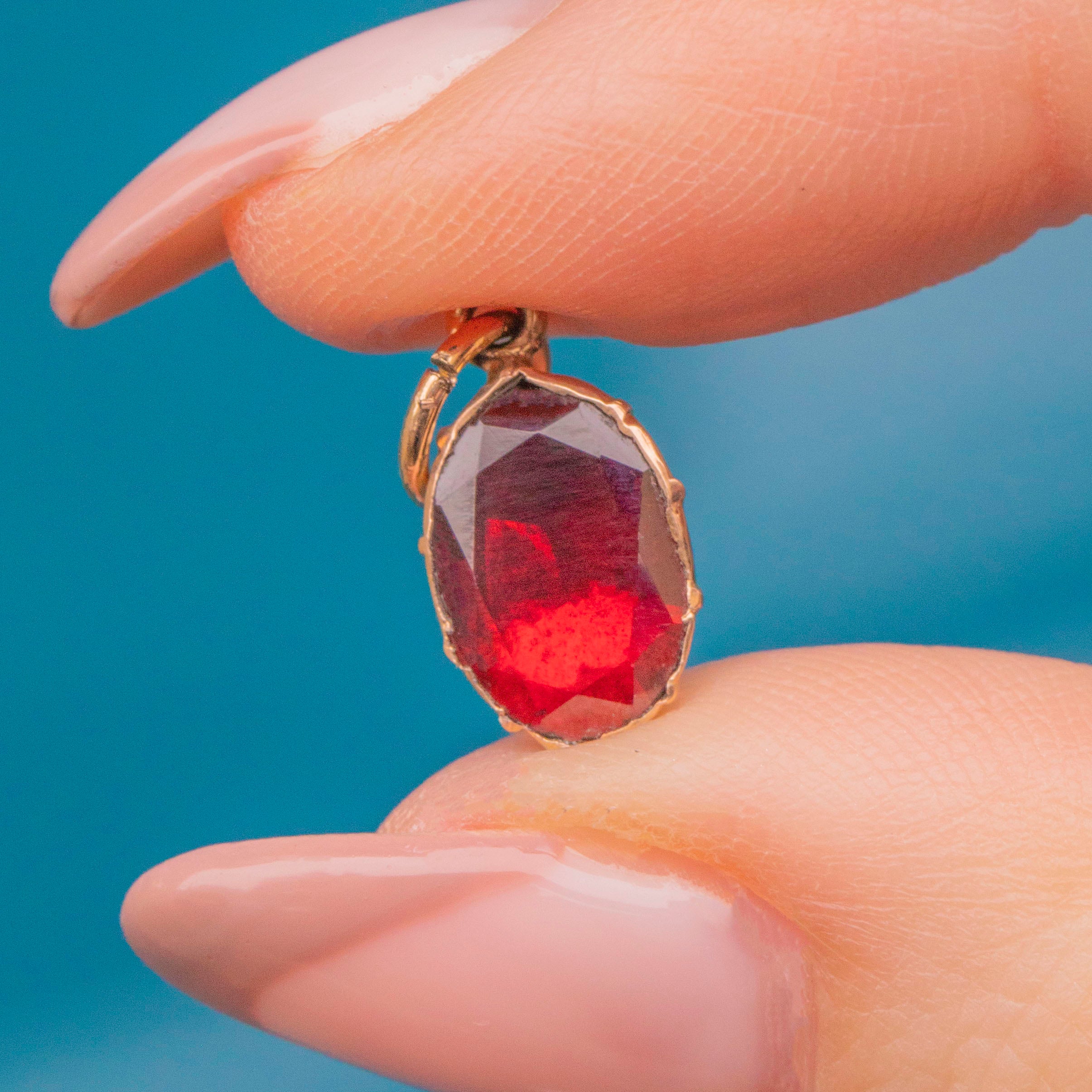 VERY GOOD-EXCELLENT. This Georgian 9ct Gold flat-cut Garnet charm is a delight for the eyes! The Garnet has crisp facets and is securely set within her classic Georgian pie-crust setting. Other than general signs of wear commensurate with age, this piece is lovely and will make a superb addition to any collection!
