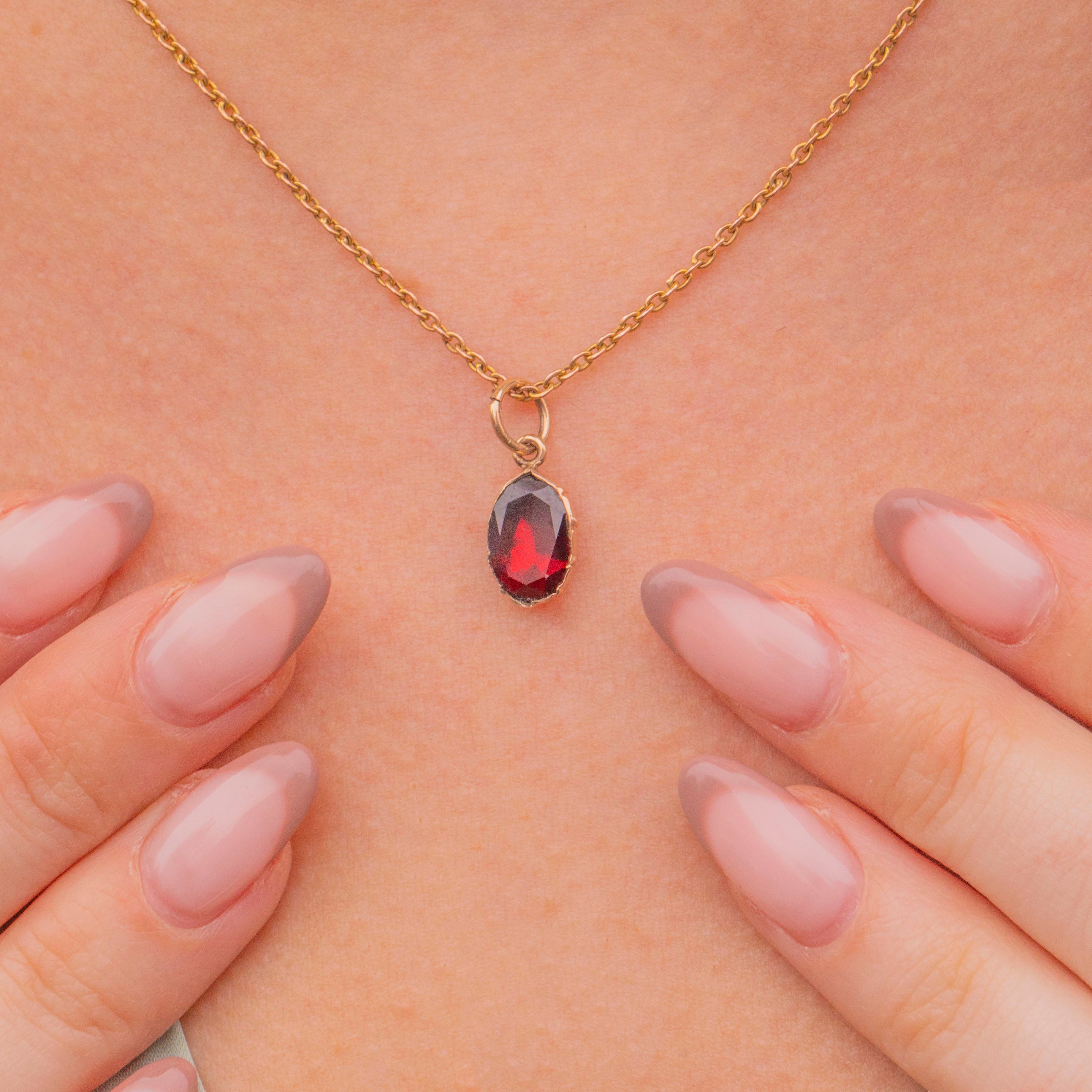 Good enough to eat, this deliciously juicy Georgian 9ct Gold flat-cut Garnet charm is a delectable little treat! The Garnet has a gorgeous dark berry hue, with her faceted, foiled form revealing fabulous flashes of rose under the light.