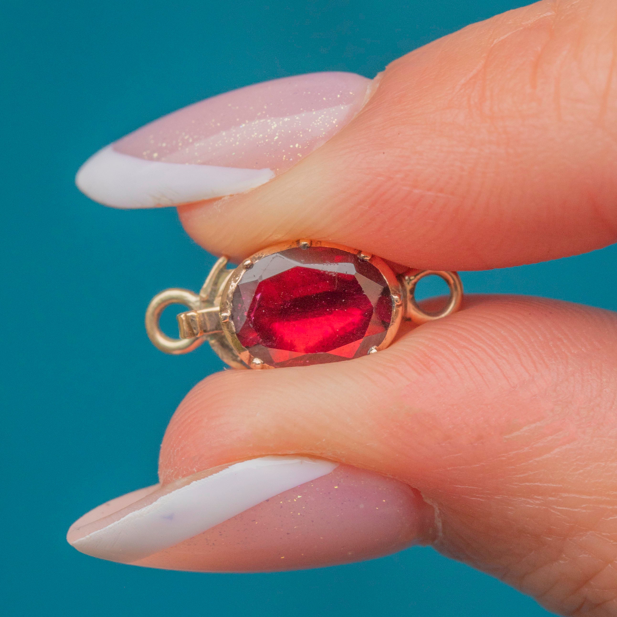 VERY GOOD-EXCELLENT: This Georgian 9ct Gold flat-cut Garnet clasp is in superb condition. The Garnet is vibrant and has a crisp set of facets, with only minor surface wear visible under the inspection of a jeweller's loupe. There are a few scratches on the back of the clasp, but this isn't visible from the front. The Gold is buttery and the tongue clasp closes securely, so you can wear this Georgian Garnet finding with the utmost confidence!