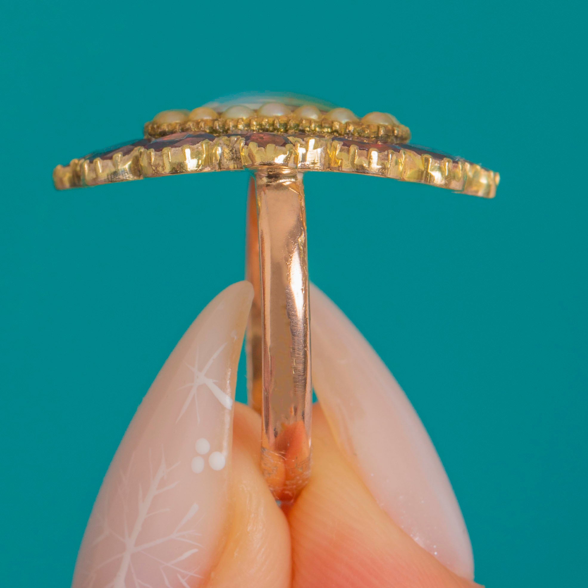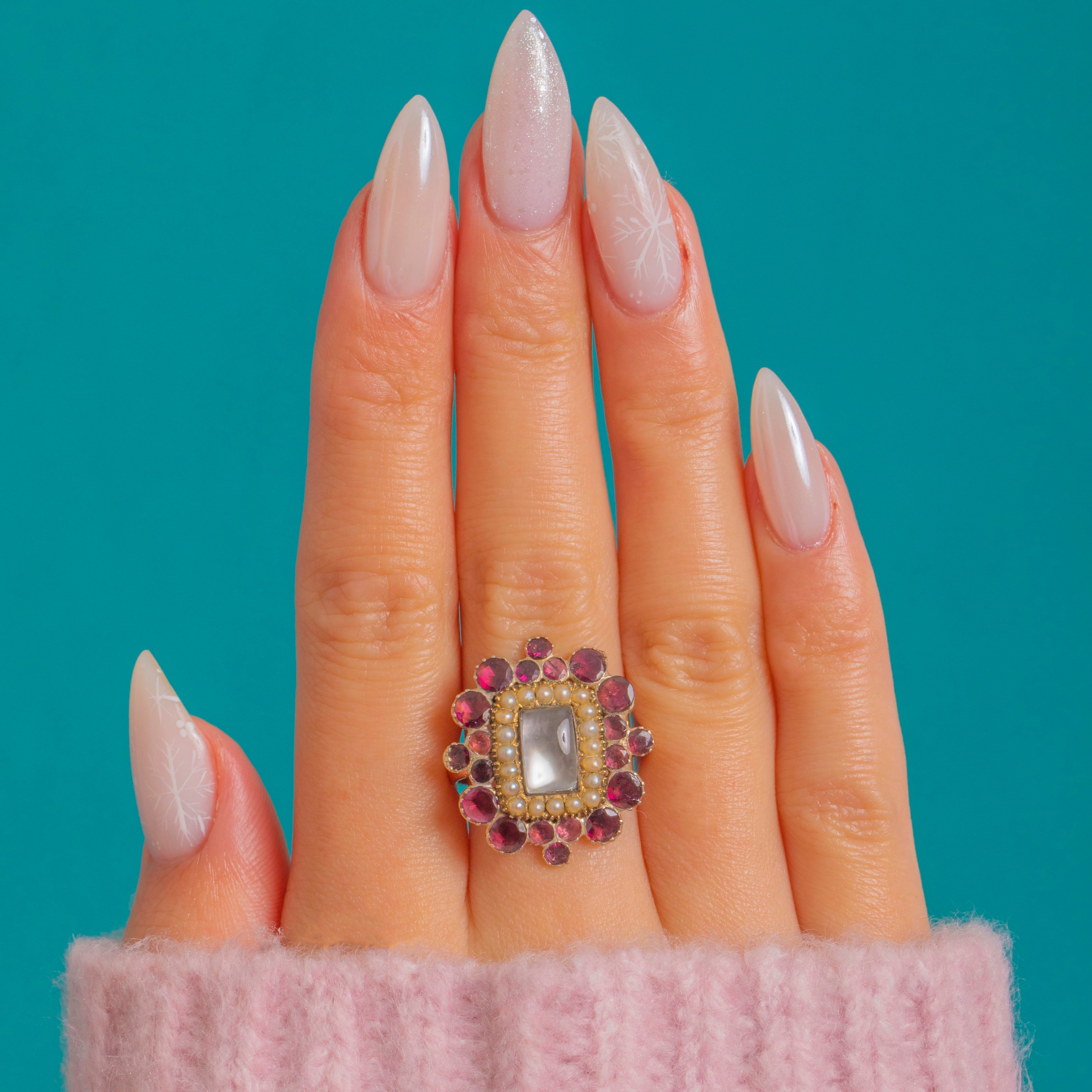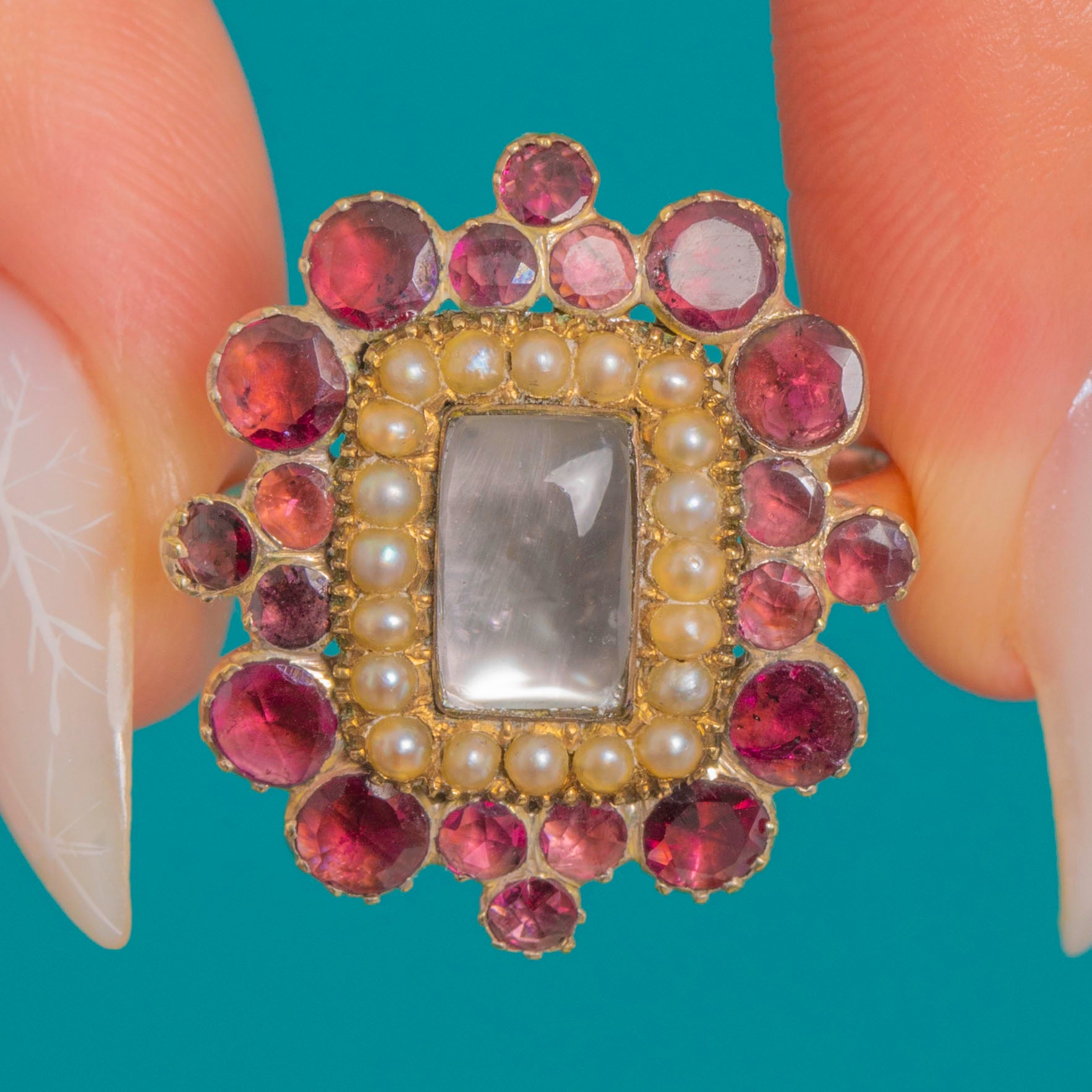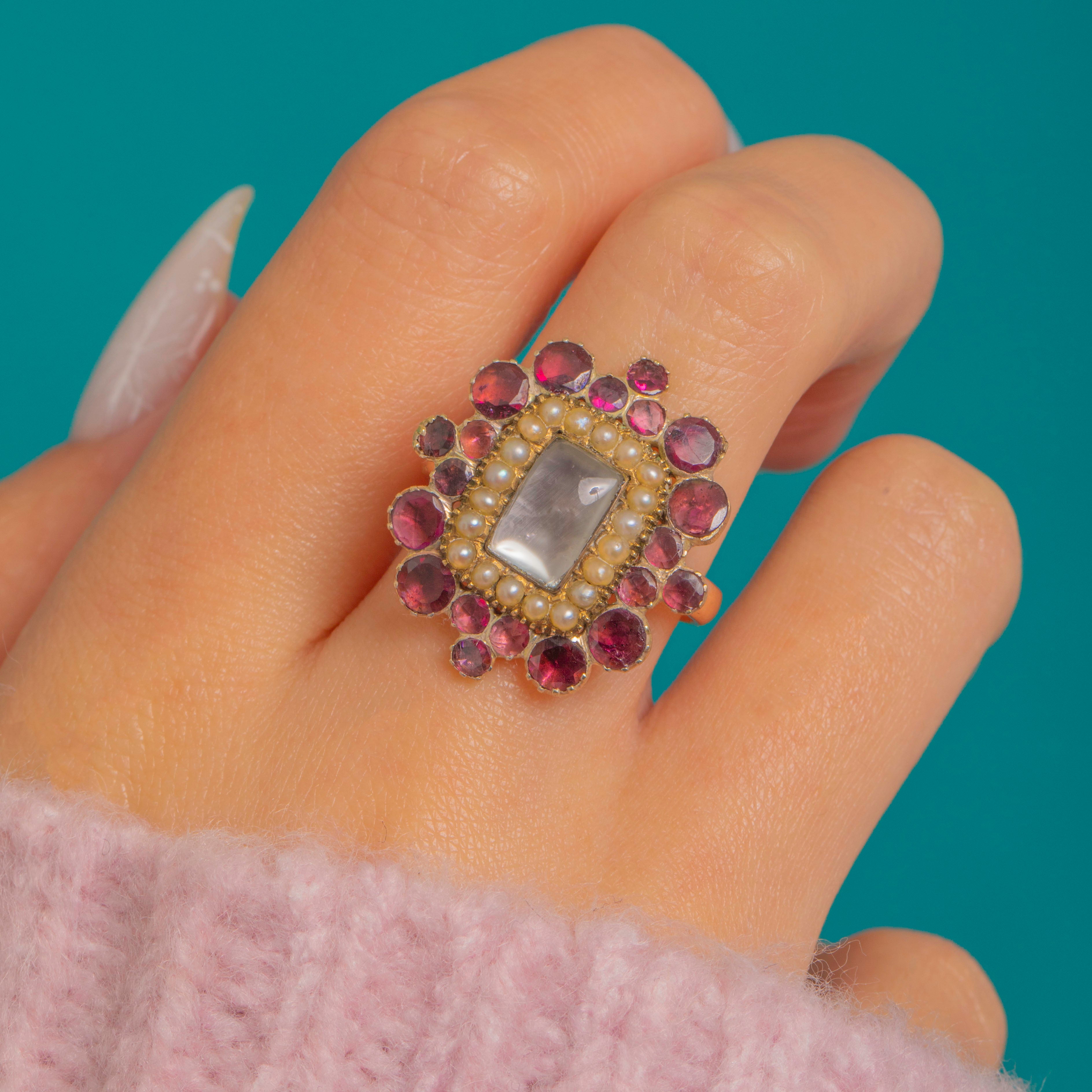 A sumptuous Georgian cluster ring, c.1827, showcasing a luminous rectangular Moonstone at the heart, encircled by a delicate garland of Natural Pearls and finished with a bold scalloped halo of foiled, flat-cut Garnets glowing in rich raspberry hues. The crimped, cut-down collets and closed backs create that unmistakable early 19th-century sparkle, all hand-crafted in 9ct Gold.