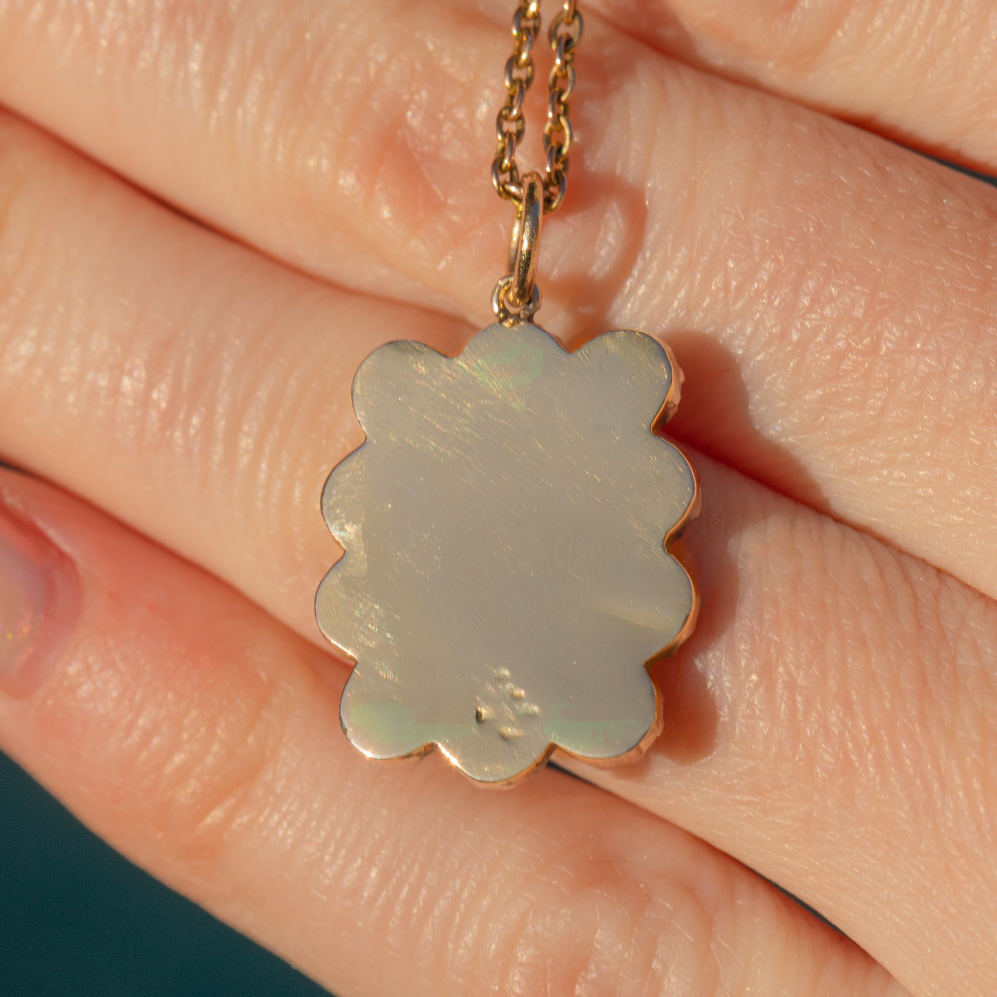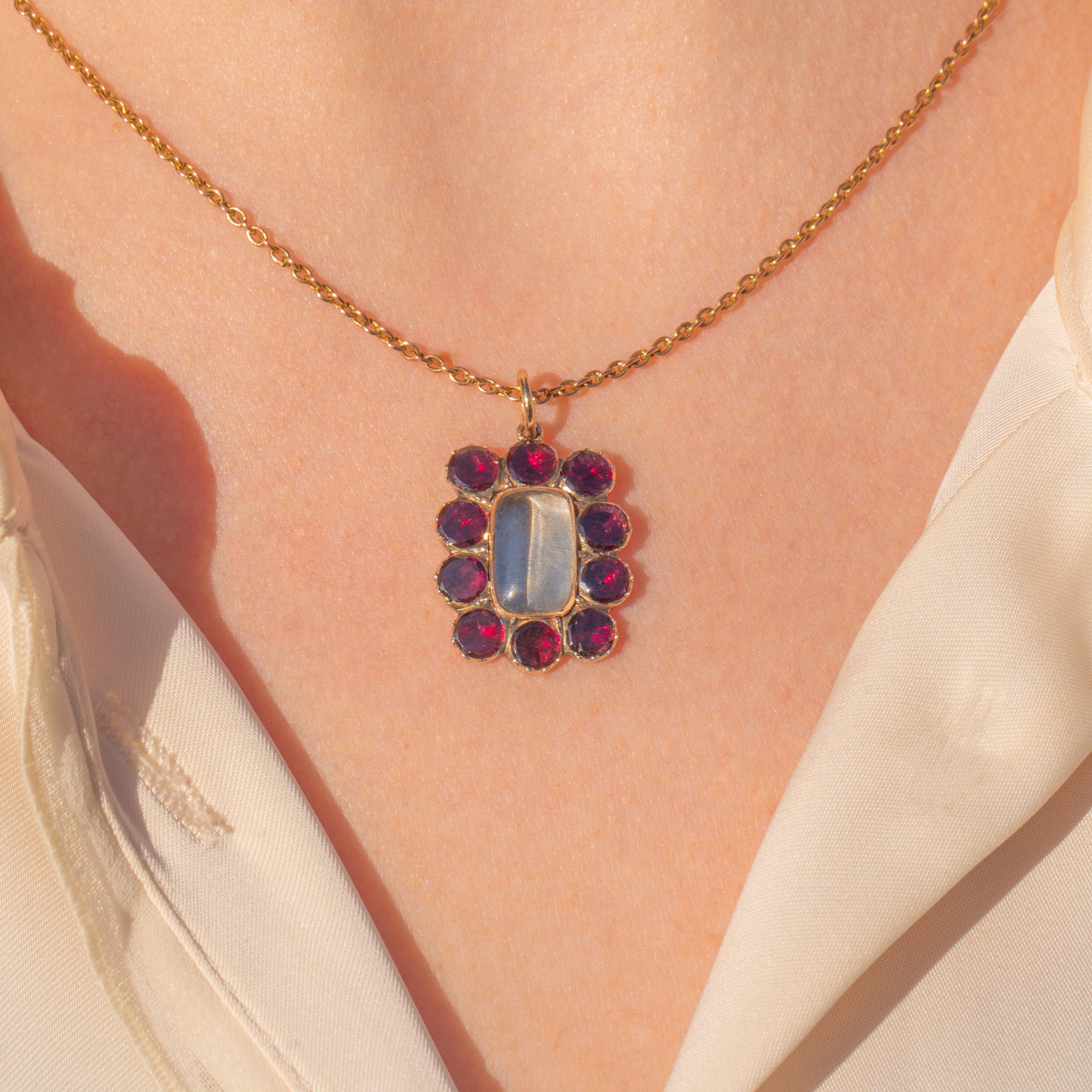 This Georgian 9ct Gold flat-cut Garnet pendant is an eye-catching piece! Crafted from solid 9ct Gold, this pendant is shaped into an elegant rectangular design with a central domed glass panel. What a dream!