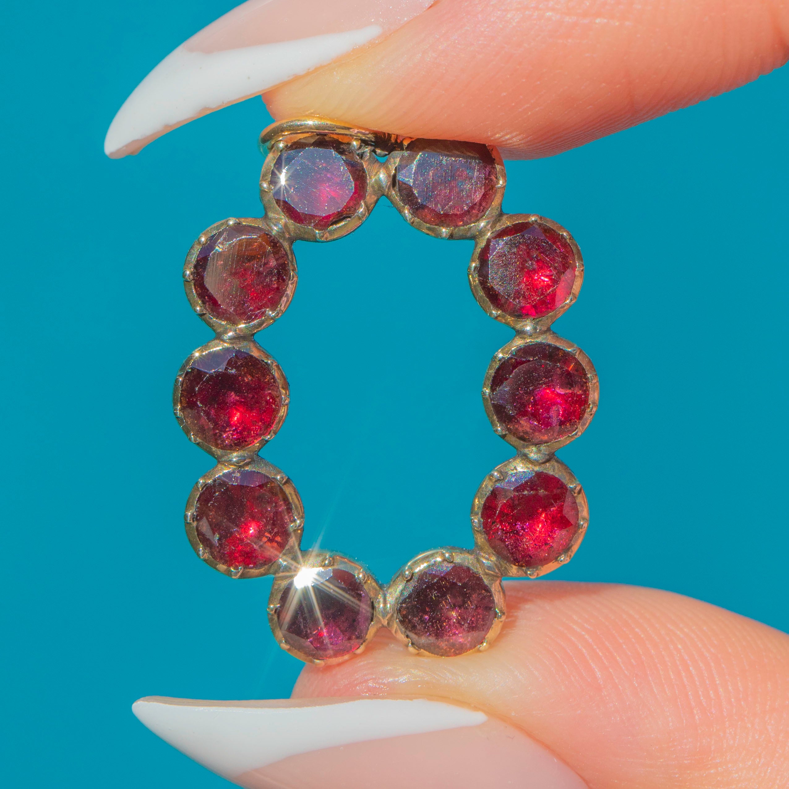 EXCELLENT to VERY GOOD. This Georgian Garnet pendant has survived in remarkable condition for its age. The Garnets display a rich, velvety hue and are securely set, though some natural wear to the surfaces can be seen under close inspection, which is consistent with flat-cut stones of this period. The back shows evidence of a careful conversion from brooch to pendant, allowing the piece to be enjoyed in a more wearable form today. Overall, this jewel presents beautifully, with plenty of antique character and timeless charm.
