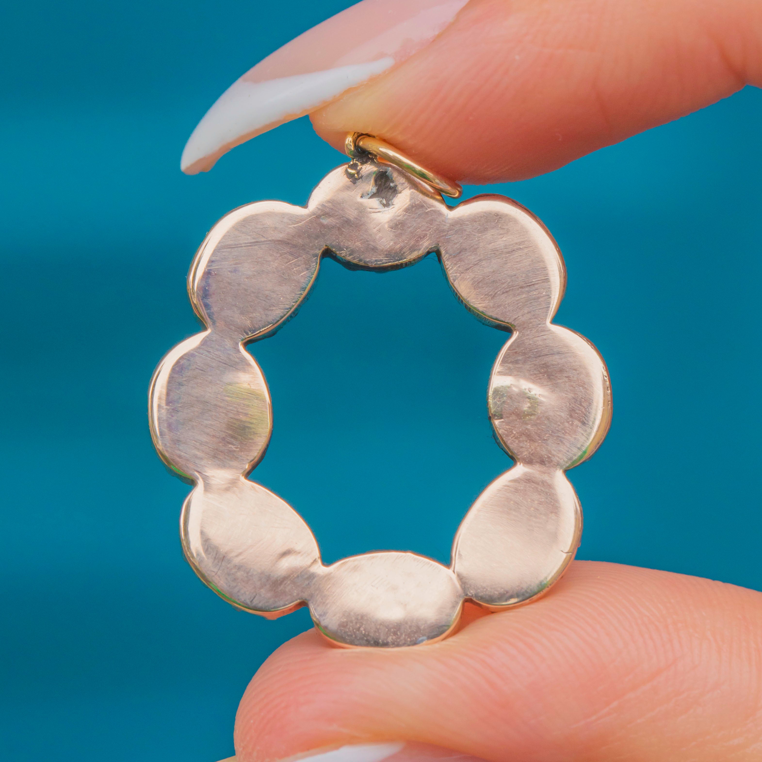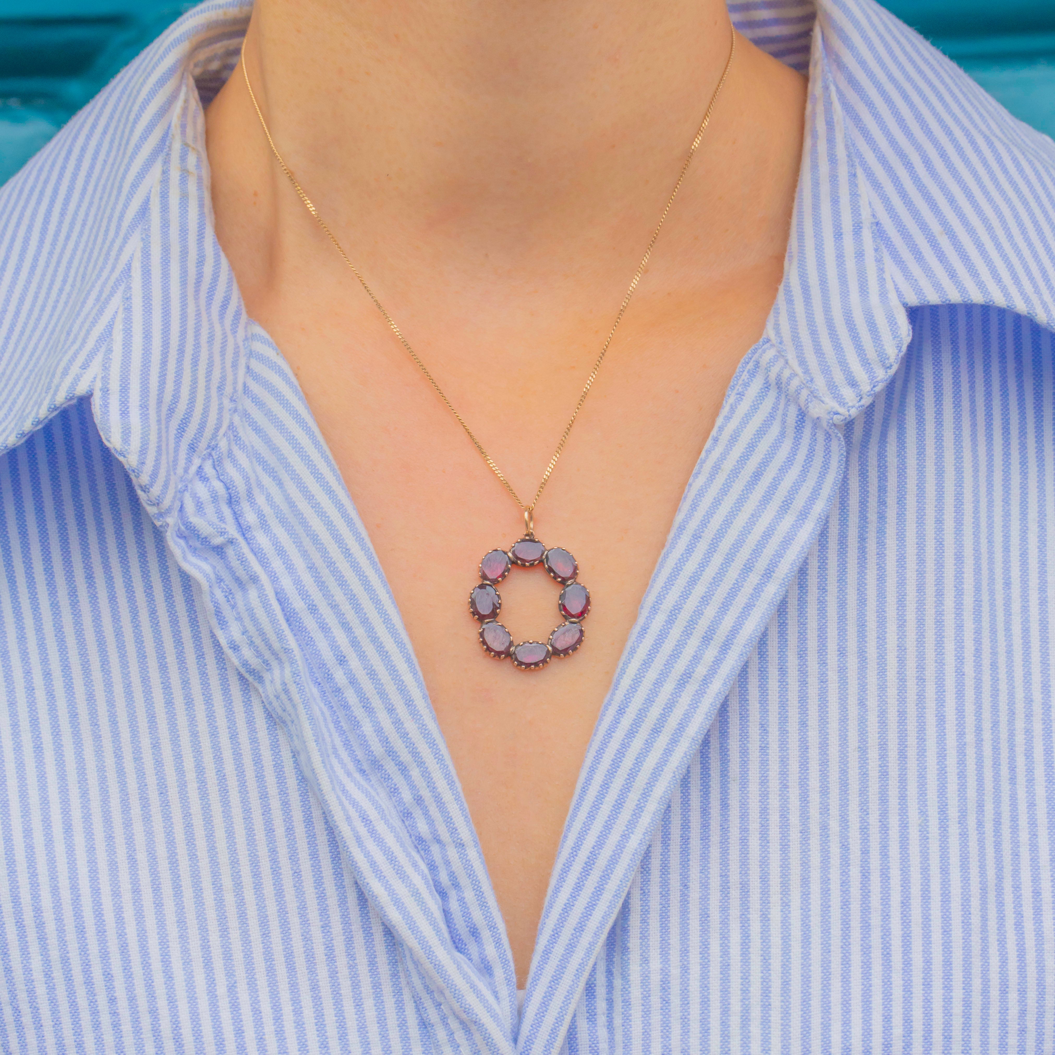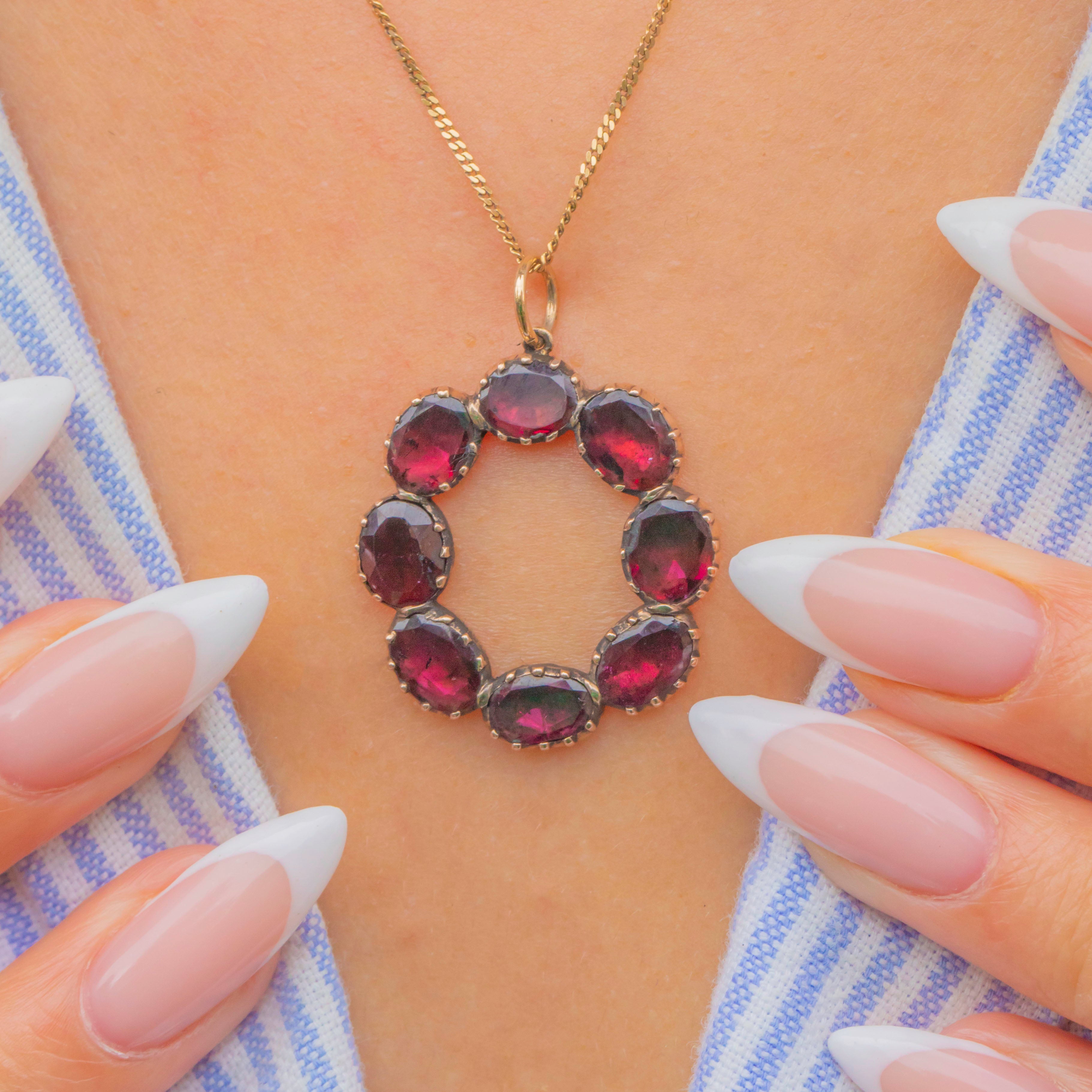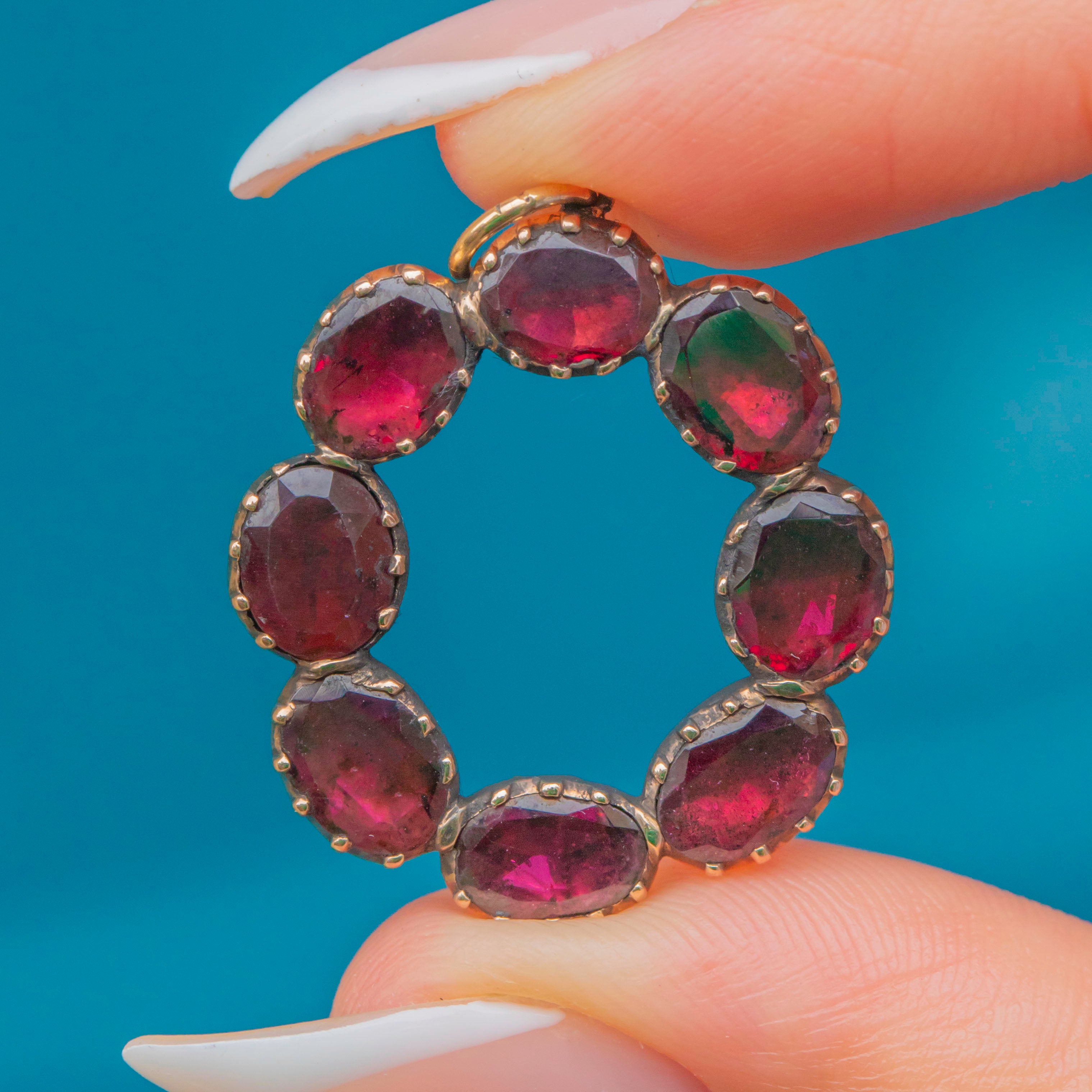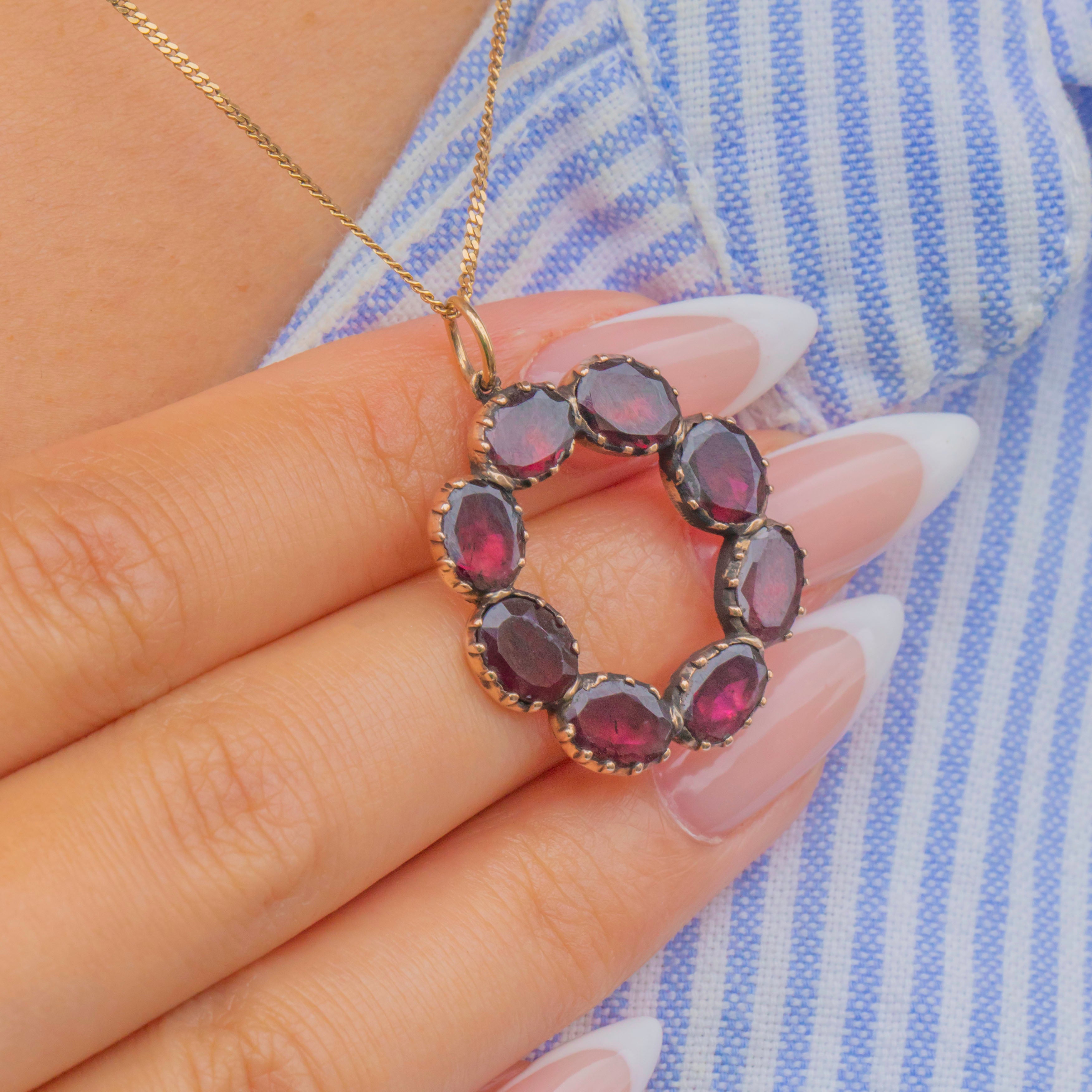 A graceful Georgian wreath pendant crafted from 9ct Gold and set with a ring of eight deep red, flat-cut Garnets. The stones sit in classic closed settings typical of the period, creating a quietly antique silhouette that reads wonderfully modern when worn today. It’s an elegant, wearable piece of history — the kind of pendant that adds instant heritage charm to daytime shirts or a simple evening dress.