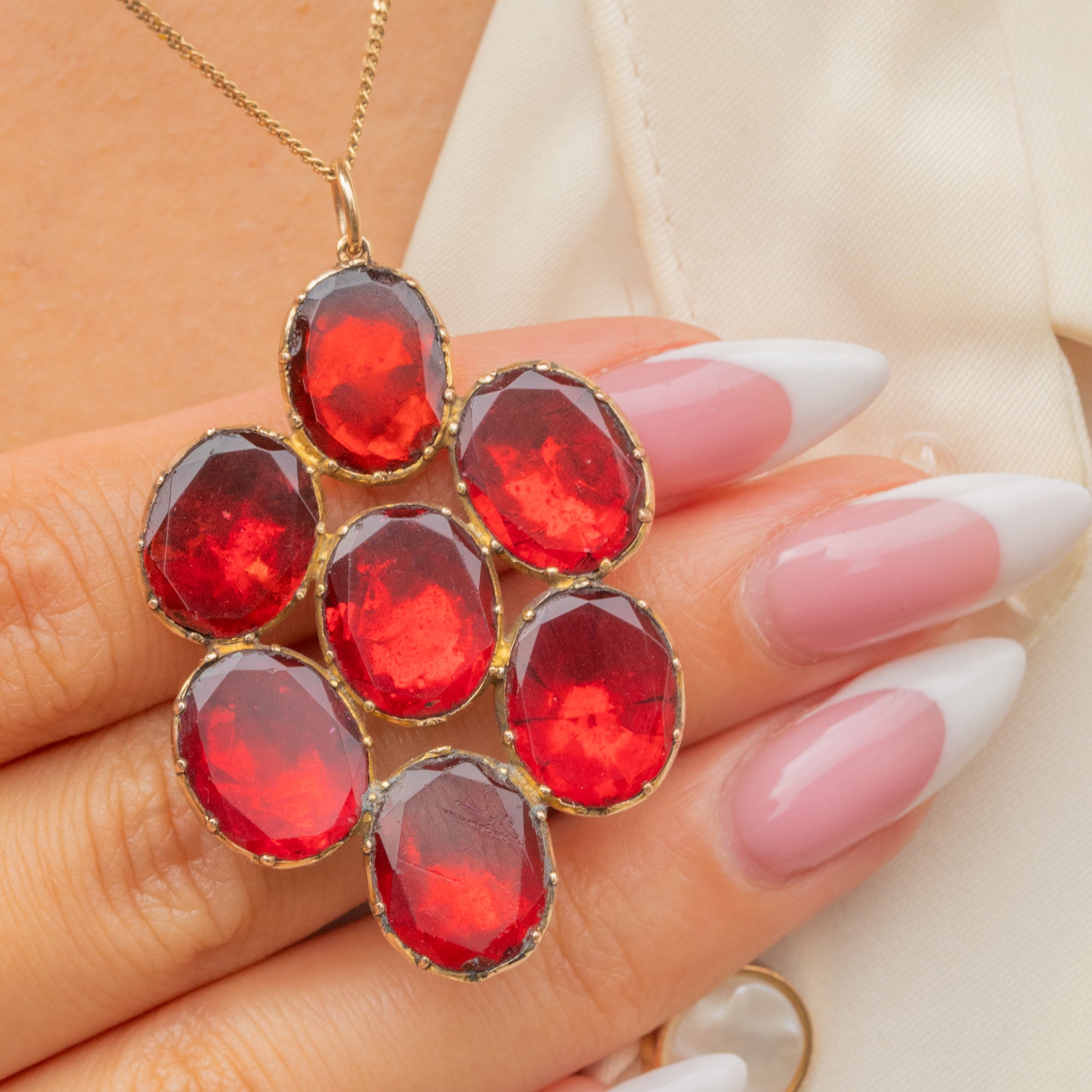 A striking Georgian pendant crafted in warm 9ct Gold, set with rich, foiled Garnet pastes that glow with depth and warmth.