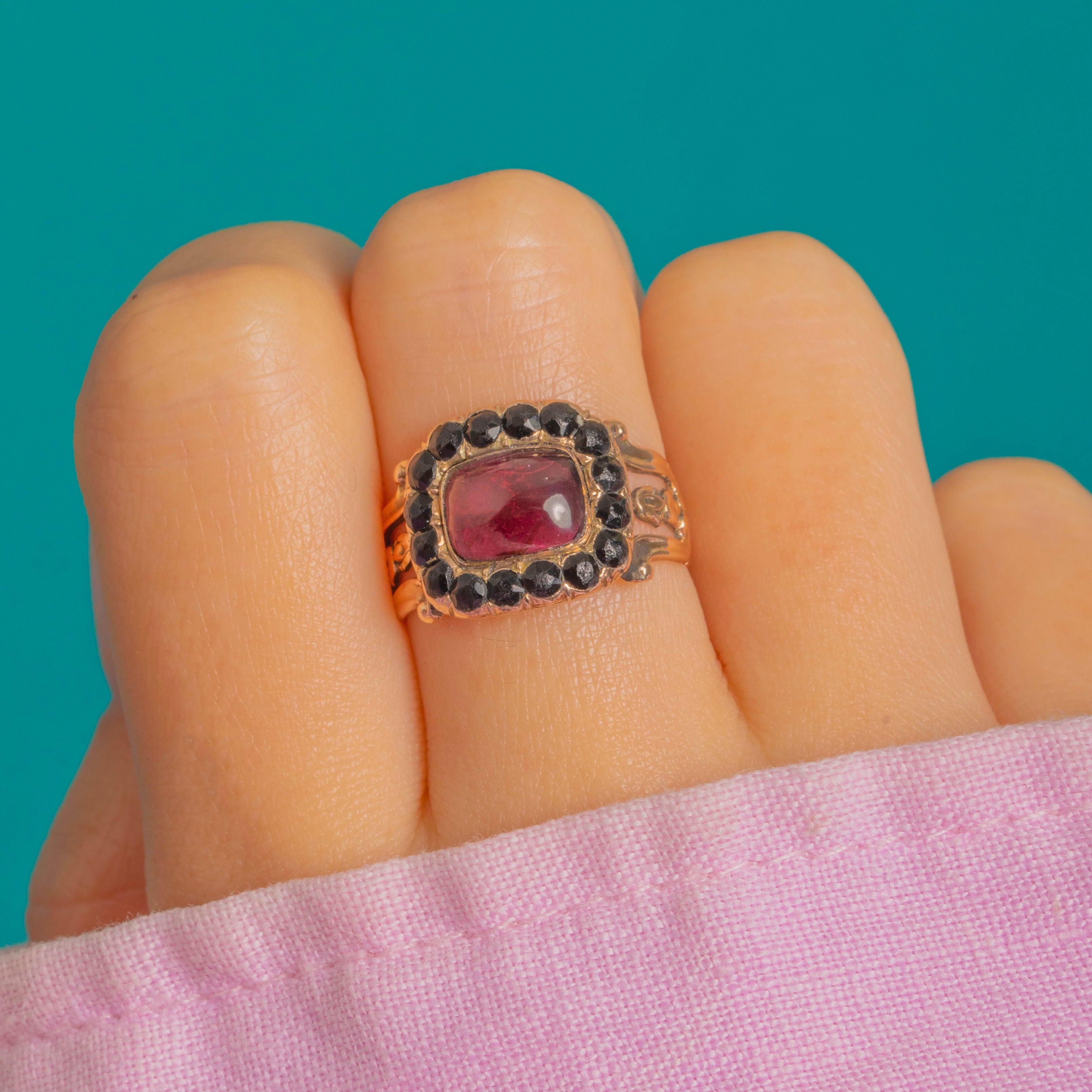Individually piecrust-set round Jet stones encircle the rectangular Garnet, with an inscription on the back reading "And W Gibson died, age 66, 13.Feb.1815". Split scrolled shoulders with subtle pellet details flow into a multi-split shank, creating an ornate yet compact jewel with a low-to-mid profile—beautifully wearable and richly evocative of Georgian craftsmanship.