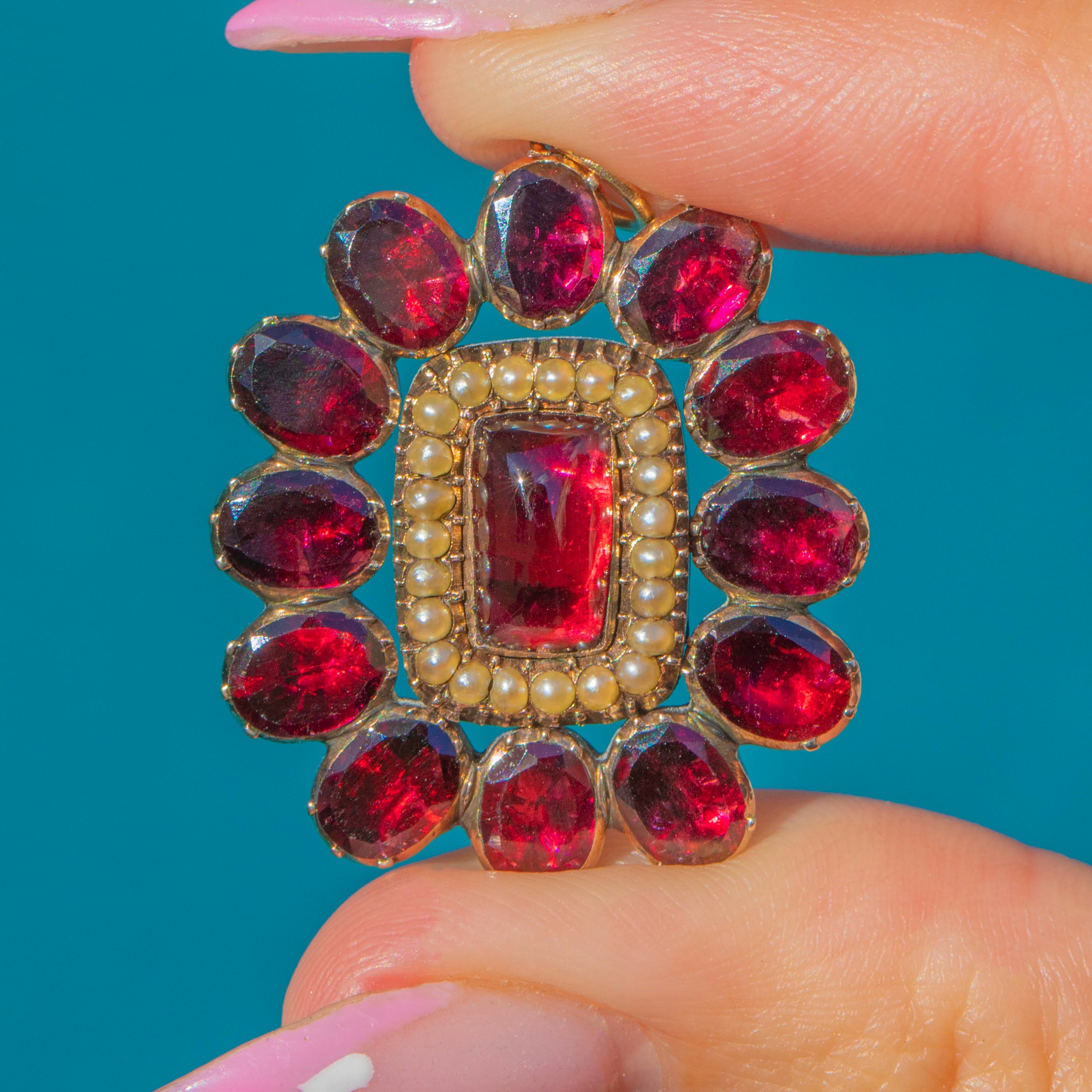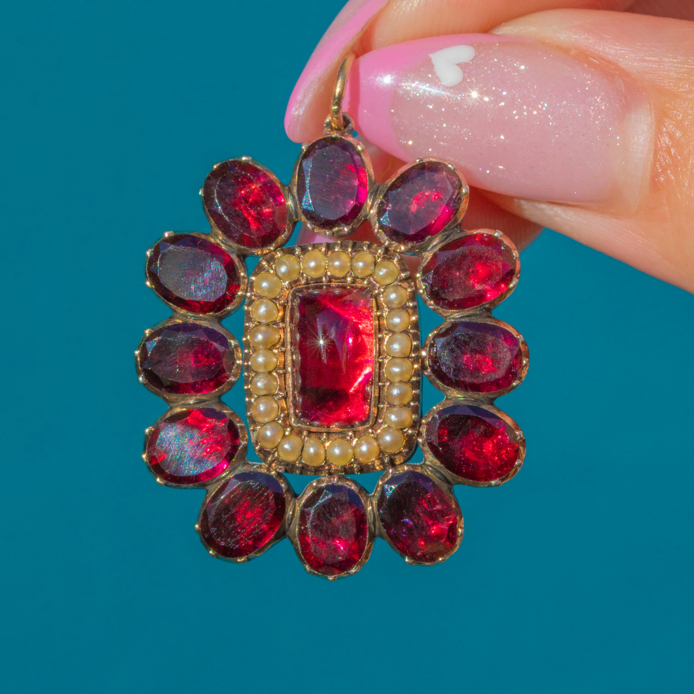 A magnificent Georgian pendant in 9ct Gold, adorned with rich red Flat-Cut Garnets and creamy natural Pearls. The deep crimson tones of the Garnets glow beautifully against the antique gold, their flat-cut facets and foiled backs displaying that unmistakable Georgian shimmer.