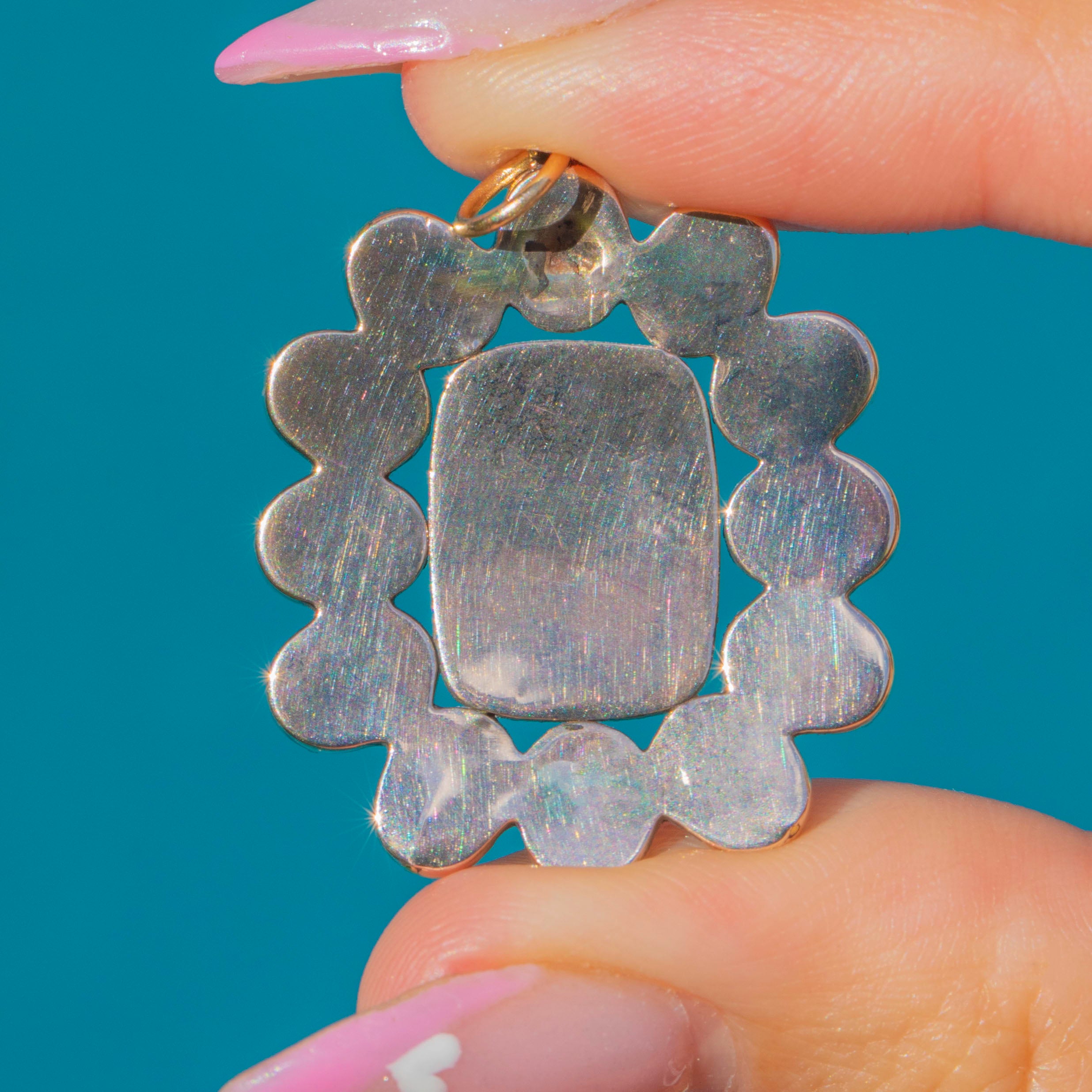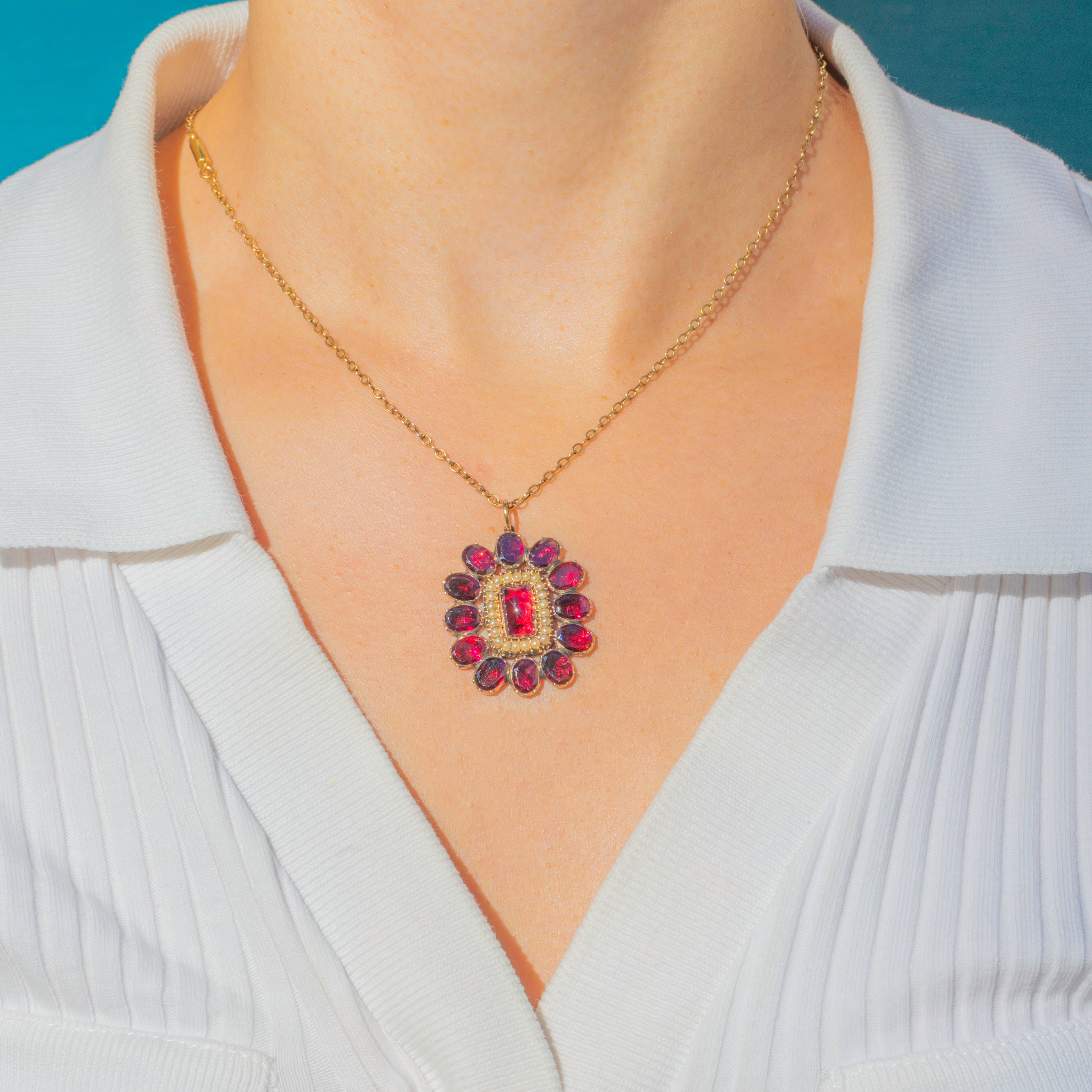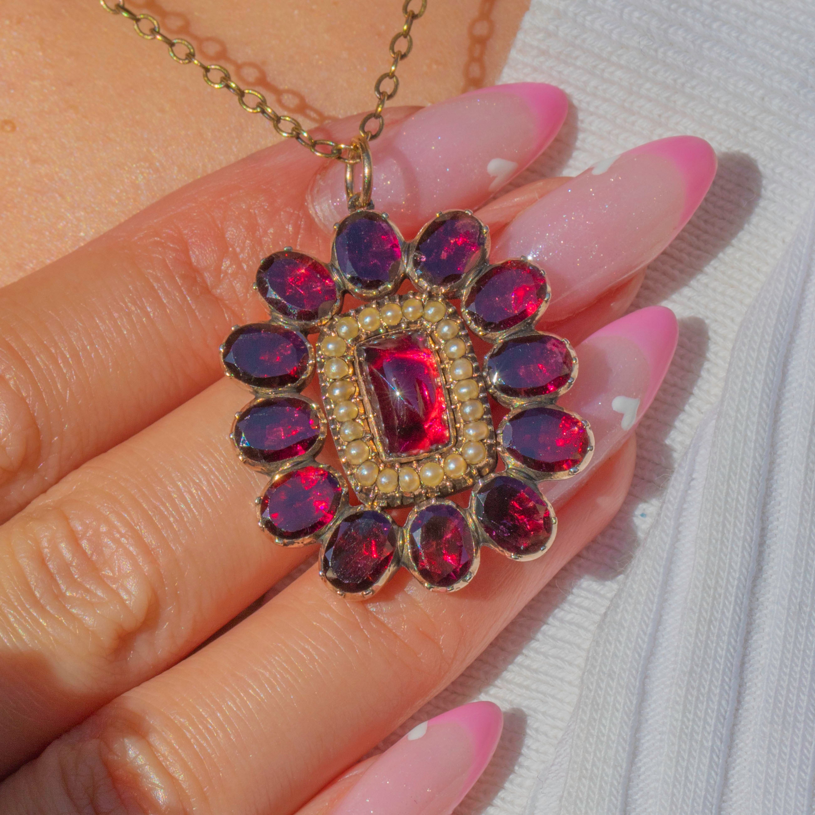The central cabochon Garnet adds depth and dimension, surrounded by a halo of smaller Garnets and Pearls in a classic openwork design. Likely converted from a larger Georgian jewel, this pendant retains all the charm and craftsmanship of its era, now reimagined as a striking standalone piece.